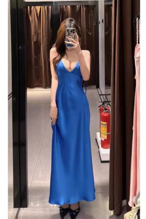Blue French Silky Satin Halter Spaghetti Straps Dress