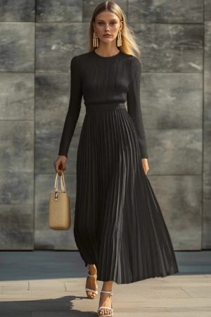 Elegant Casual And Comfortable Long-sleeve Satin Knit Pleated Maxi Dress
