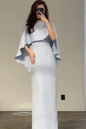 Light Blue Satin Bat Shawl Waist-controlled Long Sleeves Dress