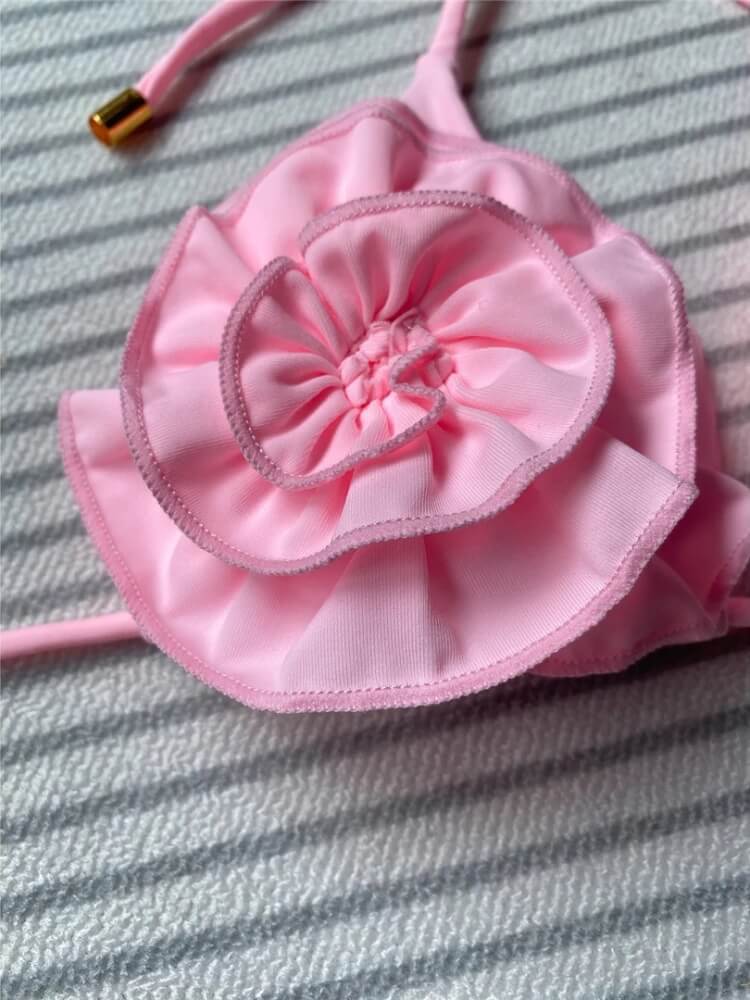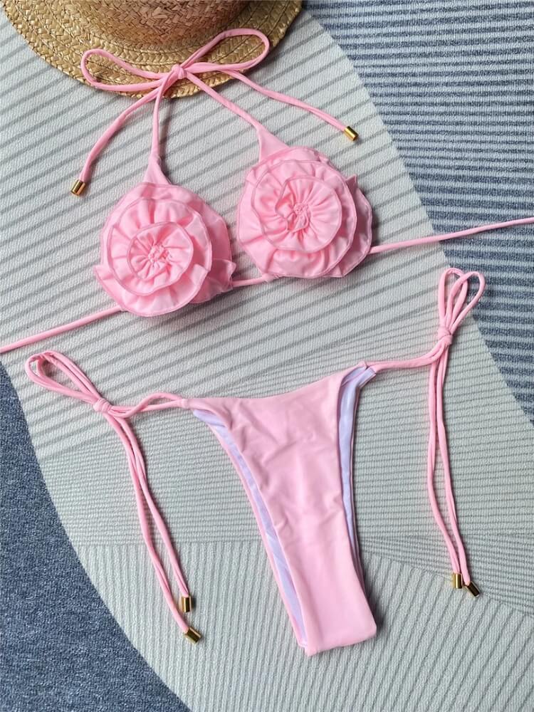 The 3D Flower Bikini Set is designed as a two piece swim set featuring a triangle bikini top detailed with oversized 3D flower appliqués that create a bold, textured focal point. The halter neck and back ties allow adjustable support and a customizable fit. The matching bikini bottom includes slim tie sides and a high cut leg that defines the waistline and elongates the silhouette. Crafted from stretch swim fabric, this bikini set balances statement detailing with flexible comfort for beachwear and poolside styling.