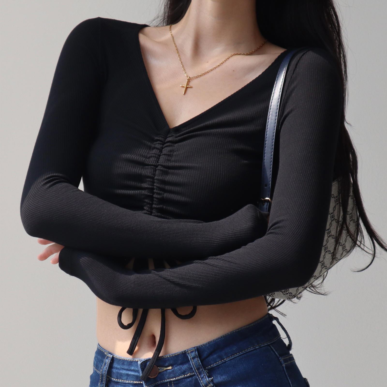 Elevate your wardrobe with our American Retro Sexy V-Neck Long Sleeve Cropped T-Shirt, designed to accentuate your figure with its slim-fit, high-waisted style. The trendy drawstring detail adds versatility to your look, making it perfect for pairing with your favorite jeans or skirts. Embrace the Y2K fashion revival and make a statement wherever you go add this must-have piece to your cart today!