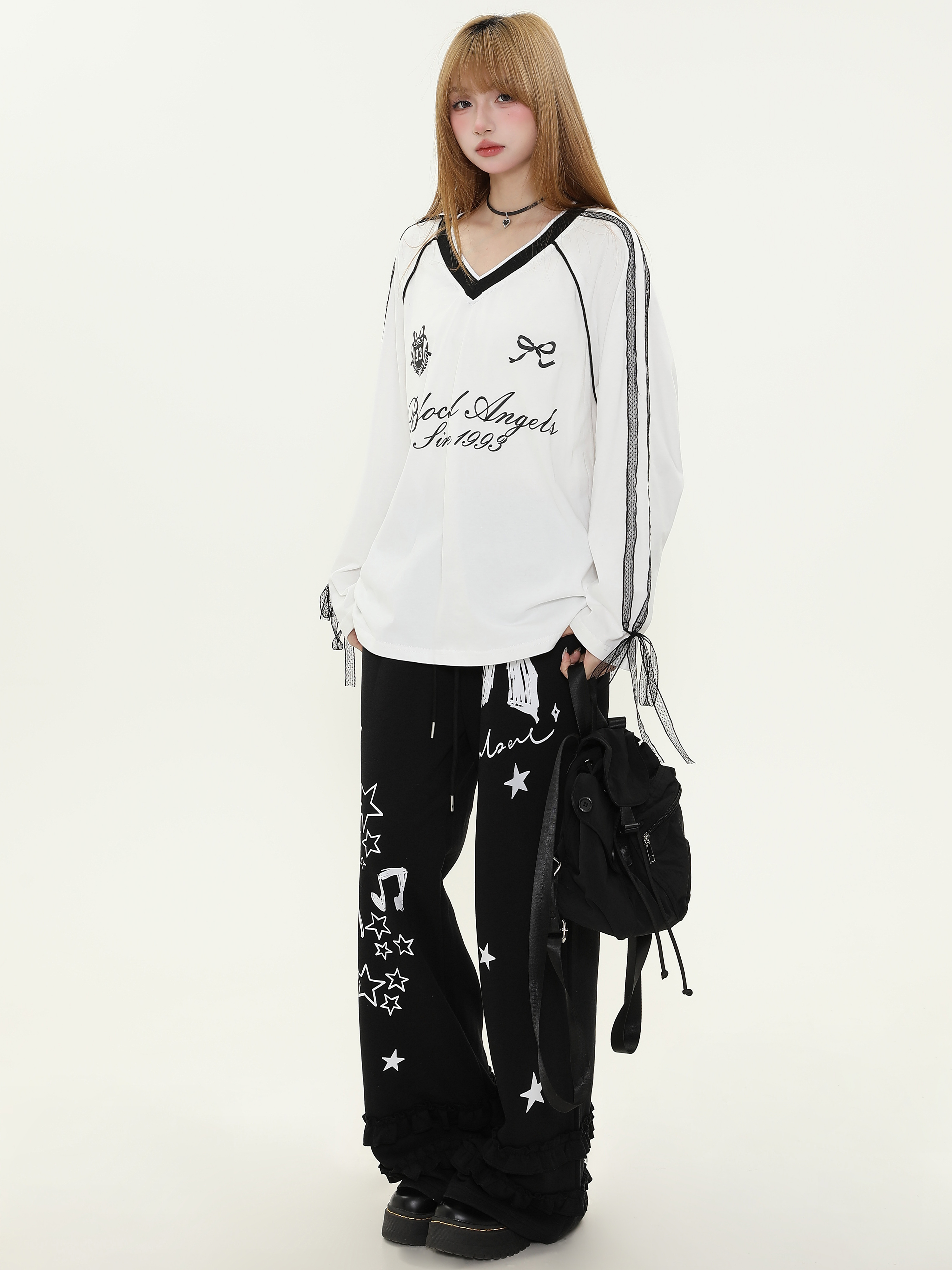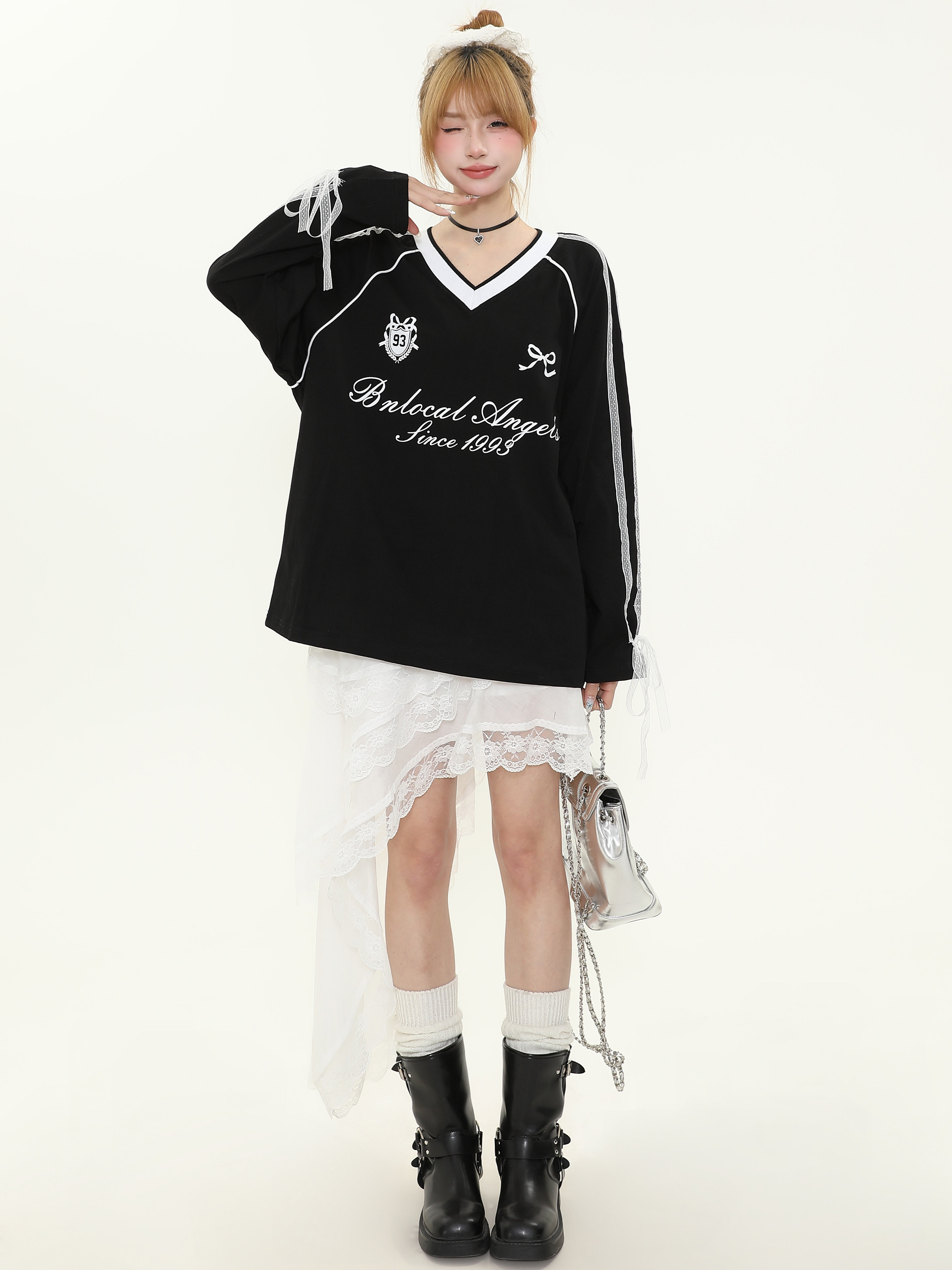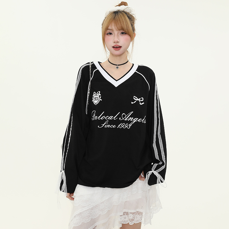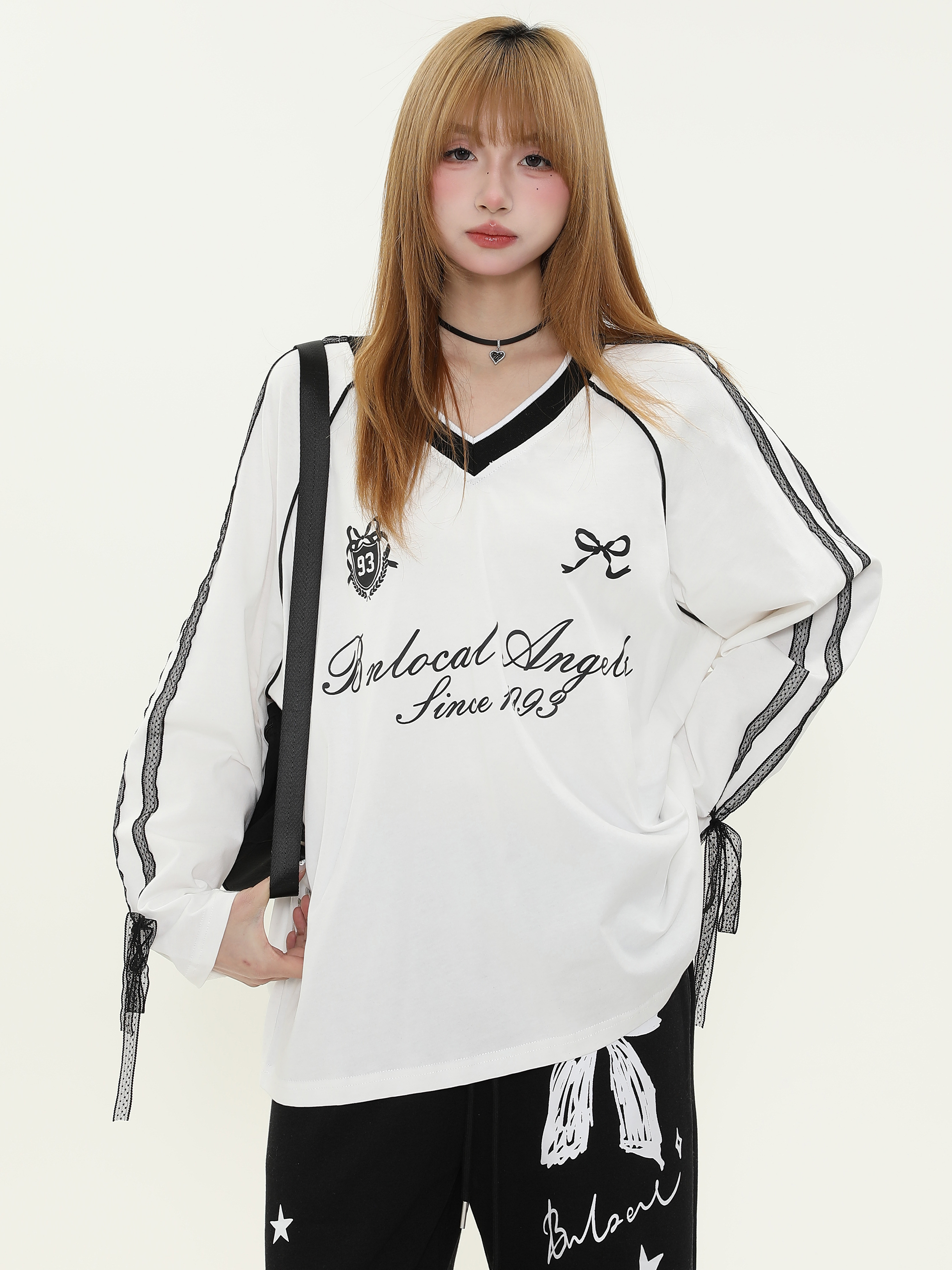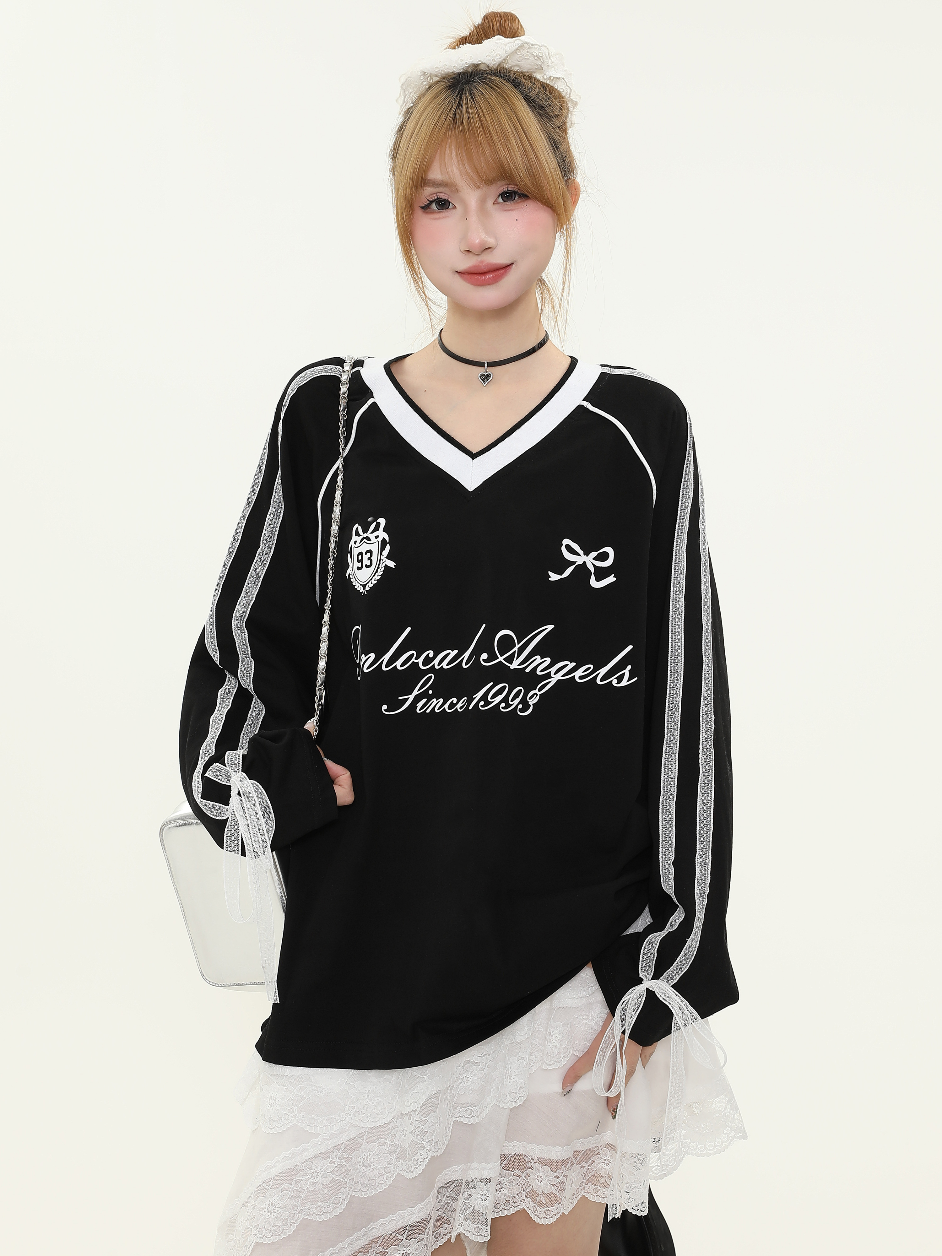 Elevate your spring wardrobe with our American Style Lace Splicing V-Neck Long Sleeve T-Shirt for Women, a chic piece that embodies 90s sports jersey inspiration. This stylish top features a flattering V-neckline and intricate lace splicing details, offering a perfect blend of comfort and contemporary fashion. Designed for a relaxed fit, it’s ideal for layering or wearing solo, making it a versatile addition to any outfit. Don’t miss out on this trendy staple add it to your cart today and embrace effortless style!