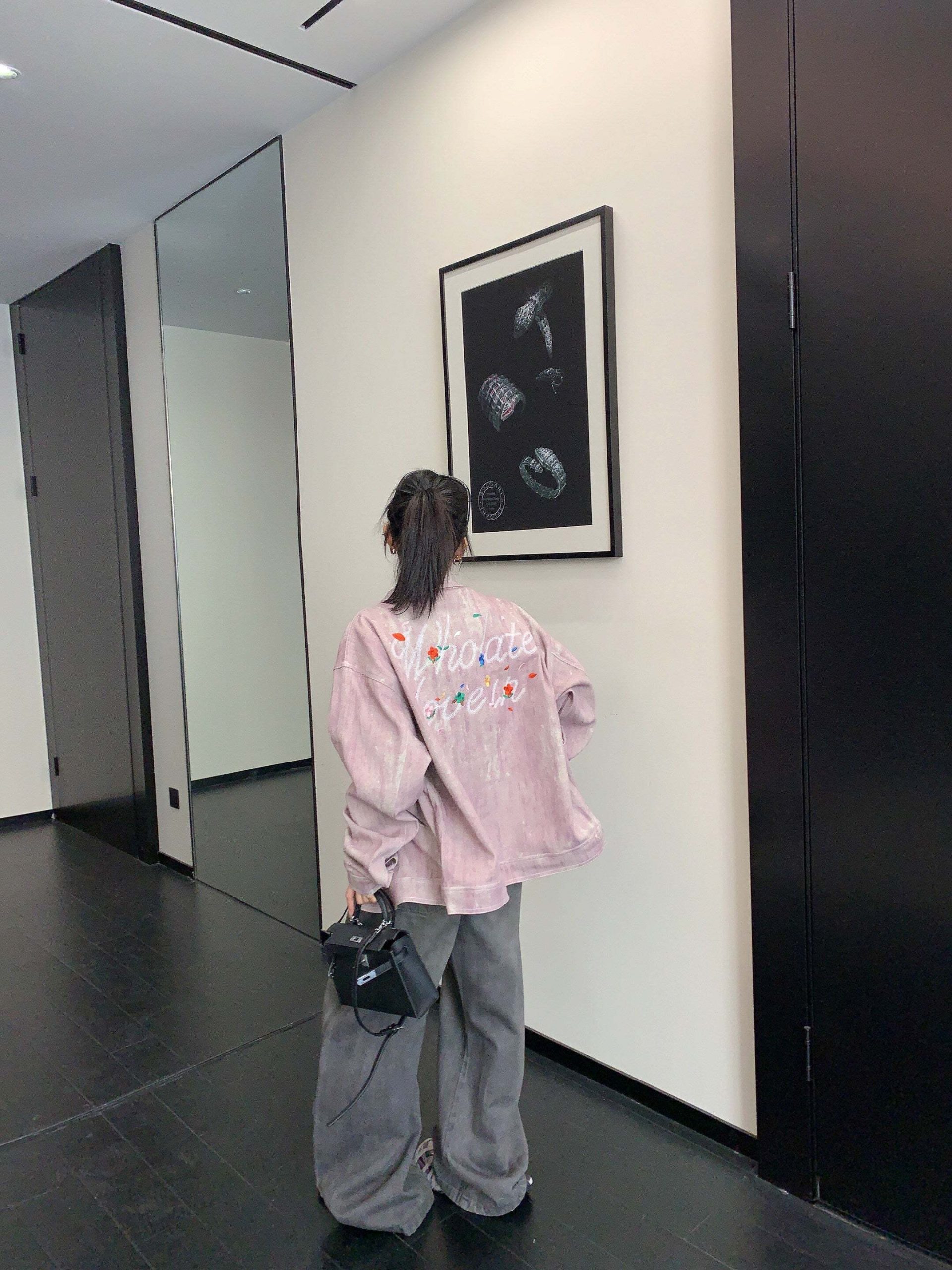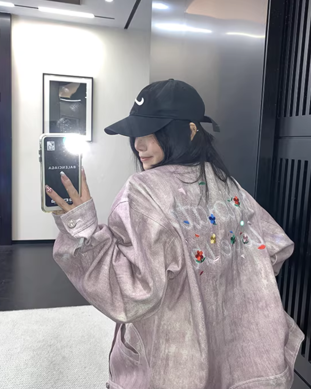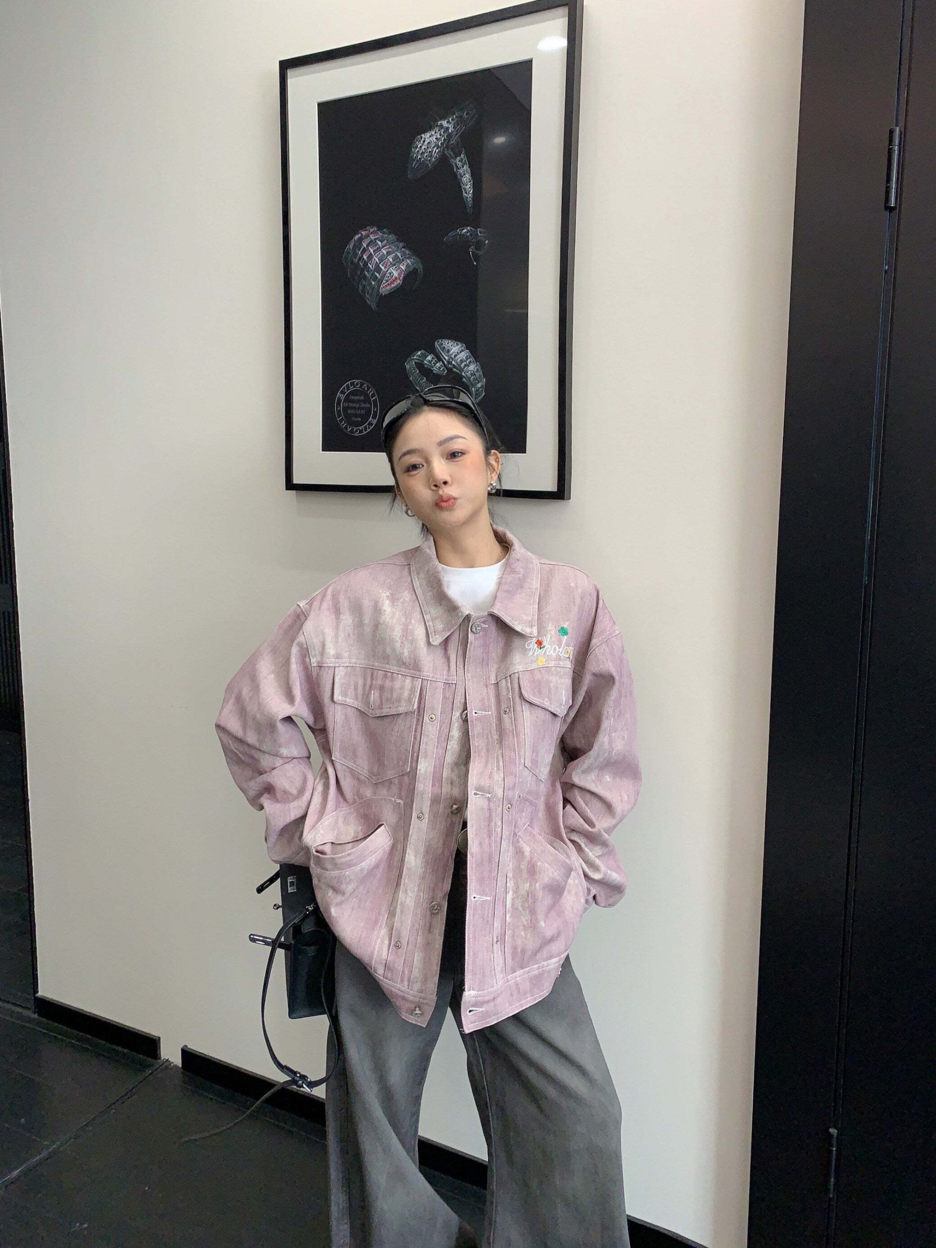 The denim jacket with a boldly designed logo on the back is a point of interest.