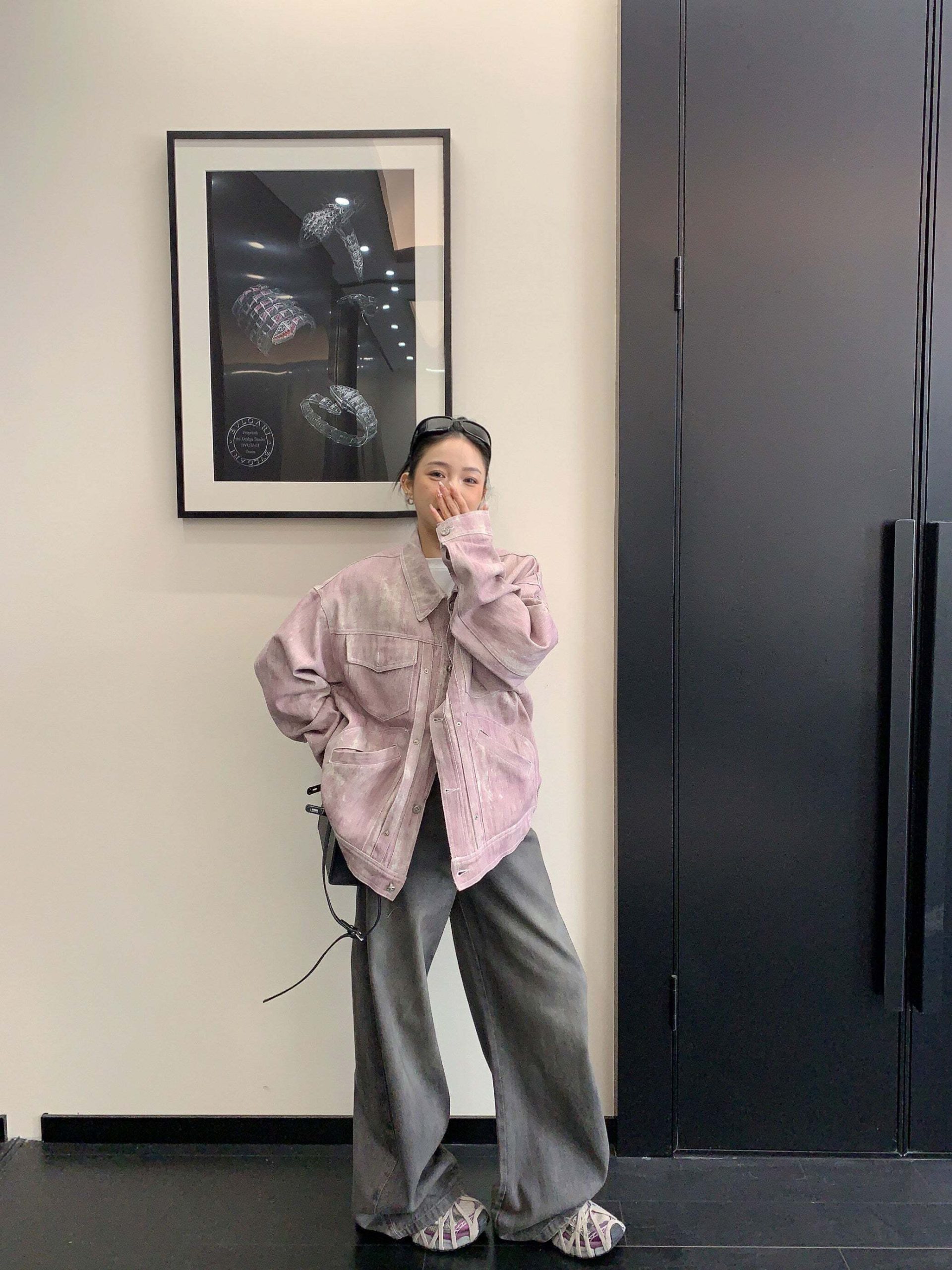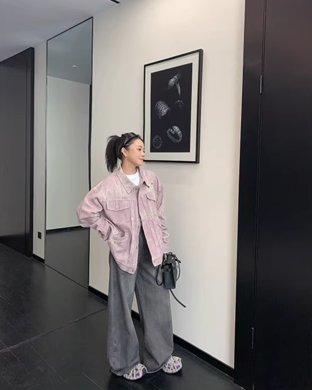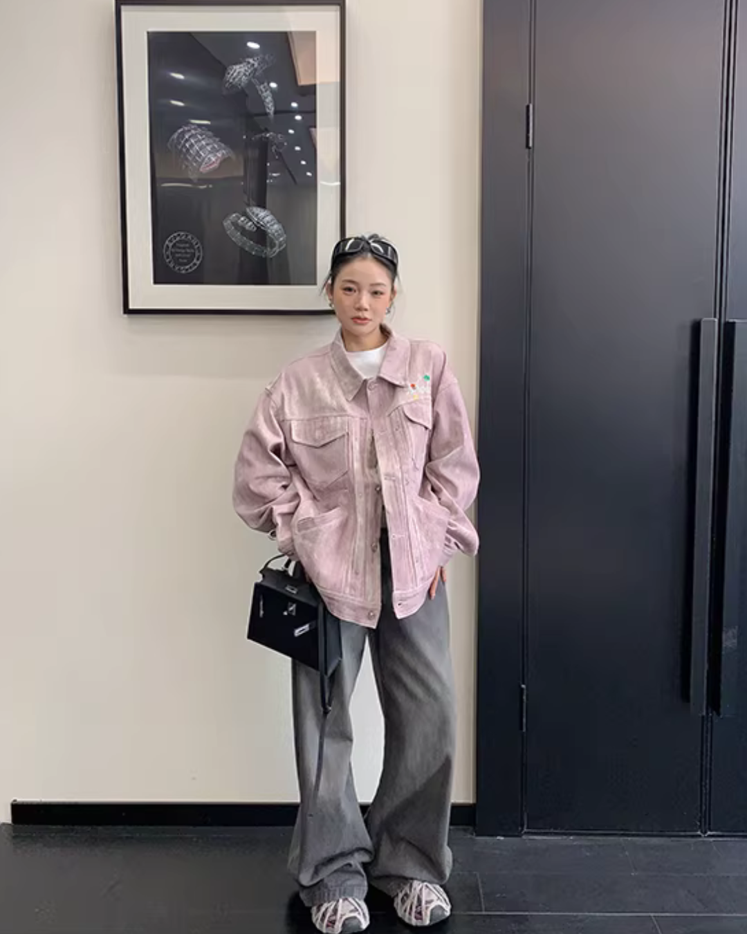 The denim jacket with a boldly designed logo on the back is a point of interest.