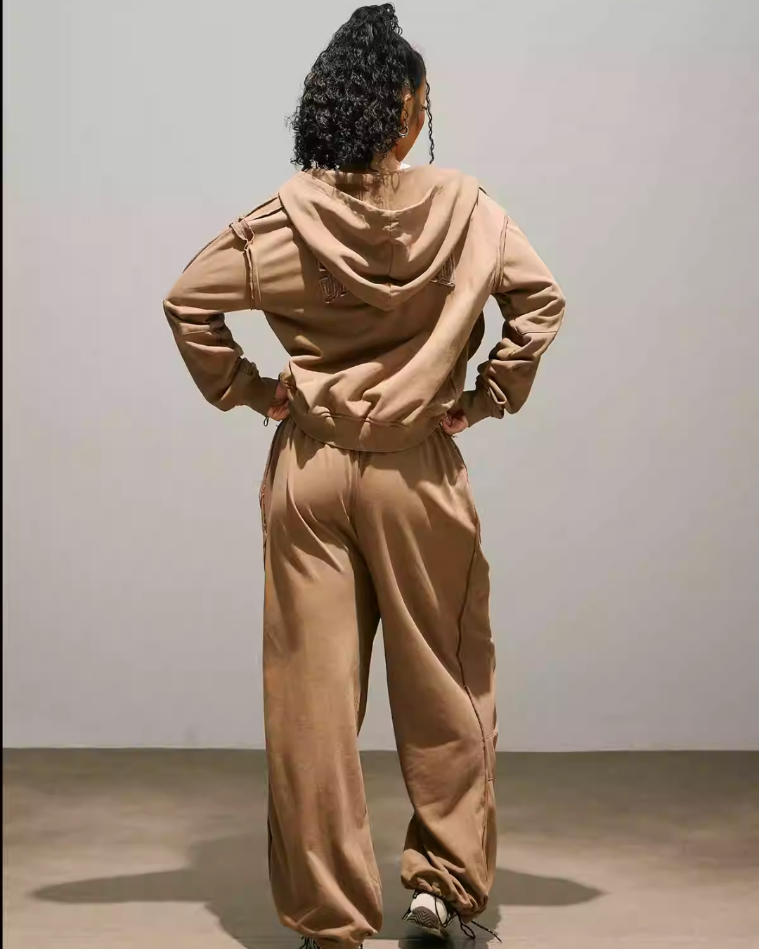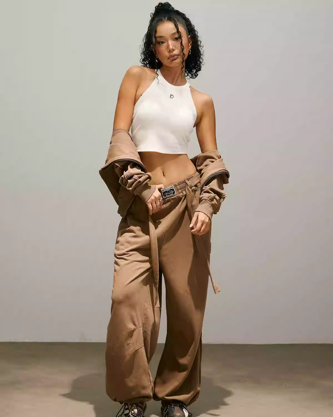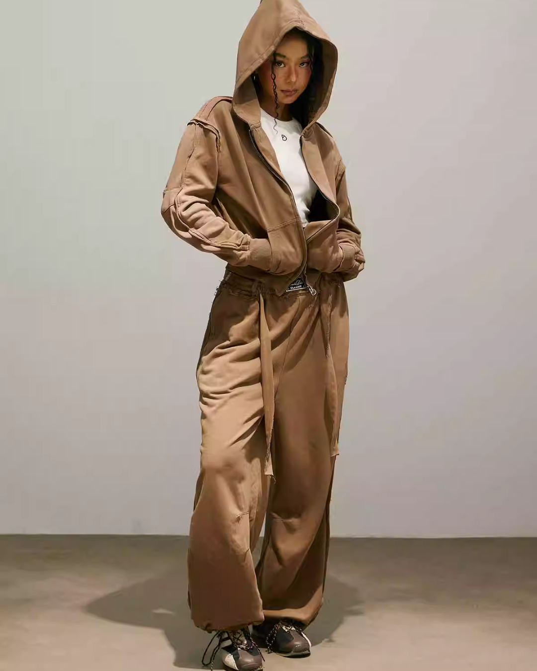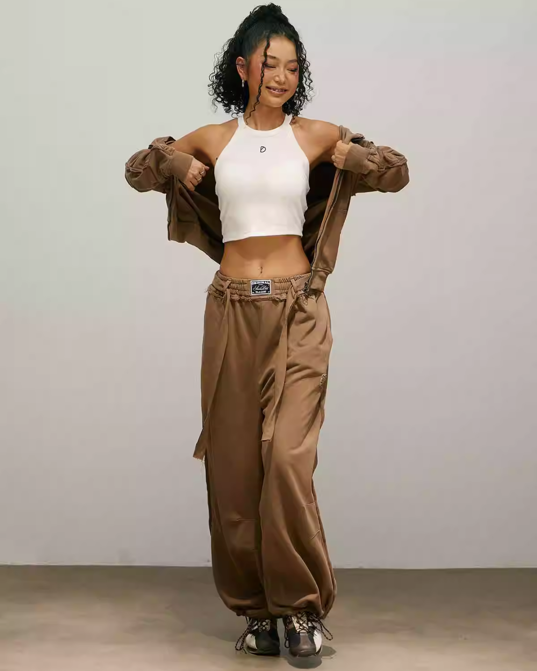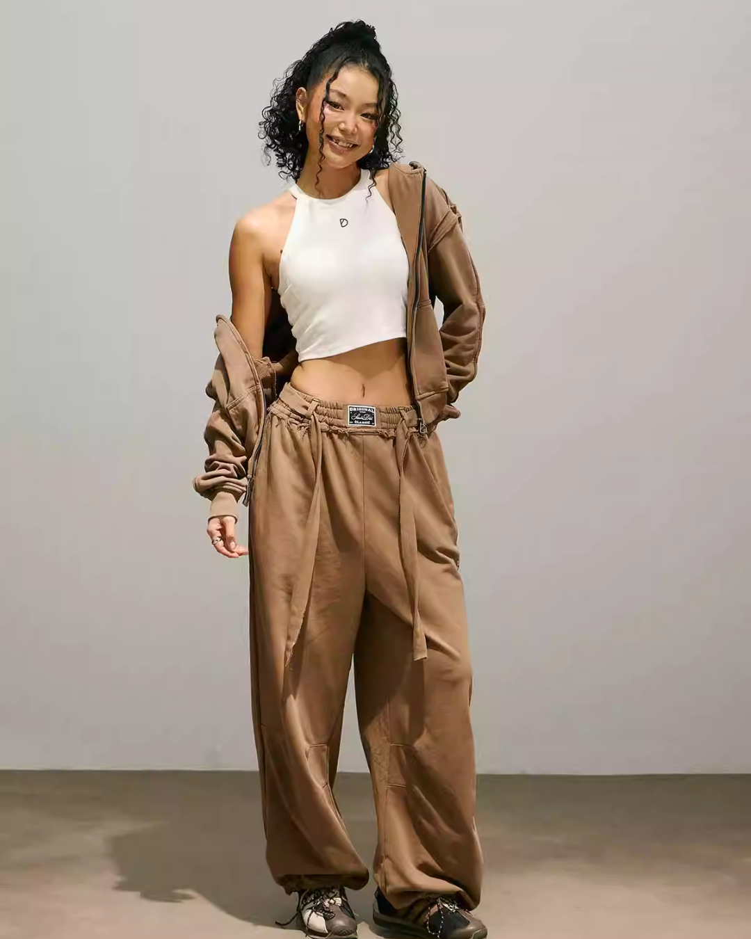 The hem of the pants is designed with a drawstring, allowing for silhouette adjustments according to your mood.