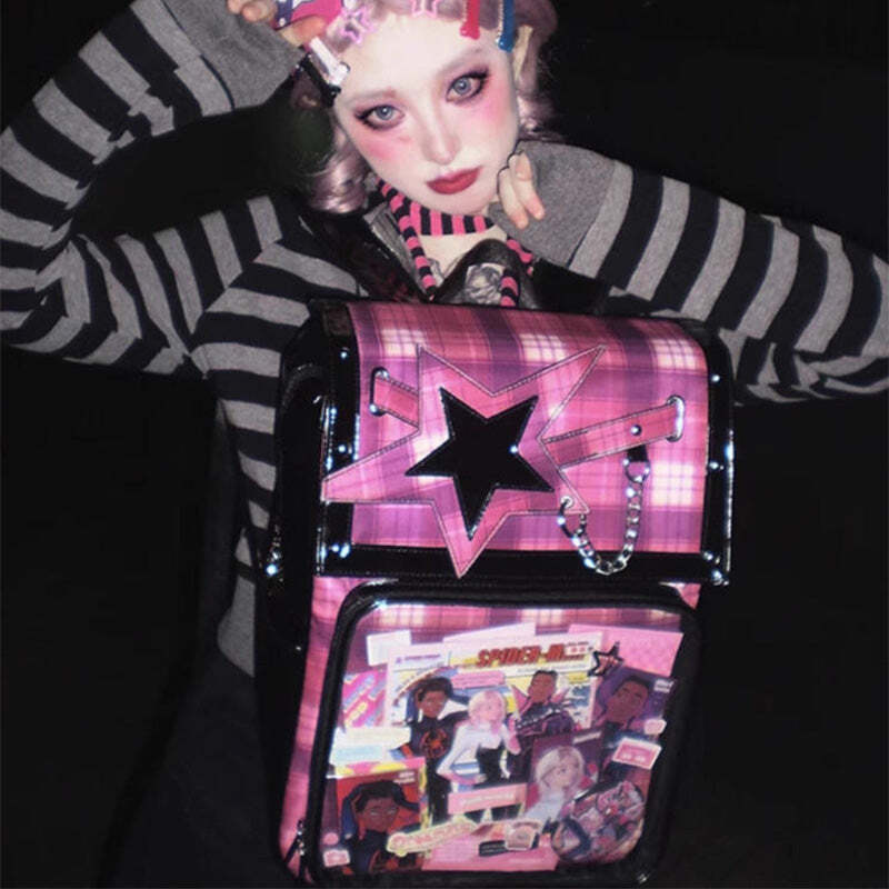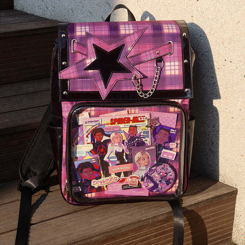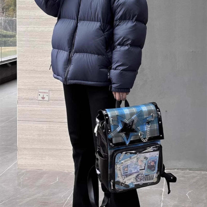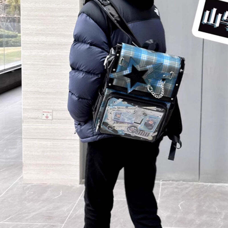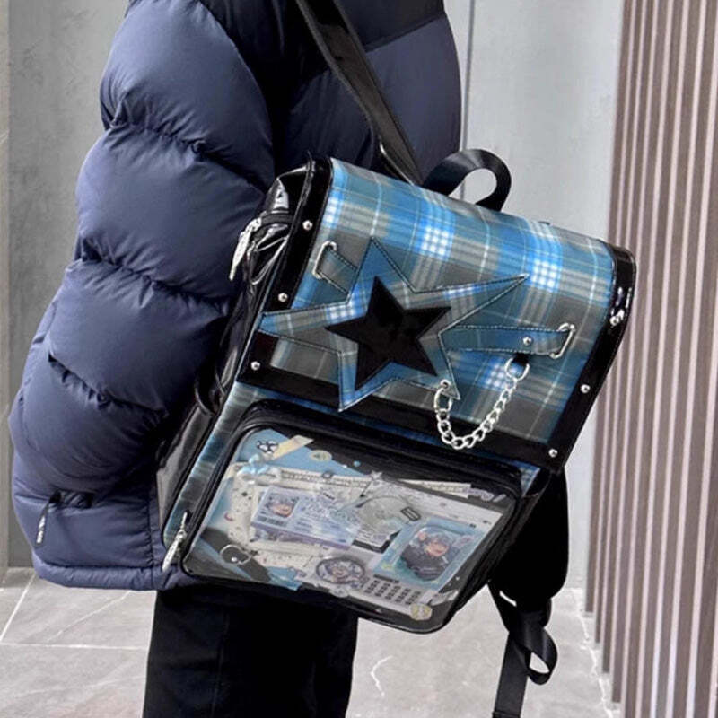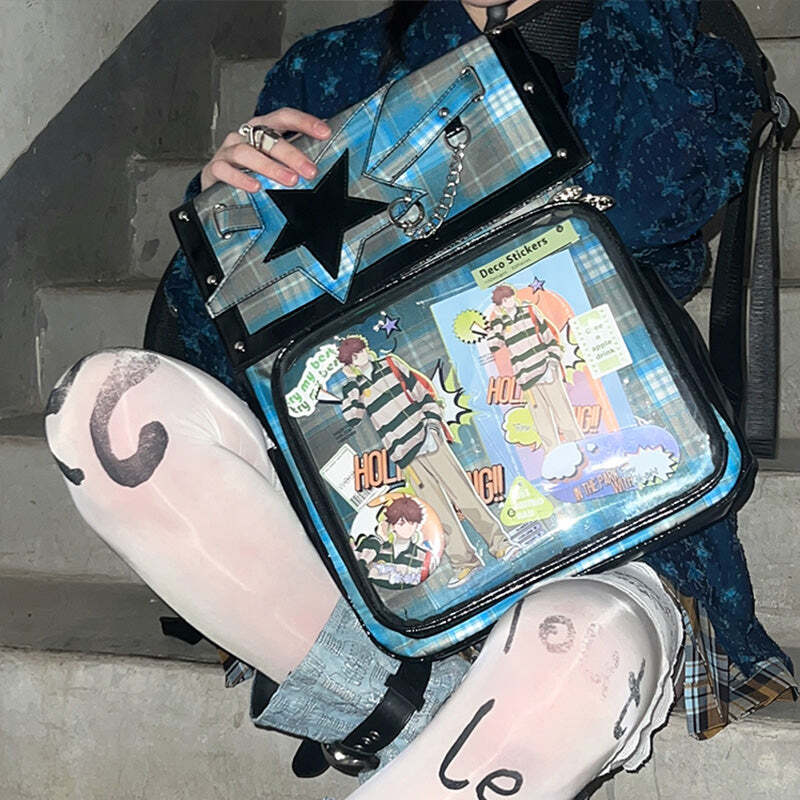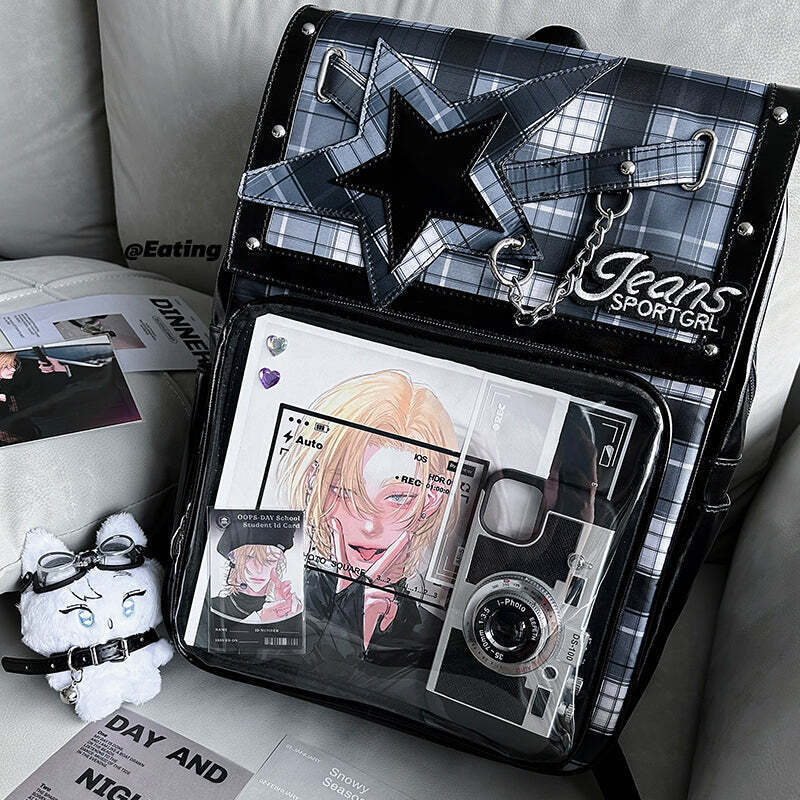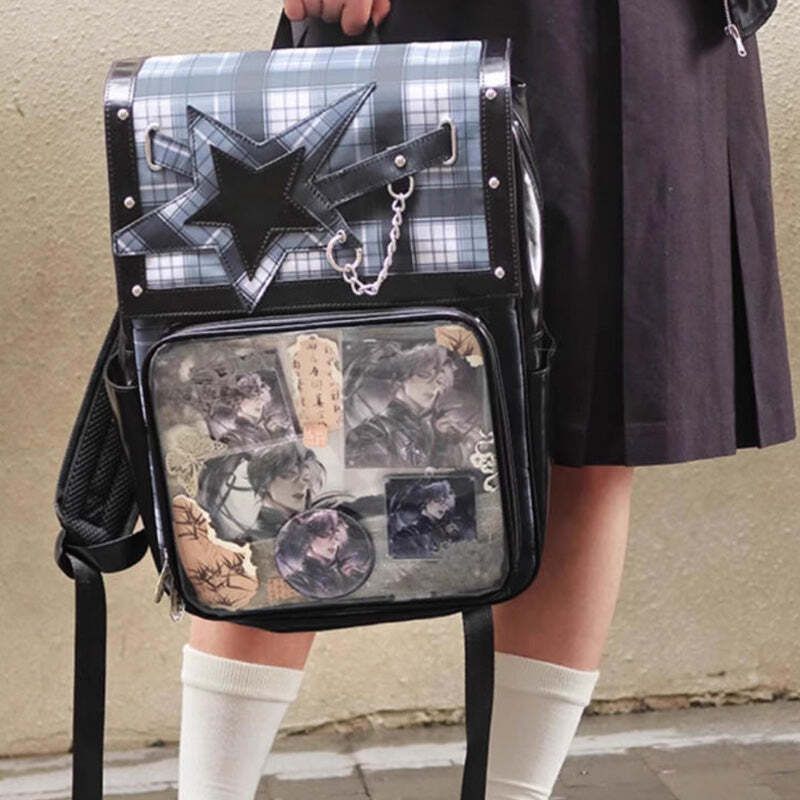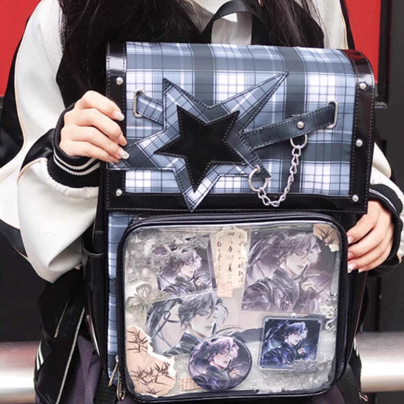 - This large-capacity student ita backpack features a stylish star design and is perfect for displaying pins, badges, and other anime collectibles. Made with durable laminated nylon and PVC, it’s ideal for school, conventions, or everyday use. The spacious transparent window and insert make it easy to showcase your favorite items while keeping your essentials organized.