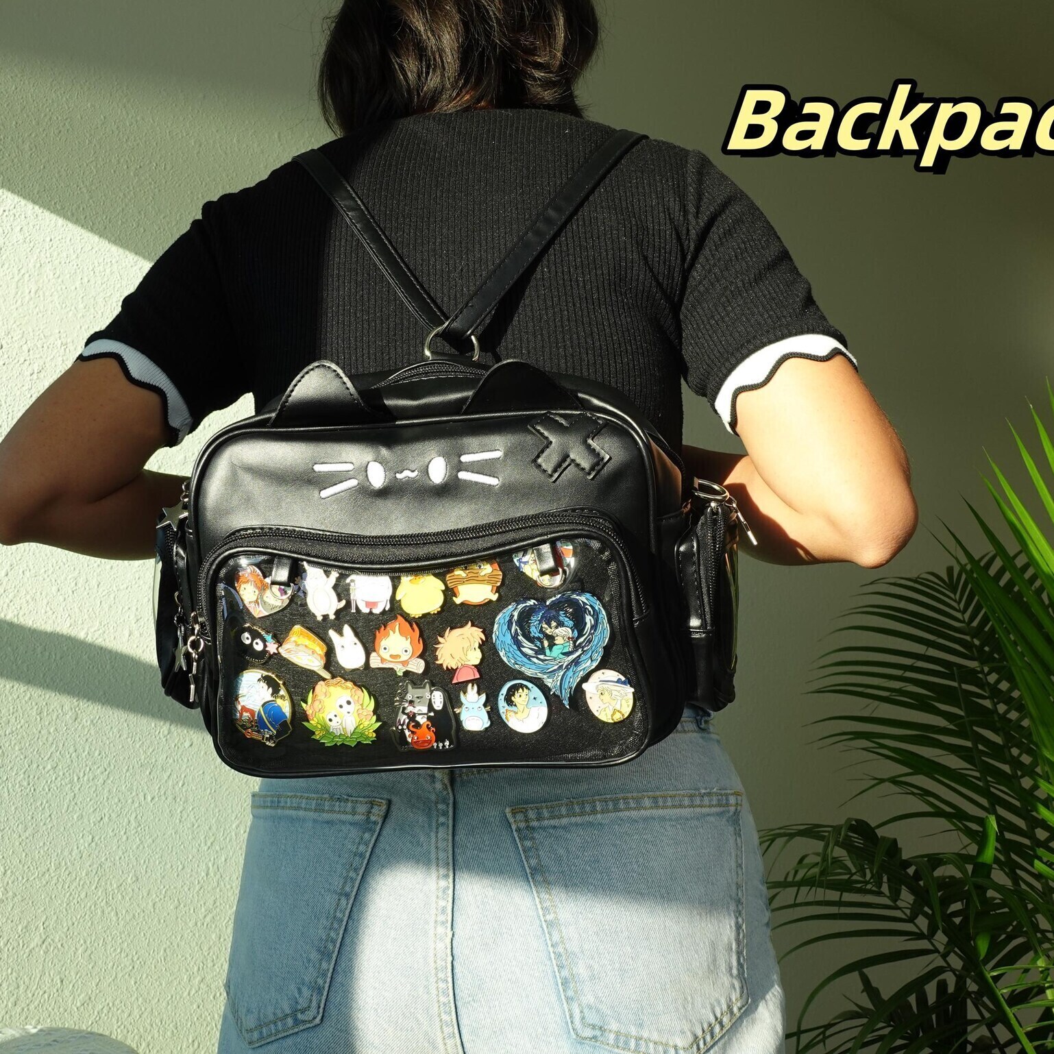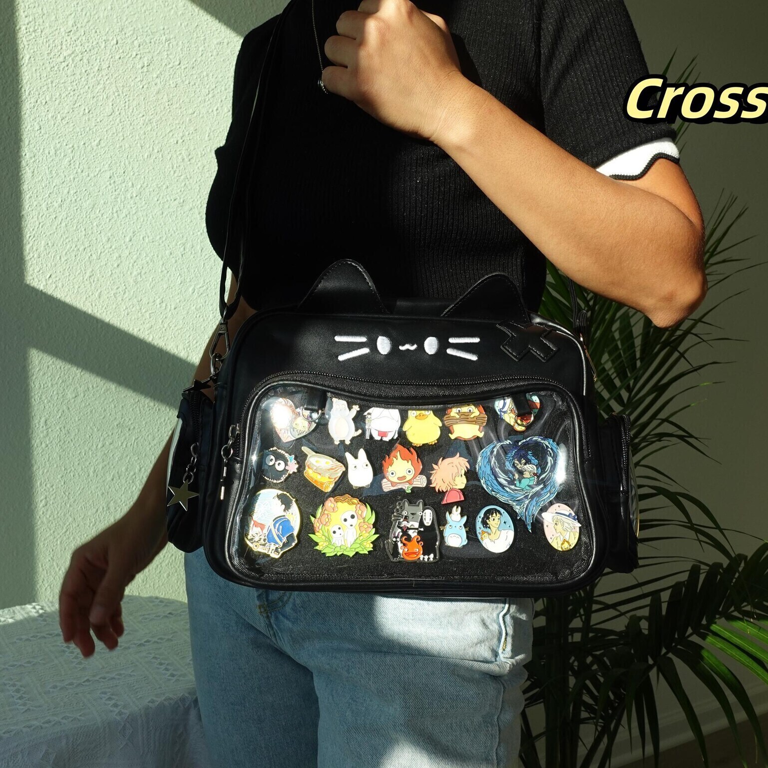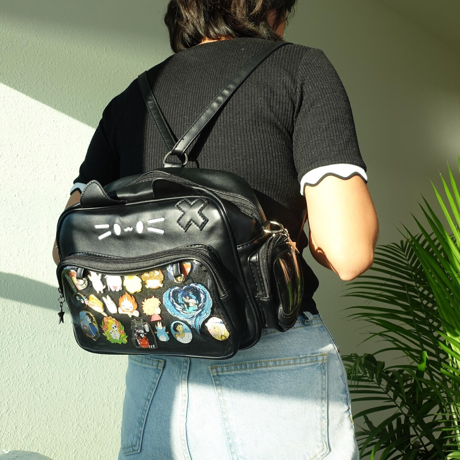 Black Kawaii Cat Convertible Ita Bag with Clear Window for Pin Display combines everyday carry with a clear display area for pins, badges, charms, or character merch.