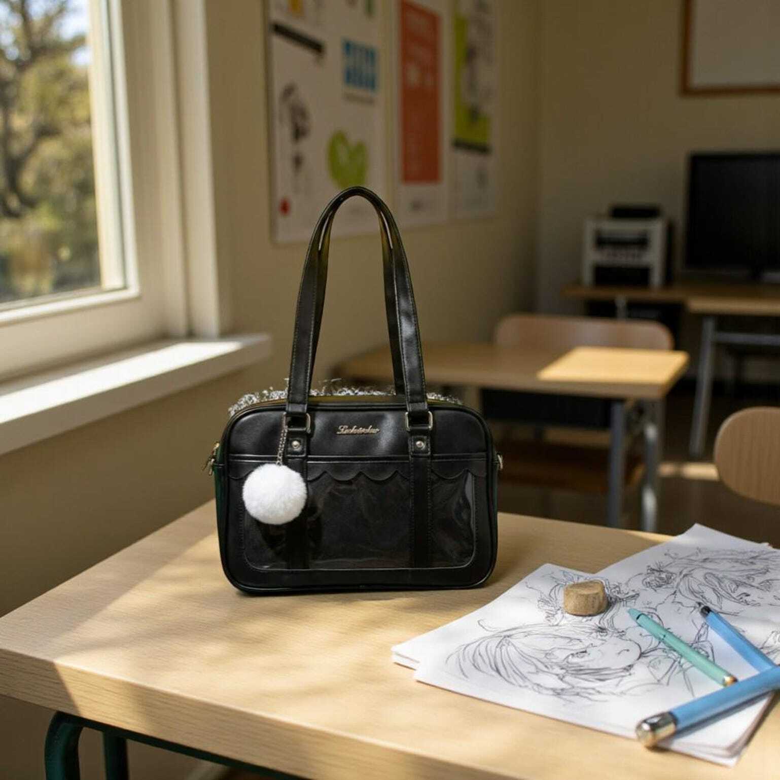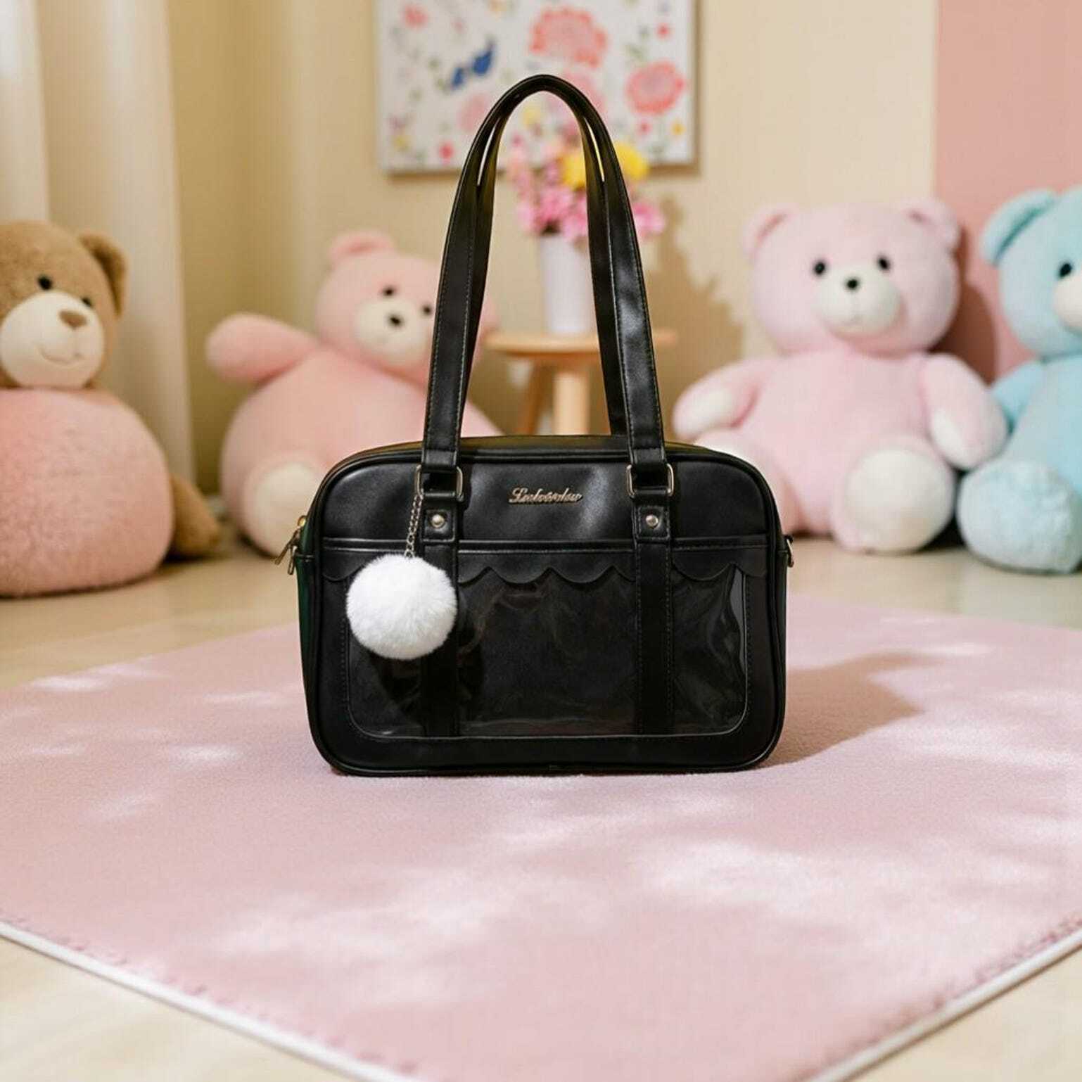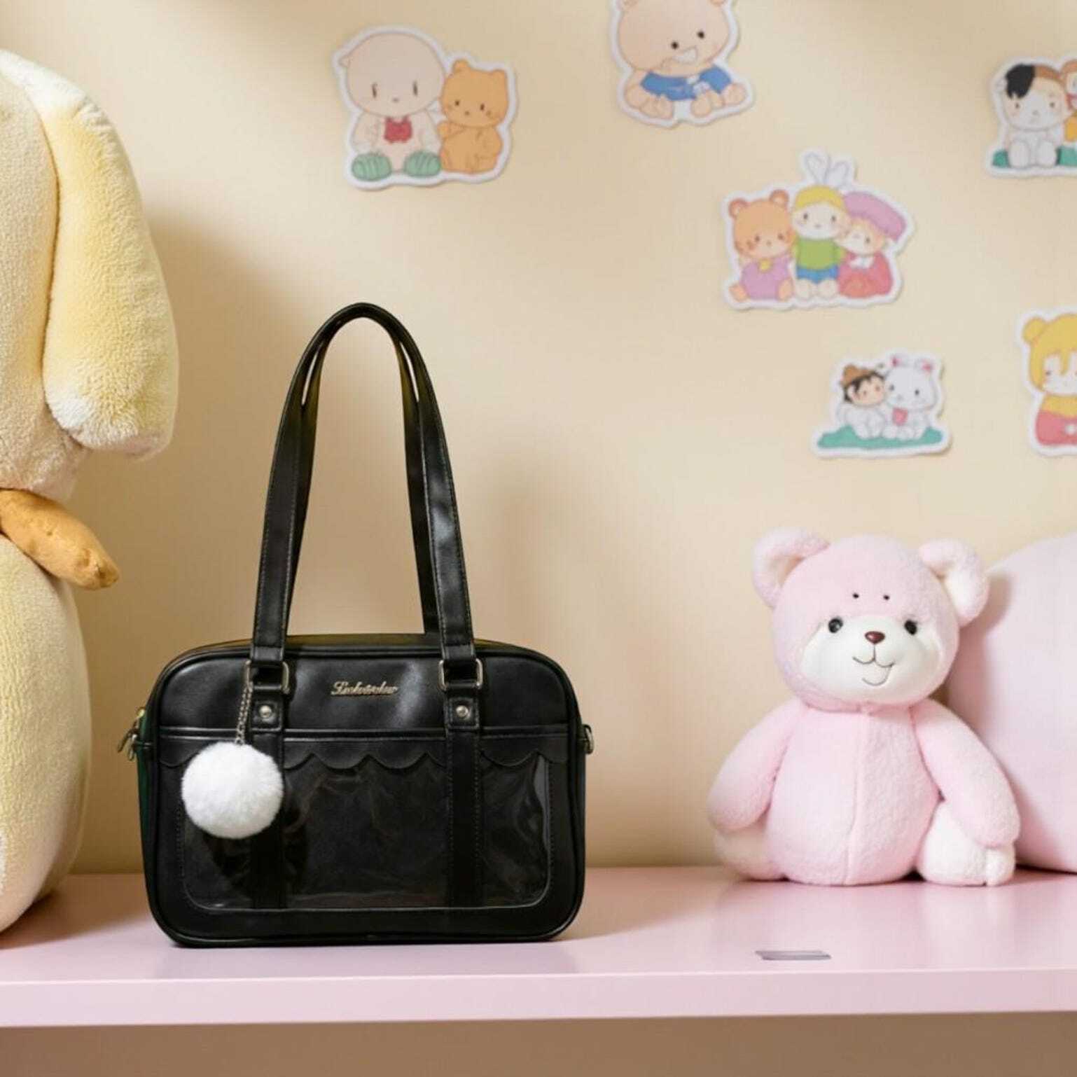 Black Kawaii Convertible Ita Bag with Clear Window for Pin Display combines everyday carry with a clear display area for pins, badges, charms, or character merch.