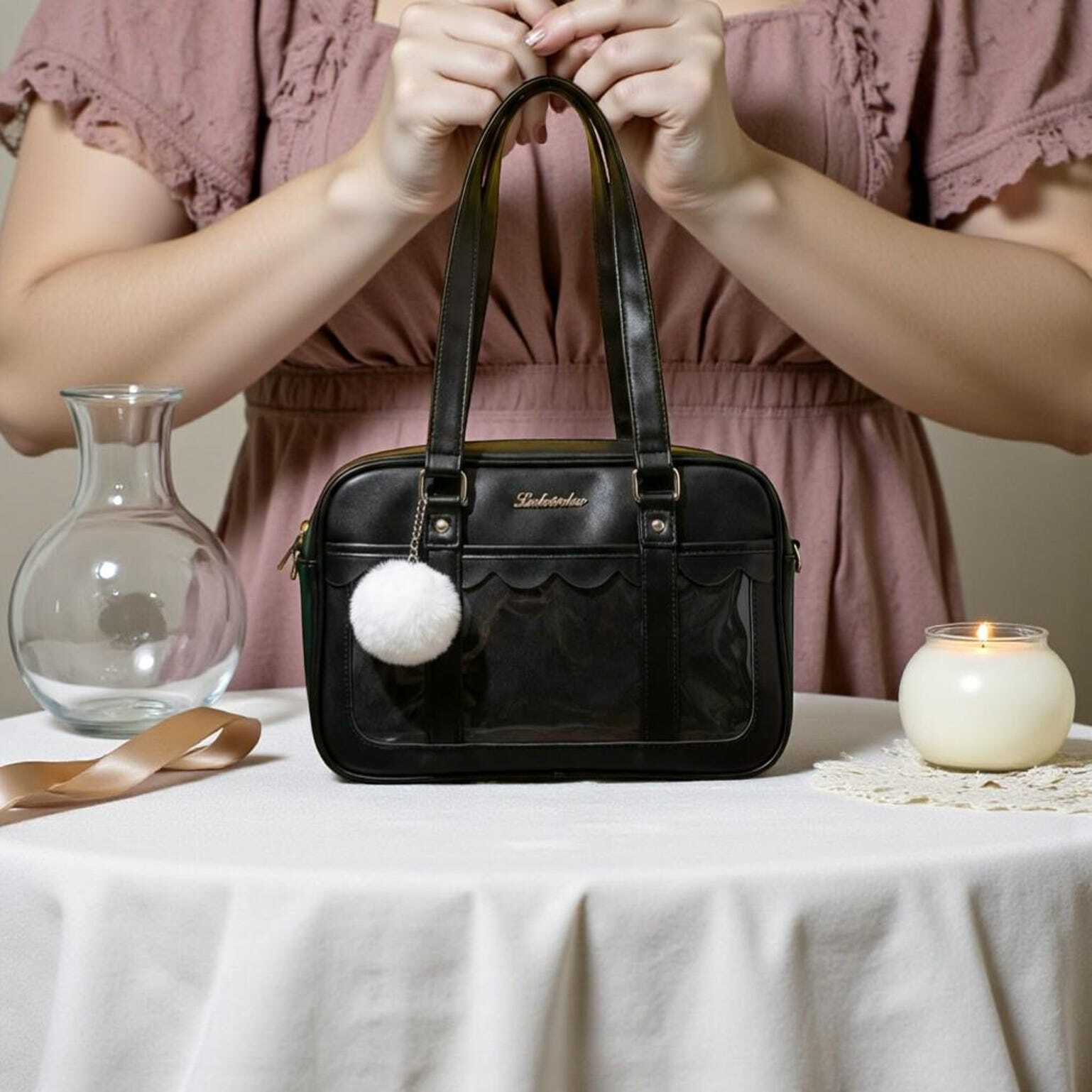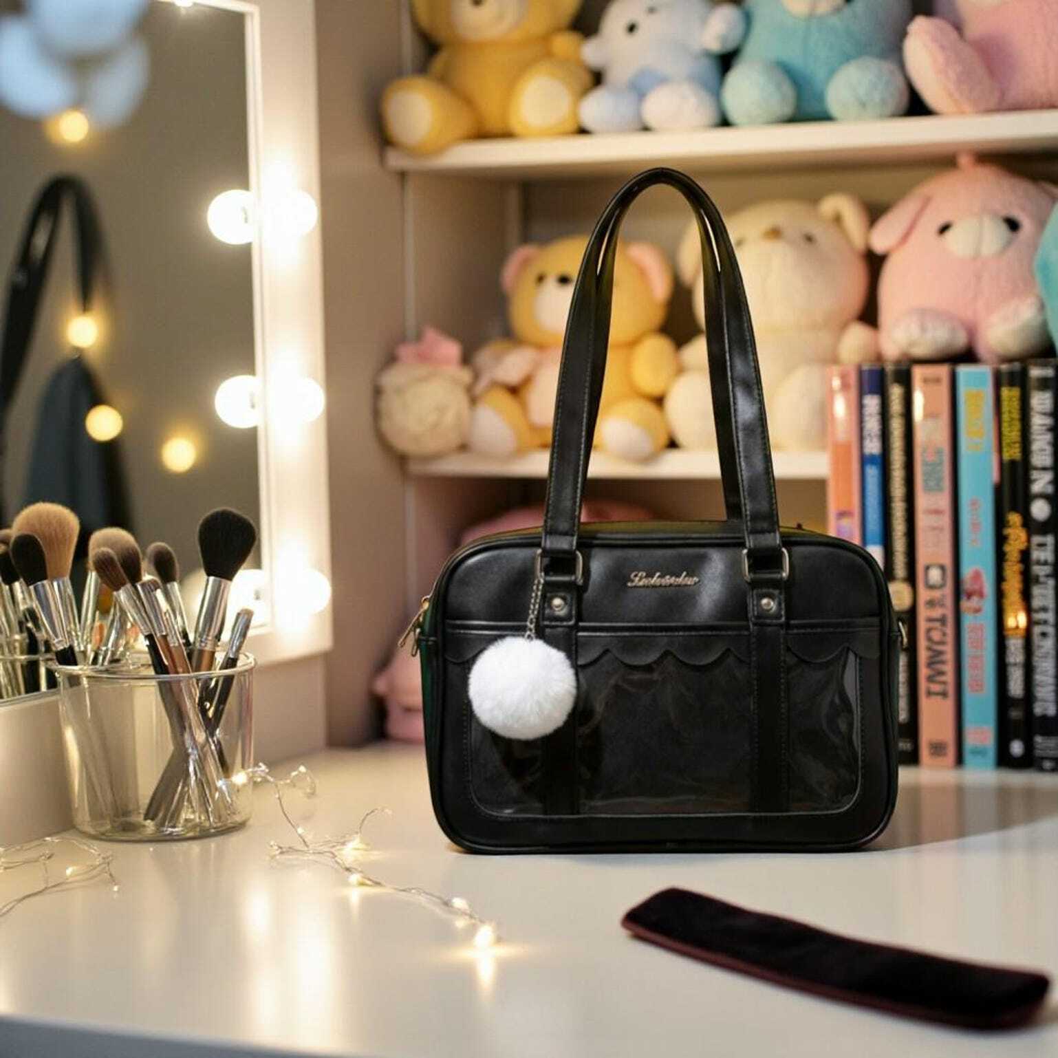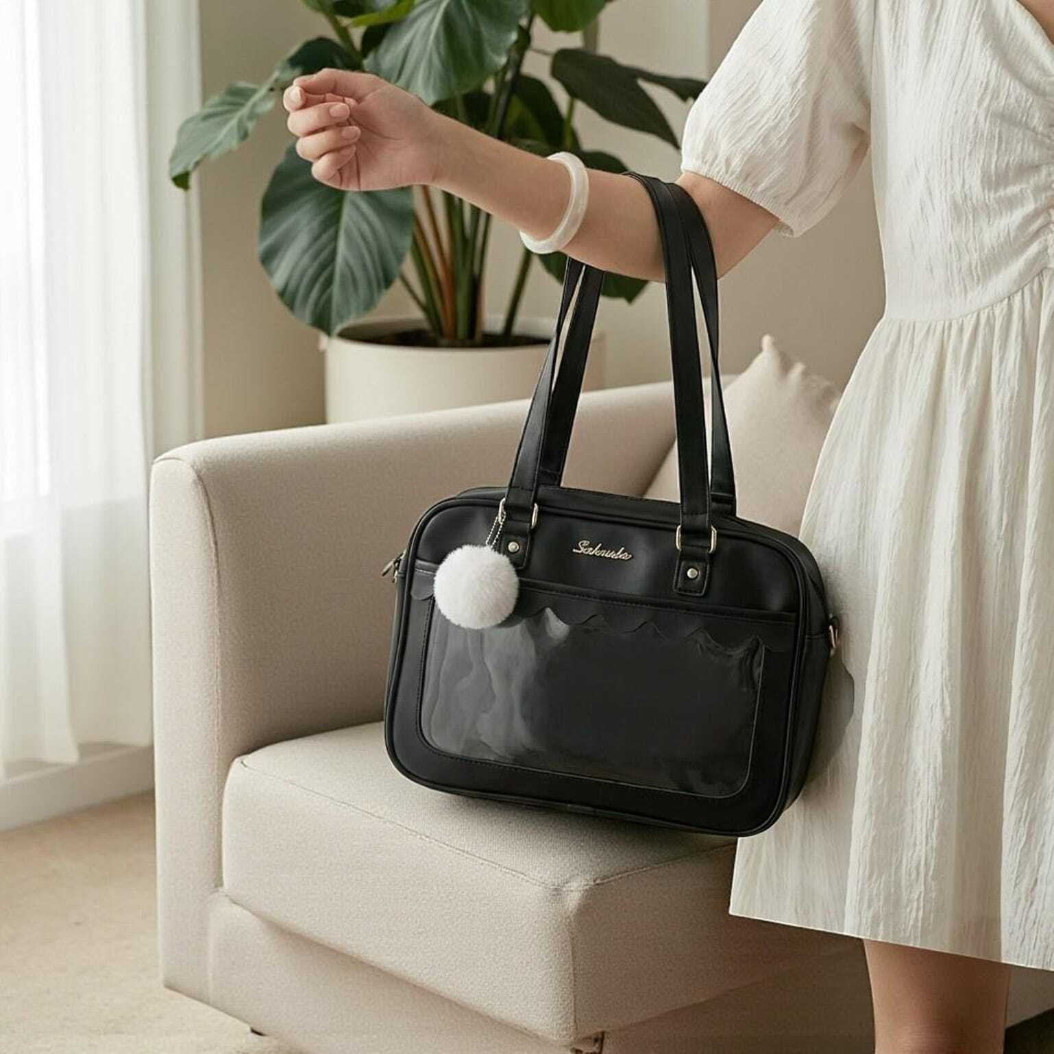 Black Kawaii Convertible Ita Bag with Clear Window for Pin Display combines everyday carry with a clear display area for pins, badges, charms, or character merch.