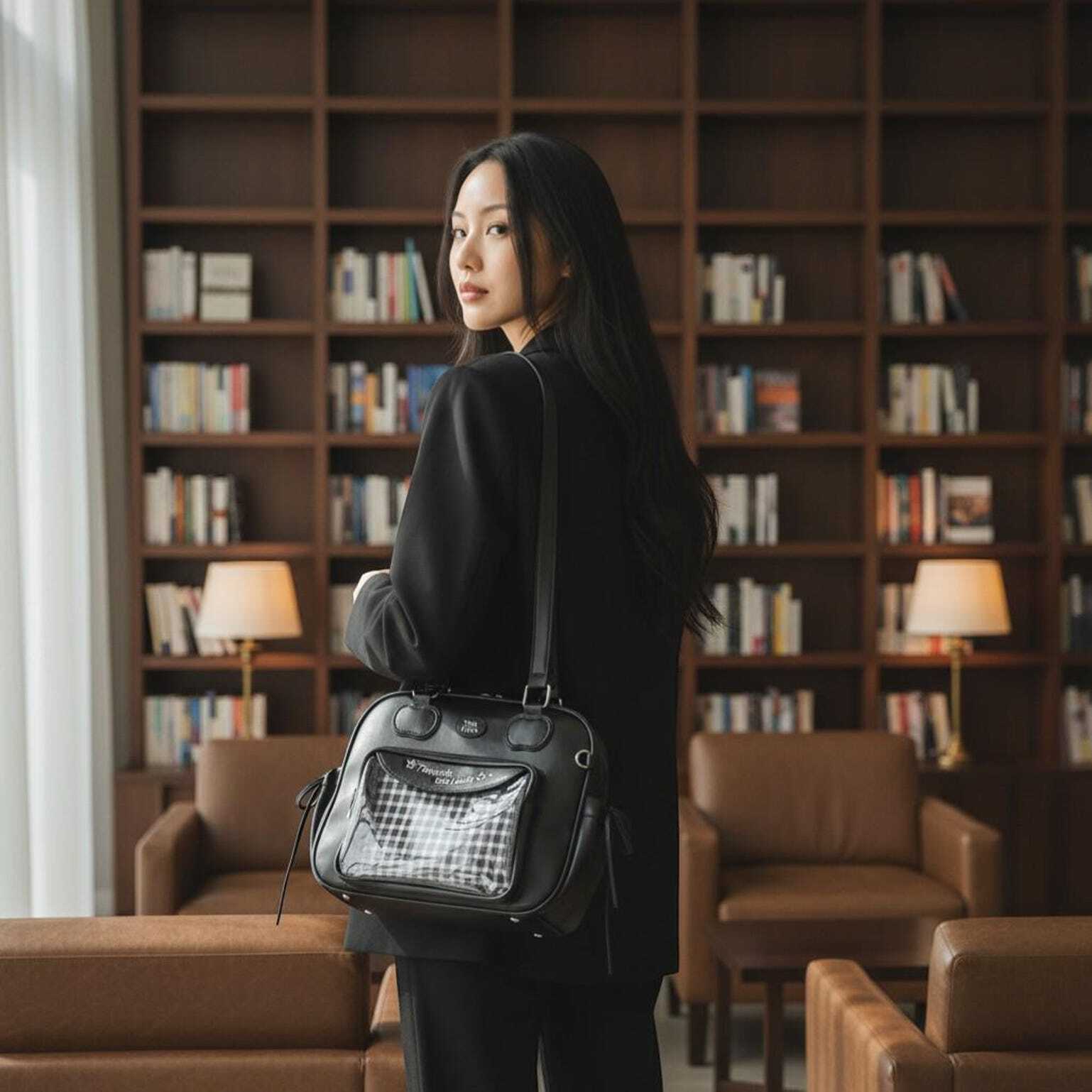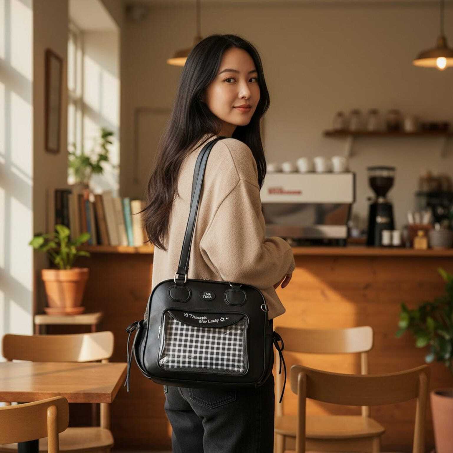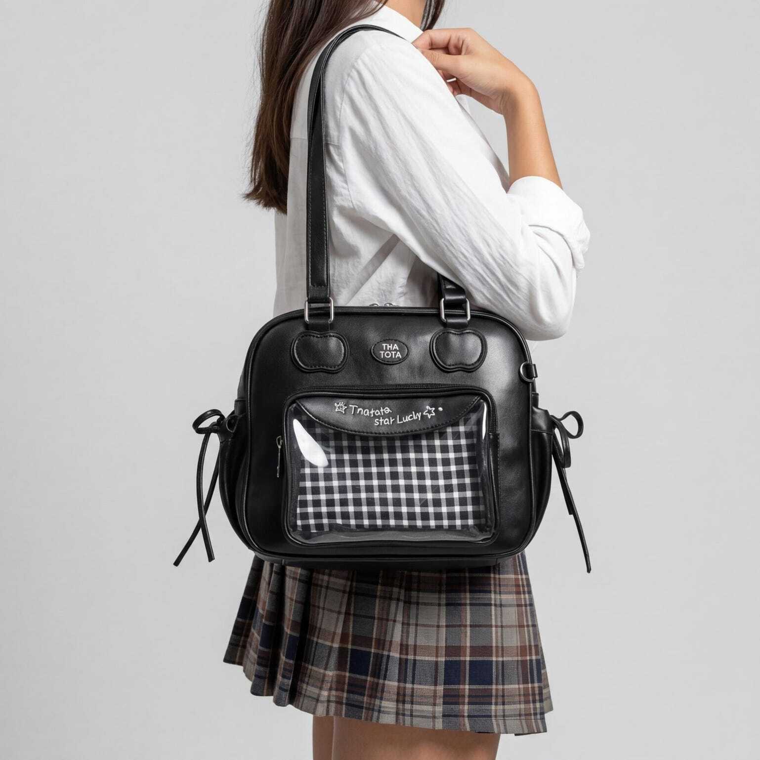 Black Kawaii Convertible Ita Bag with Clear Window for Pin Display combines everyday carry with a clear display area for pins, badges, charms, or character merch.