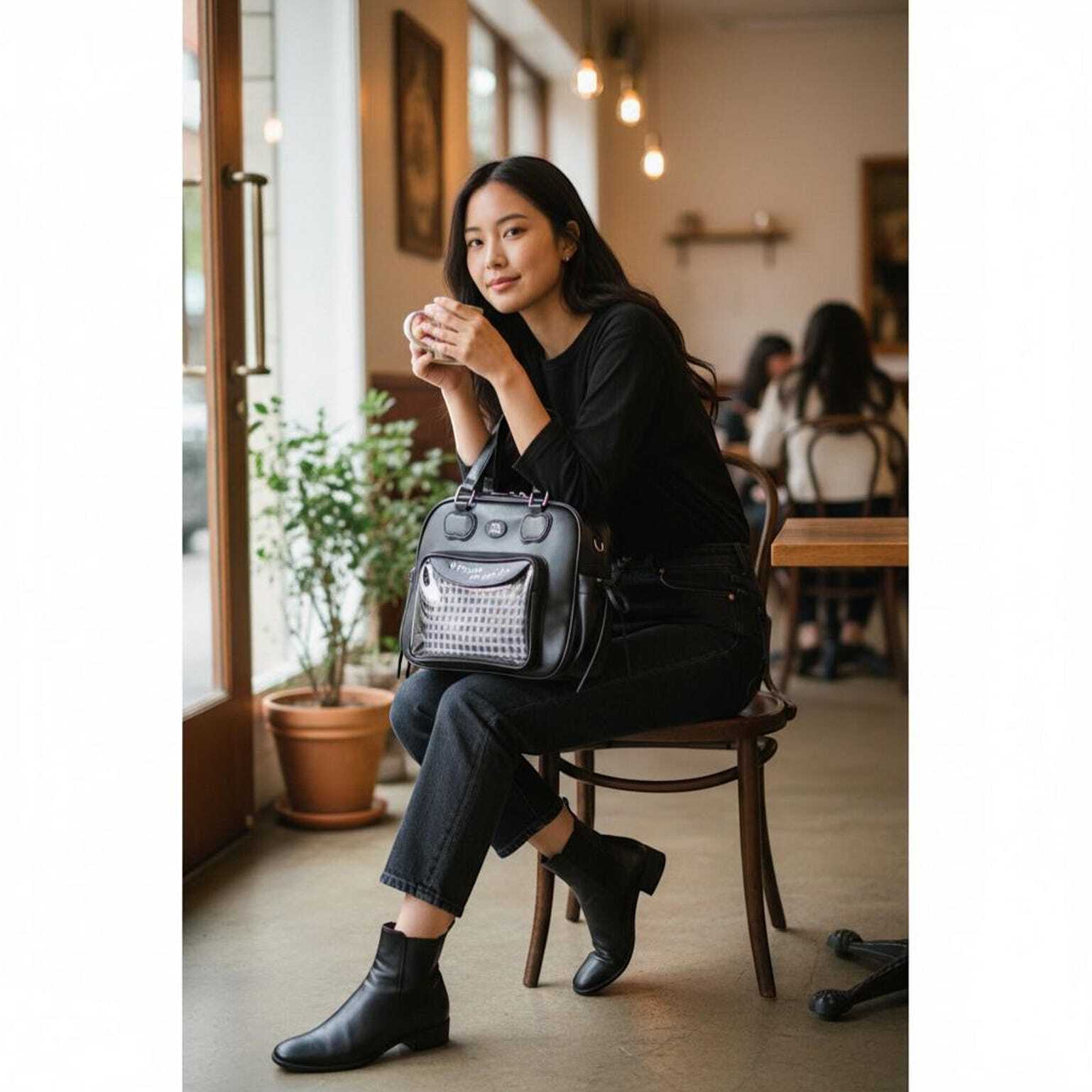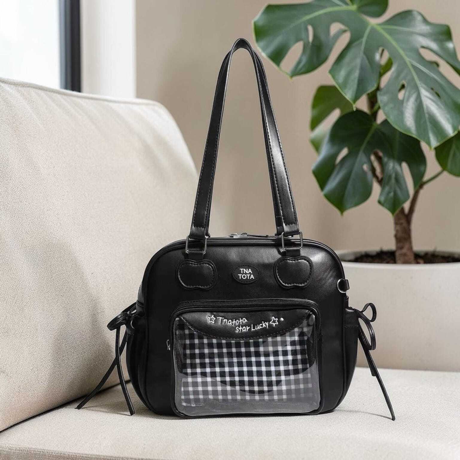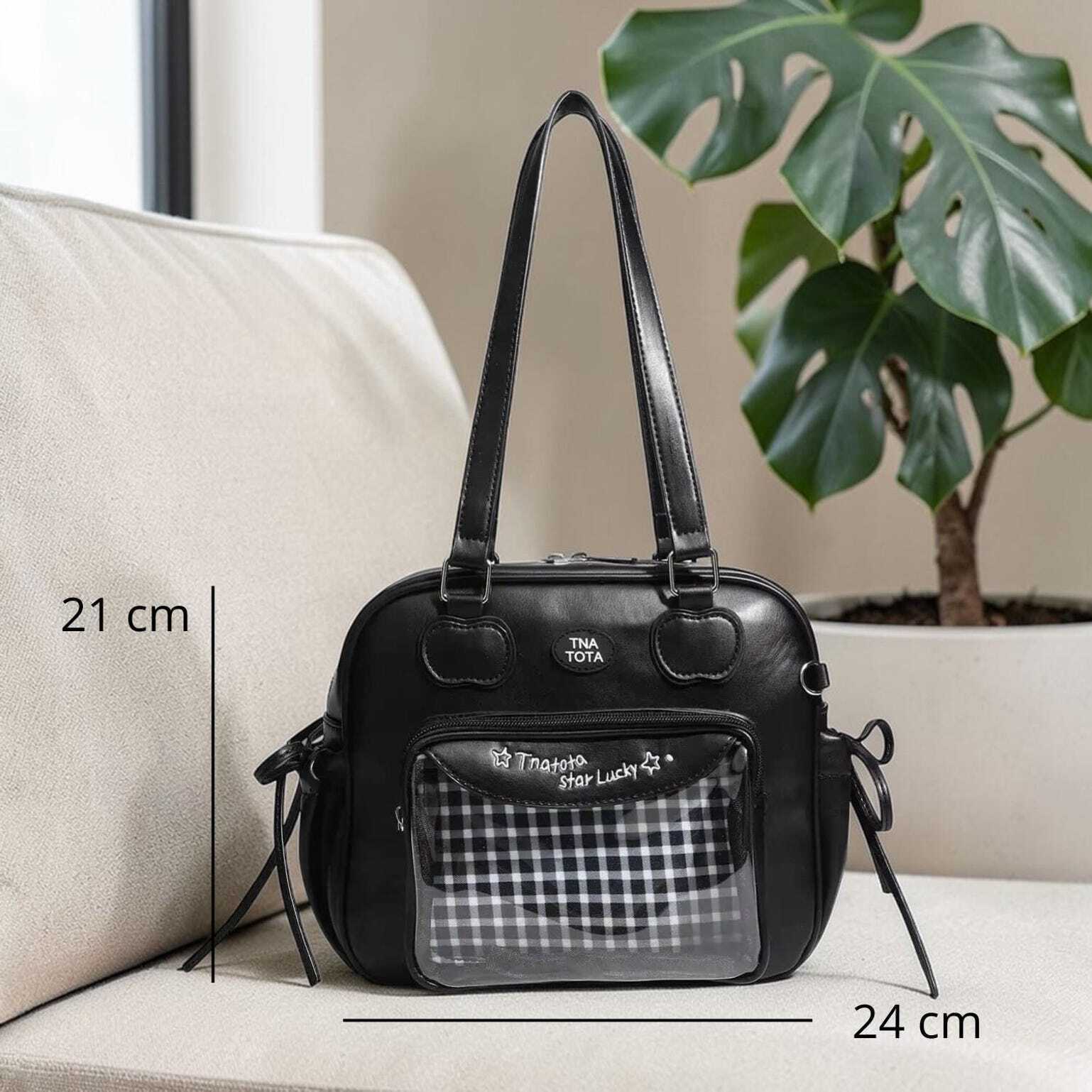 Black Kawaii Convertible Ita Bag with Clear Window for Pin Display combines everyday carry with a clear display area for pins, badges, charms, or character merch.