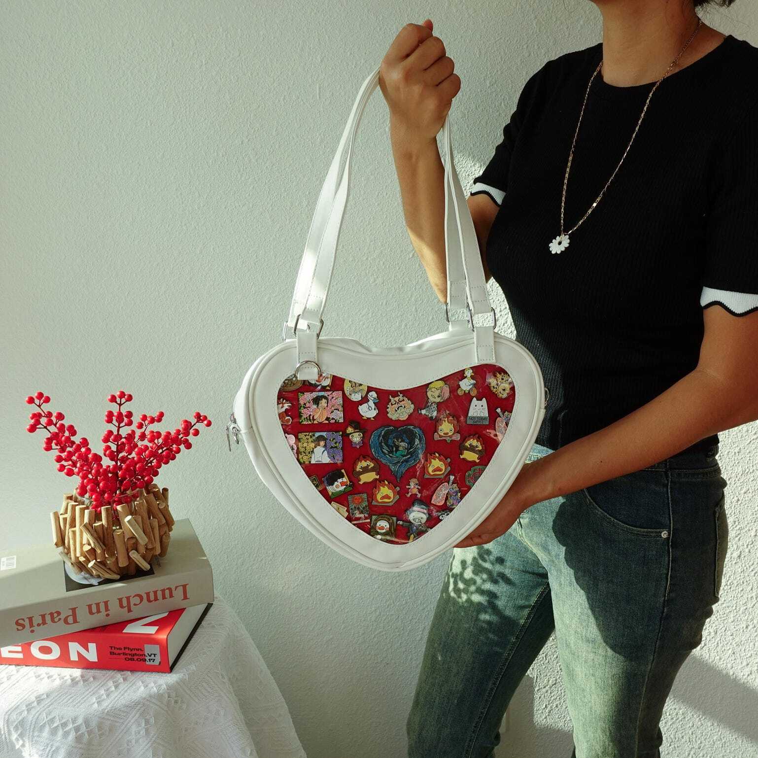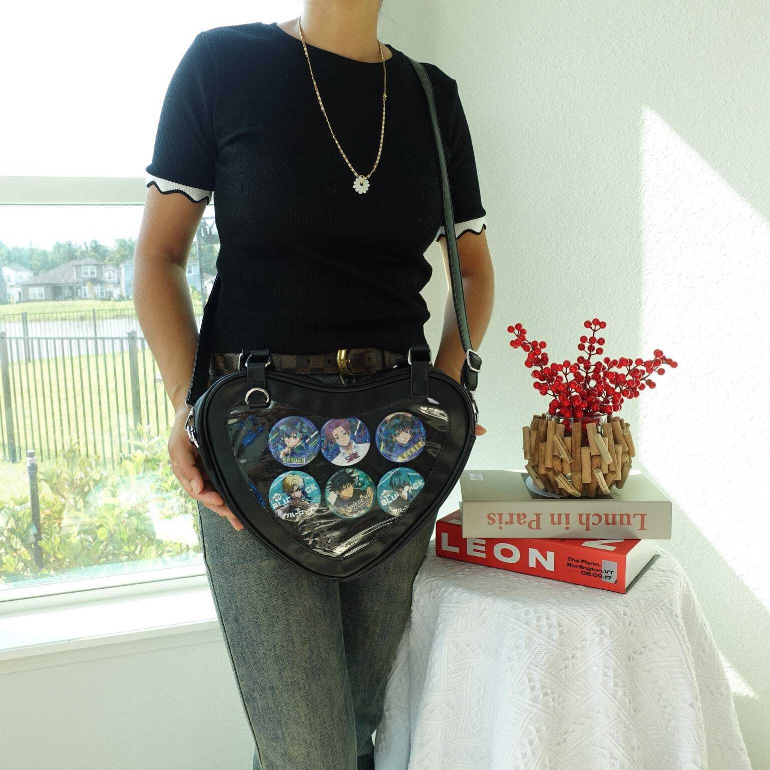 Black Kawaii Heart Convertible Ita Bag with Clear Window for Plushies and Pins