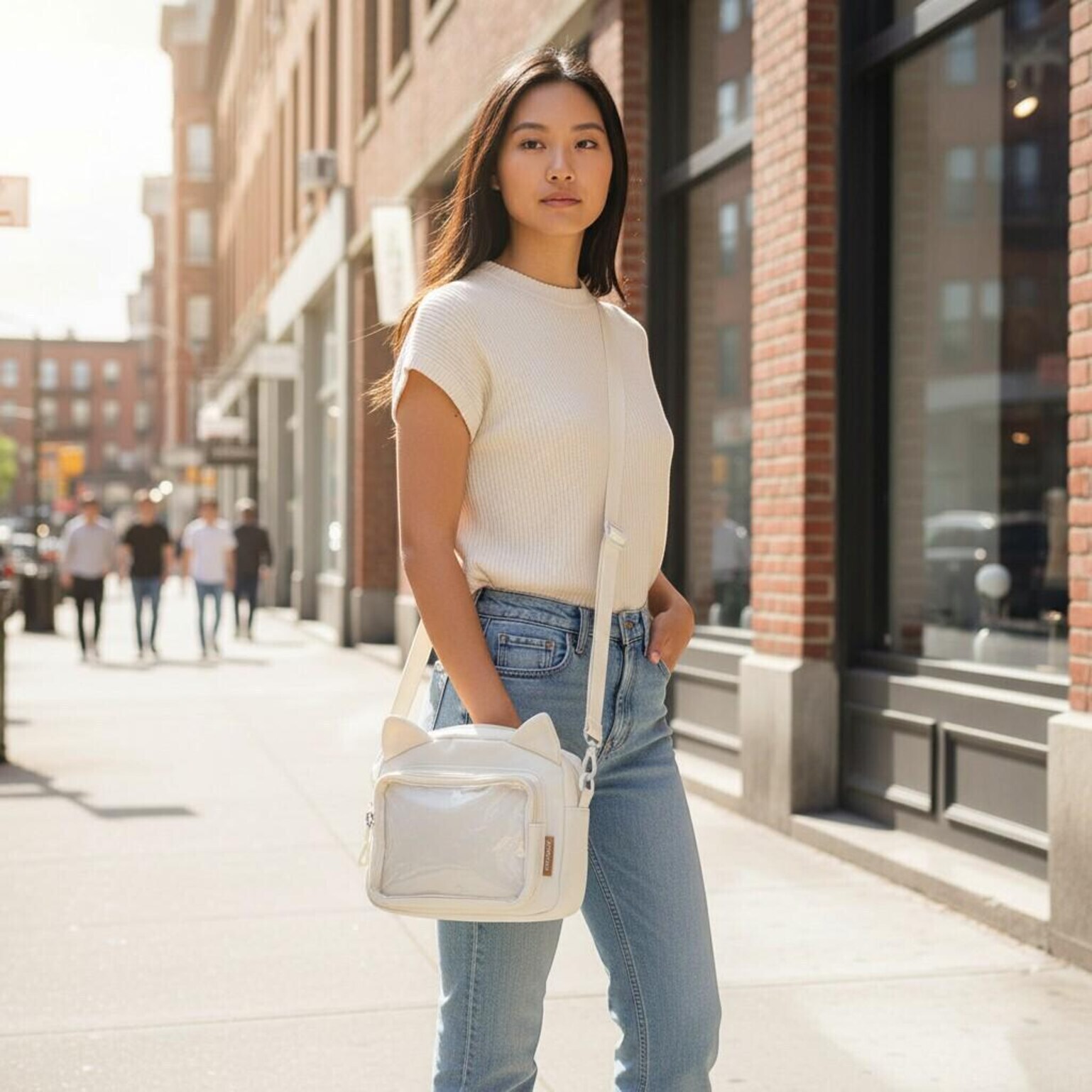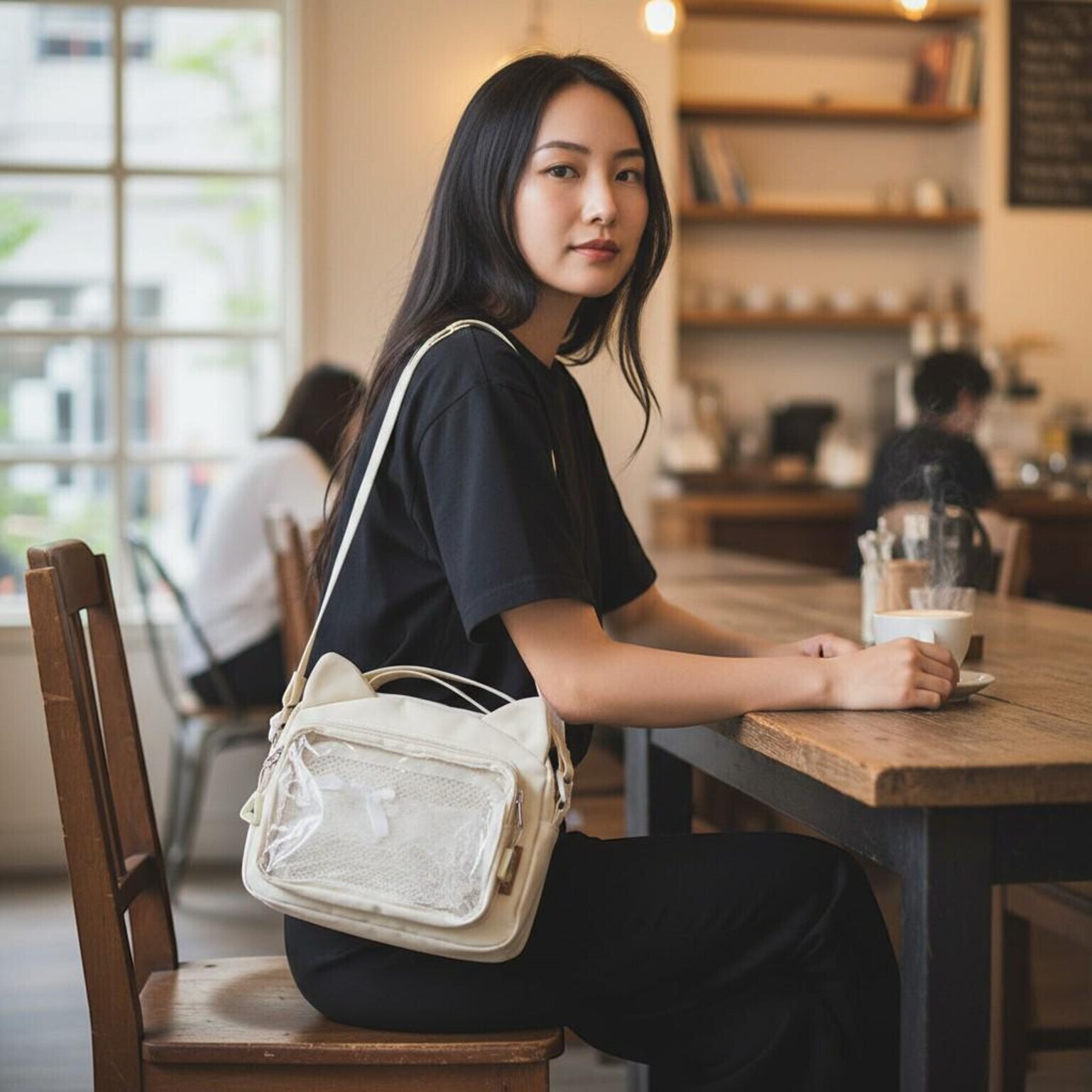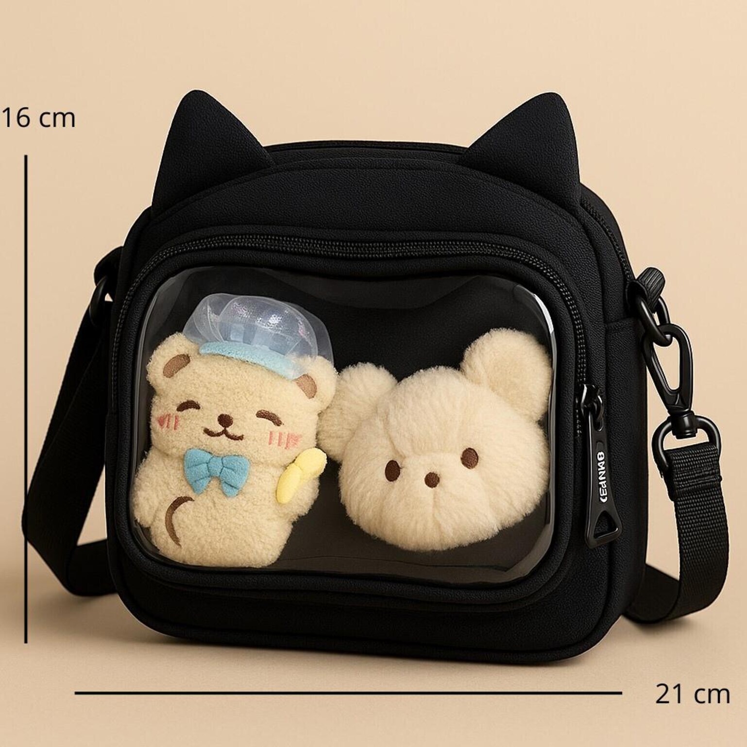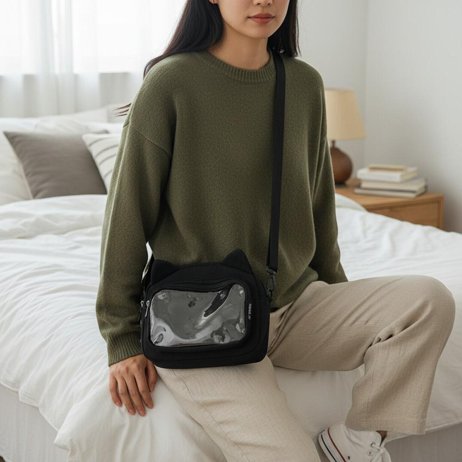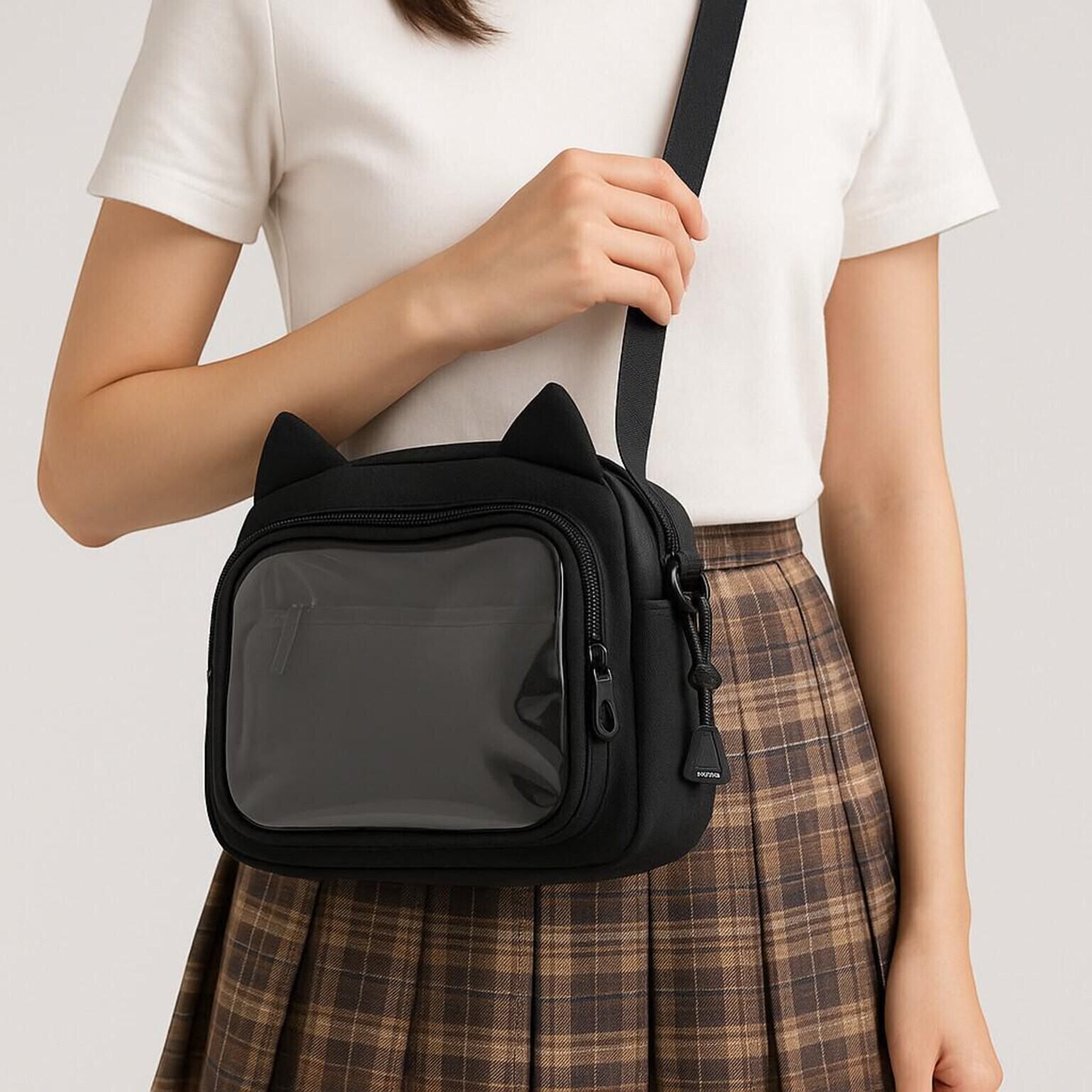 Black Kawaii Ita Shoulder Bag with Clear Window for Pin Display combines everyday carry with a clear display area for pins, badges, charms, or character merch.