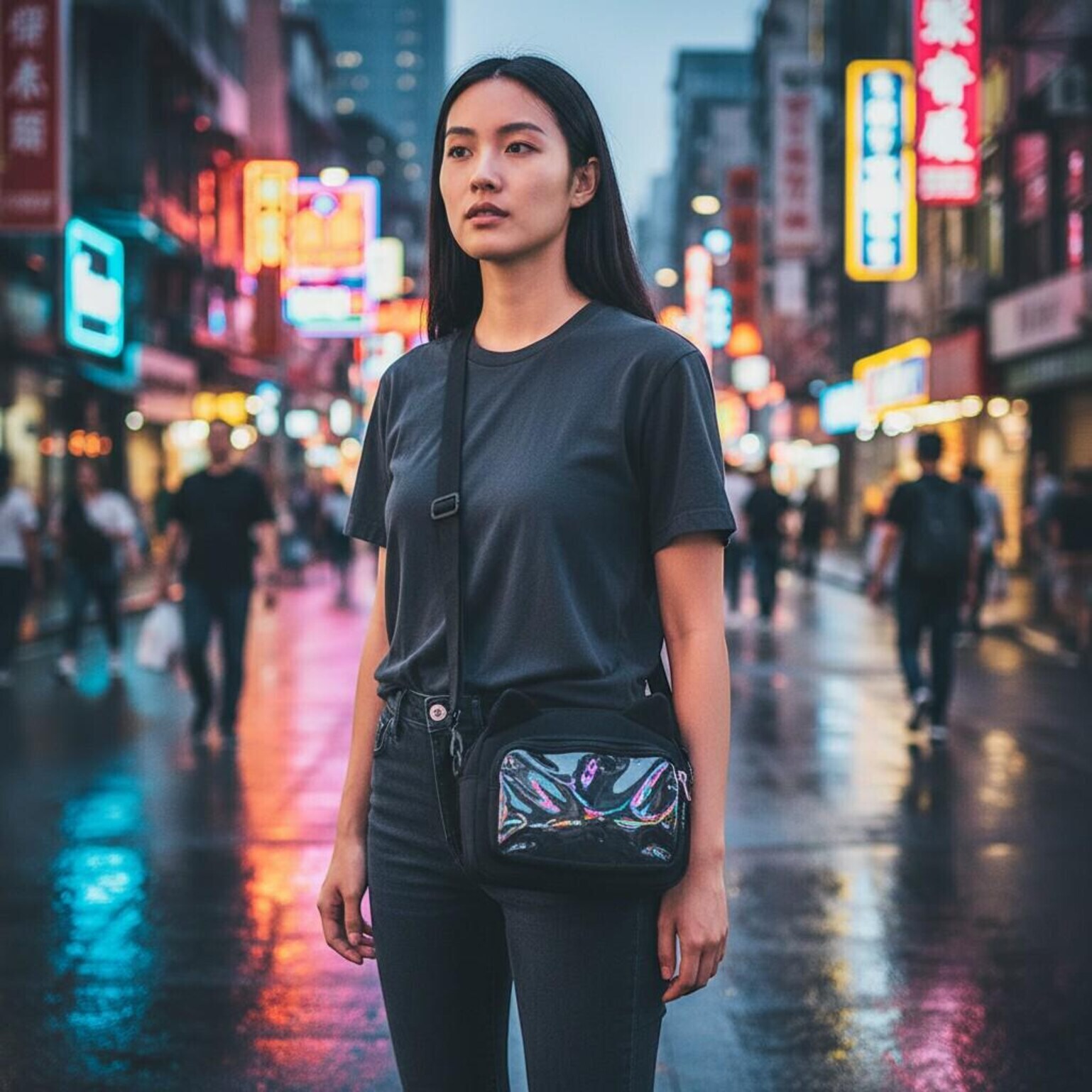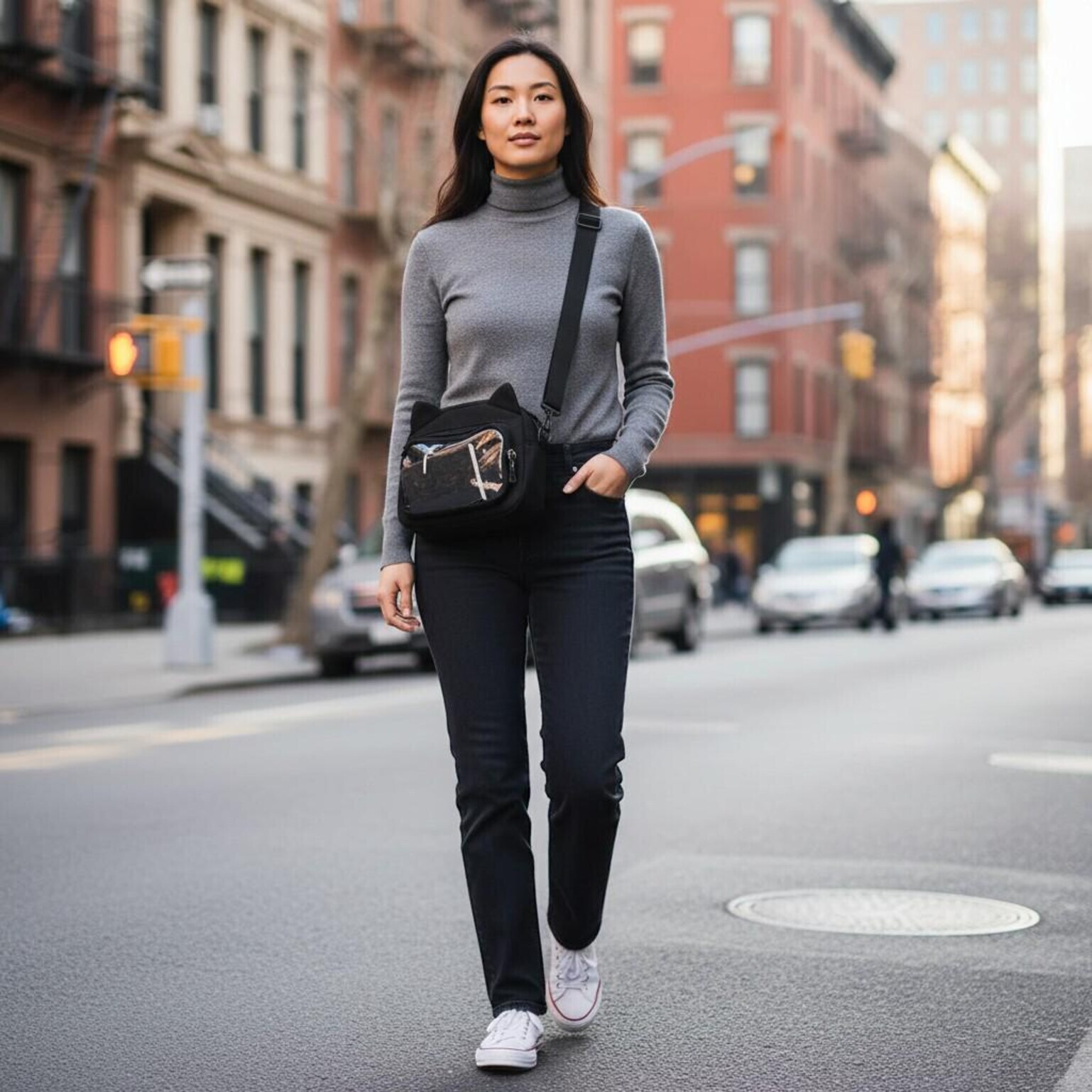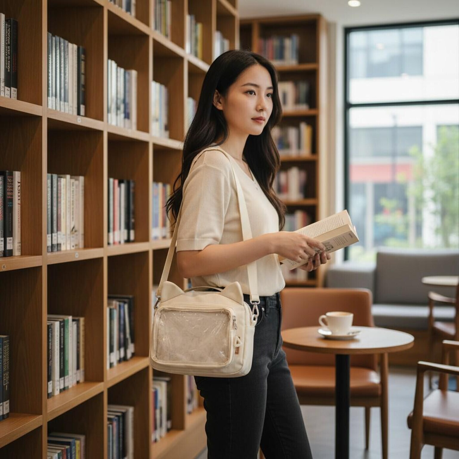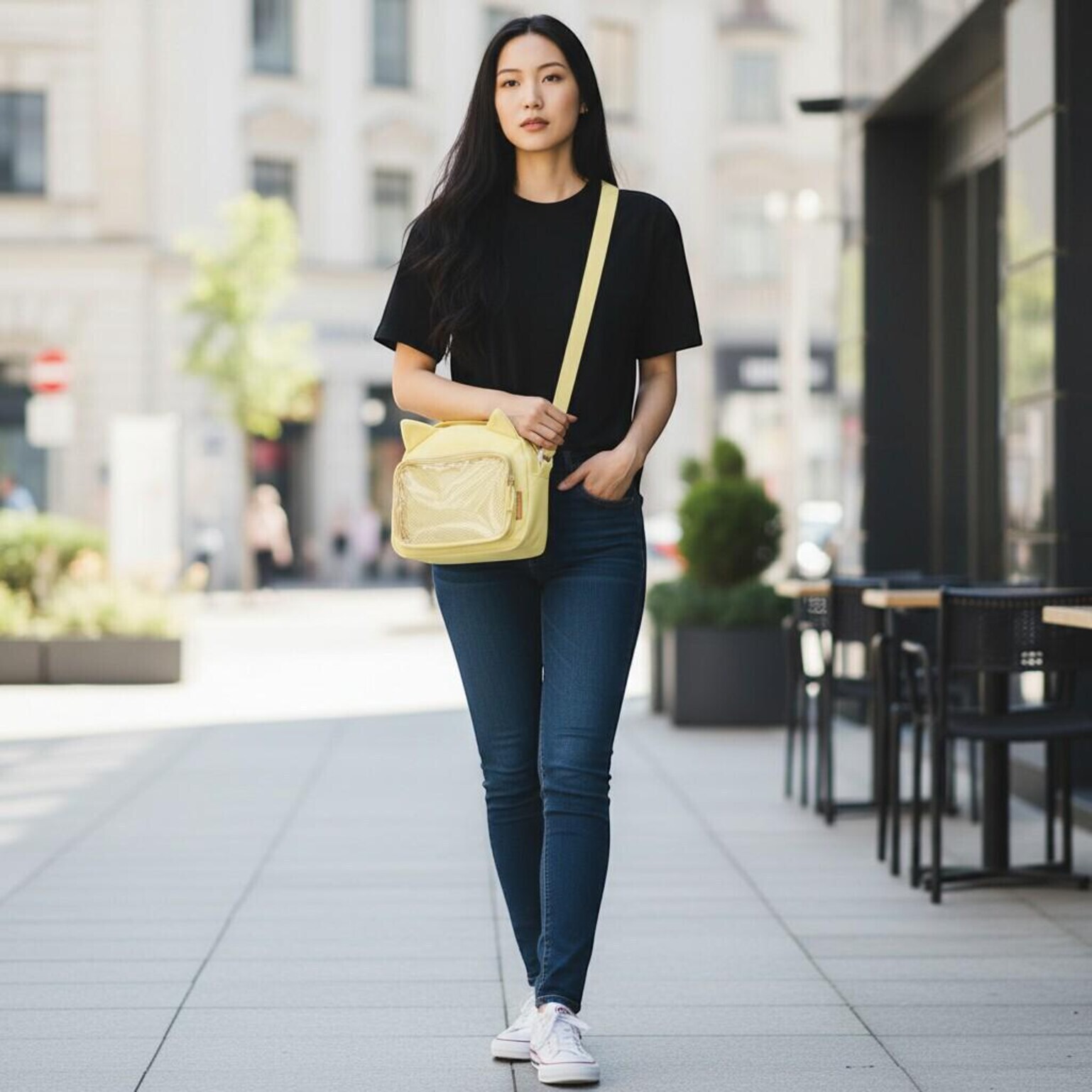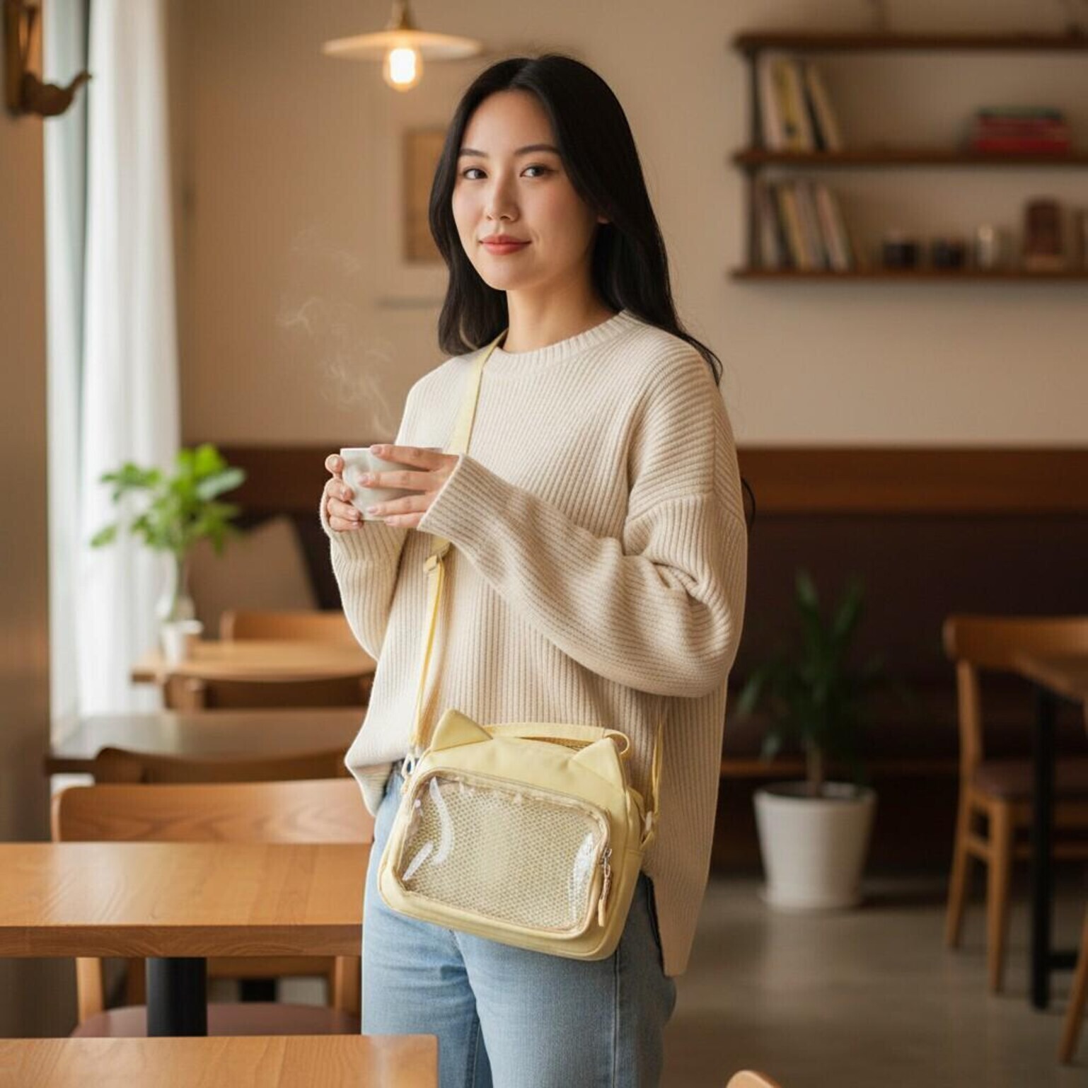 Black Kawaii Ita Shoulder Bag with Clear Window for Pin Display combines everyday carry with a clear display area for pins, badges, charms, or character merch.