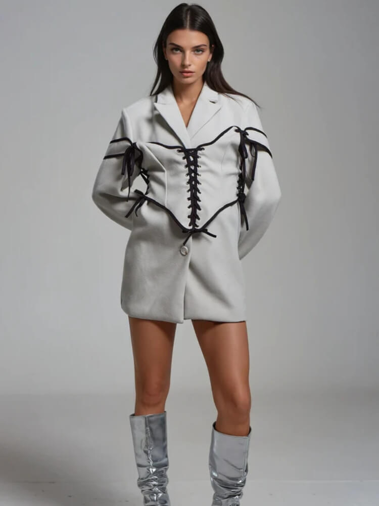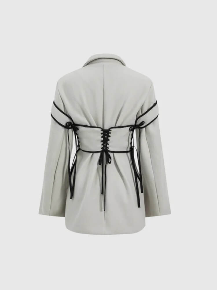 Redefine power dressing with this blazer jacket accented by corset-style lacing. Structured tailoring meets edgy design, giving a sharp silhouette that’s both refined and daring. The black lace-up detailing contrasts against the neutral base, creating a bold statement piece for modern streetwear or night-out looks.
