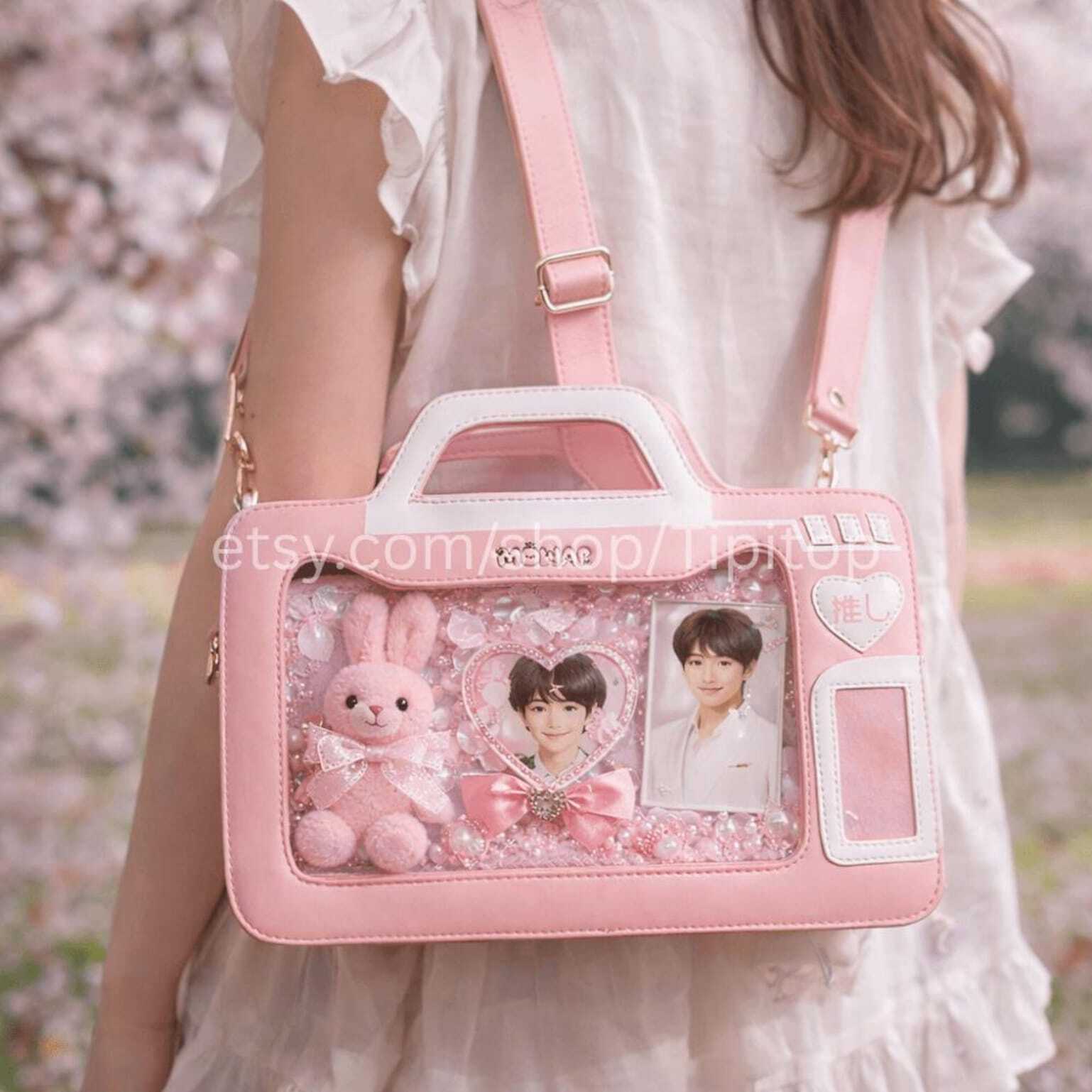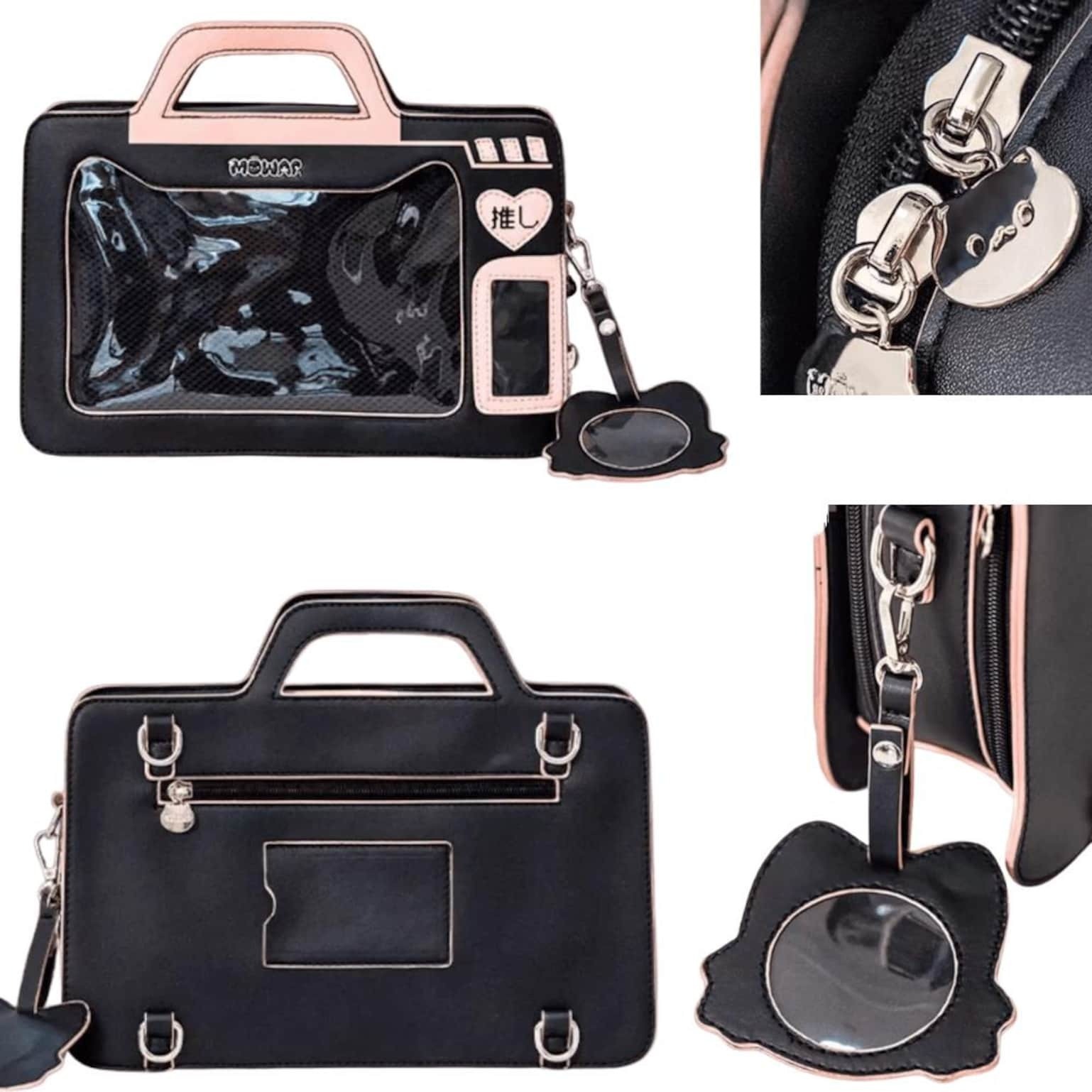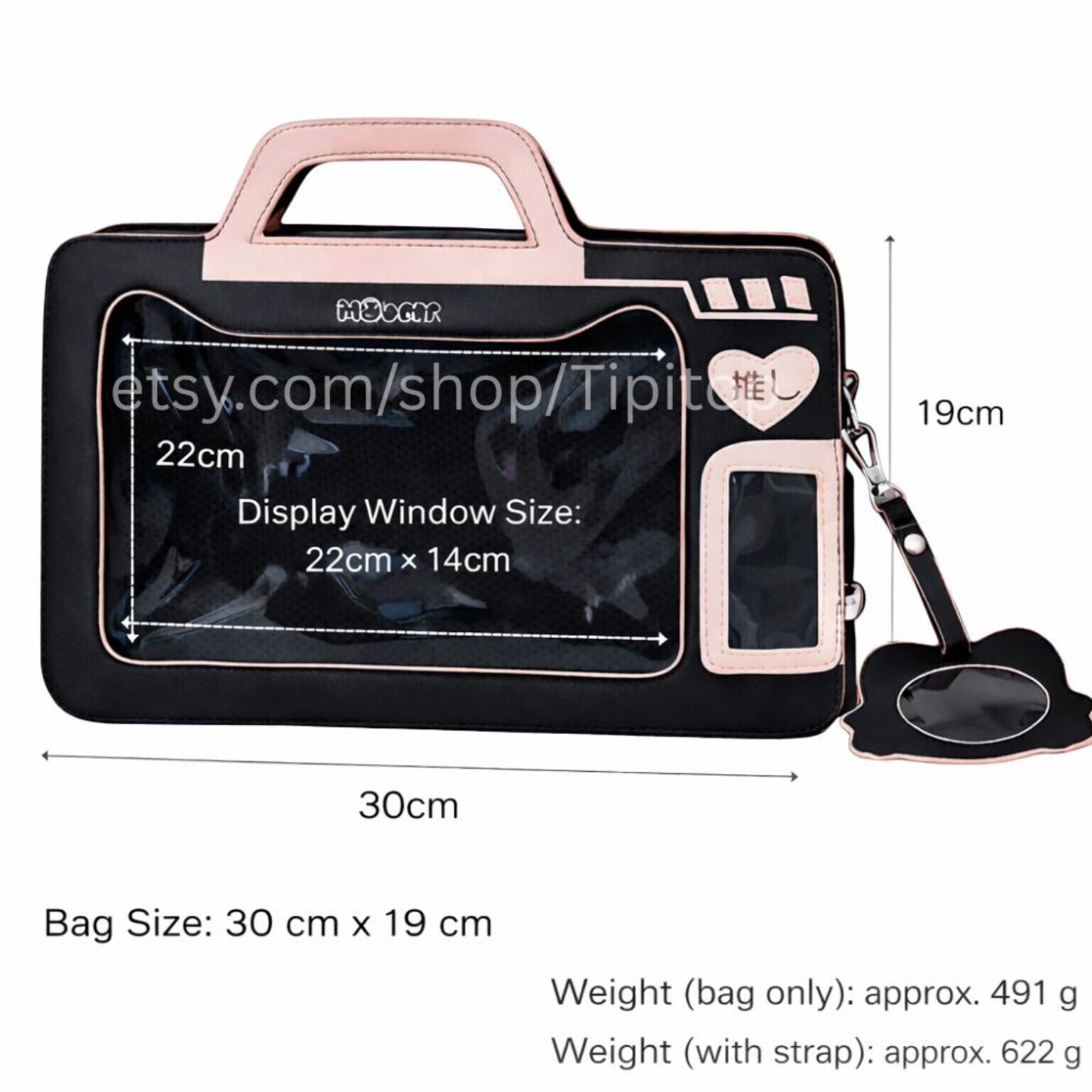 Blue Kawaii Cat Convertible Ita Bag with Clear Window for Pin Display combines everyday carry with a clear display area for pins, badges, charms, or character merch.