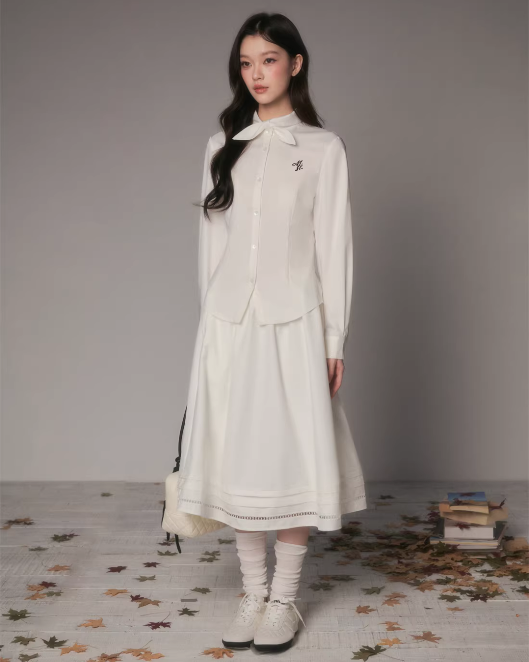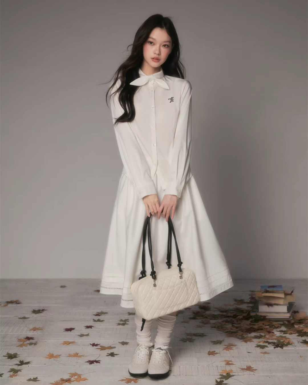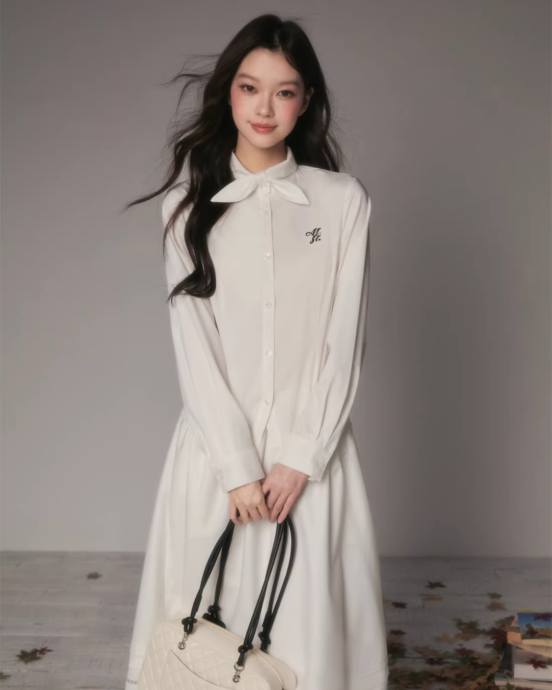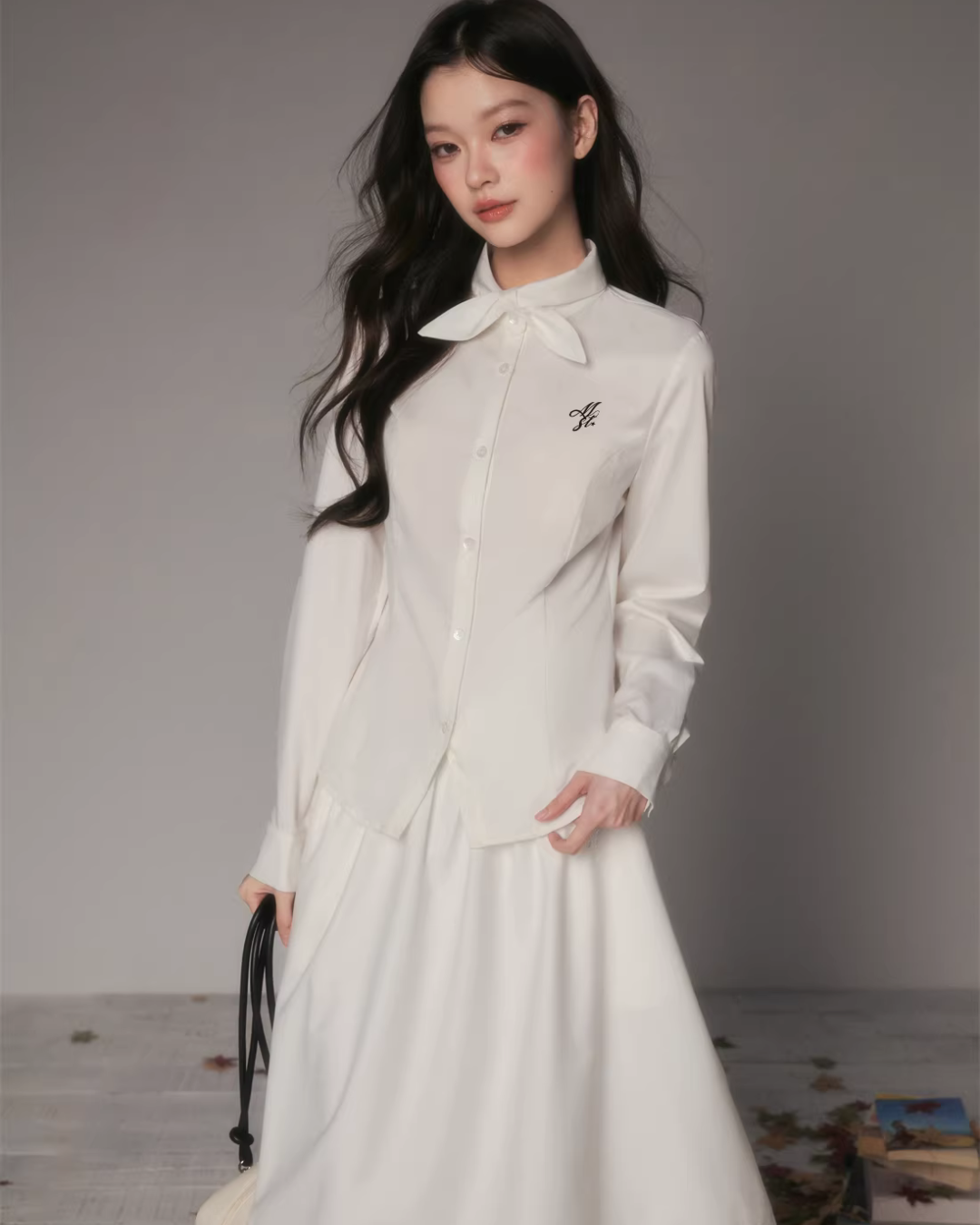 The charming long-sleeved shirt with a bow tie at the collar.