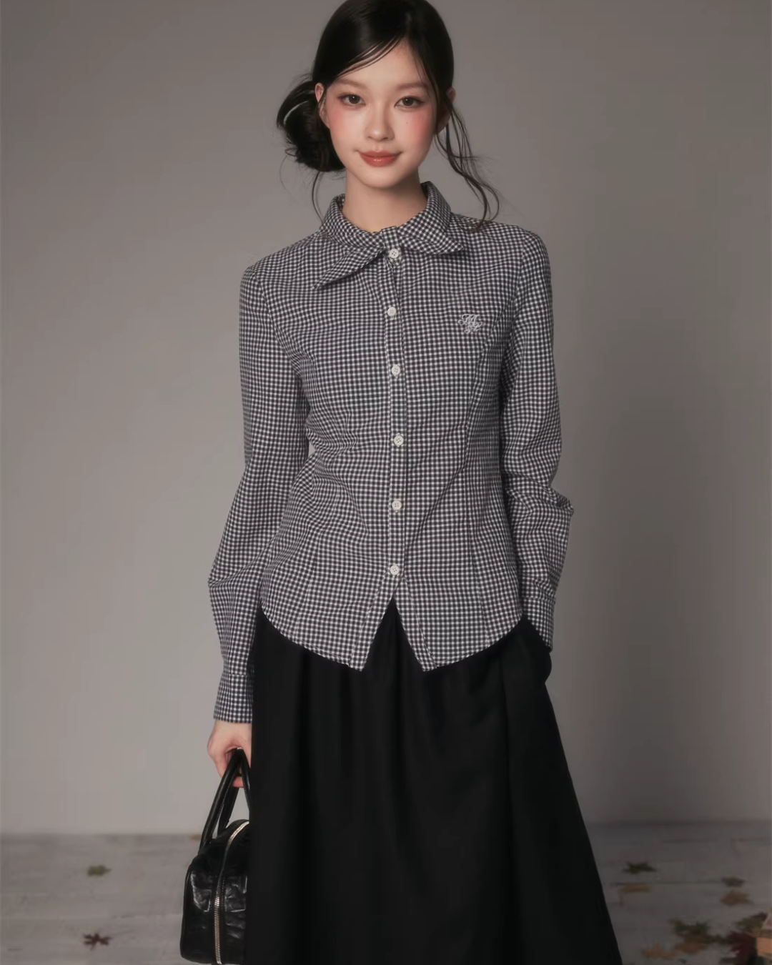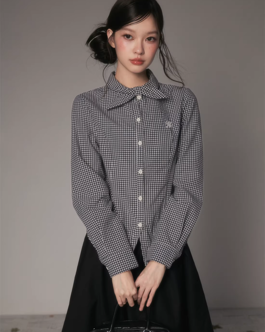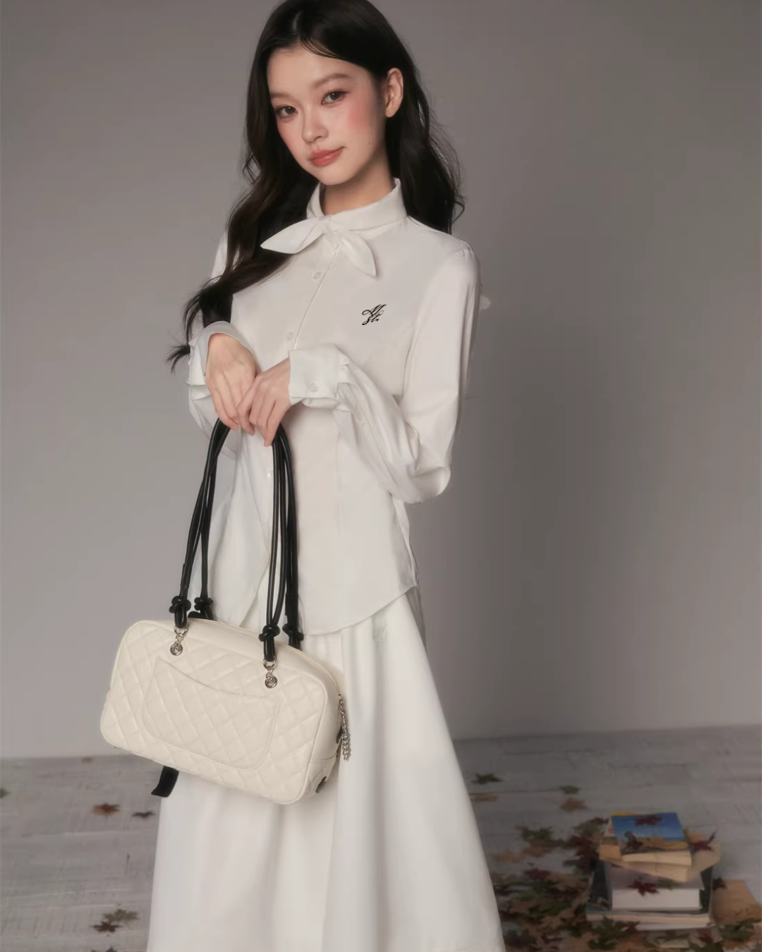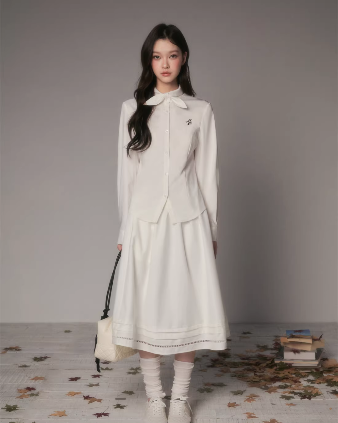 The charming long-sleeved shirt with a bow tie at the collar.