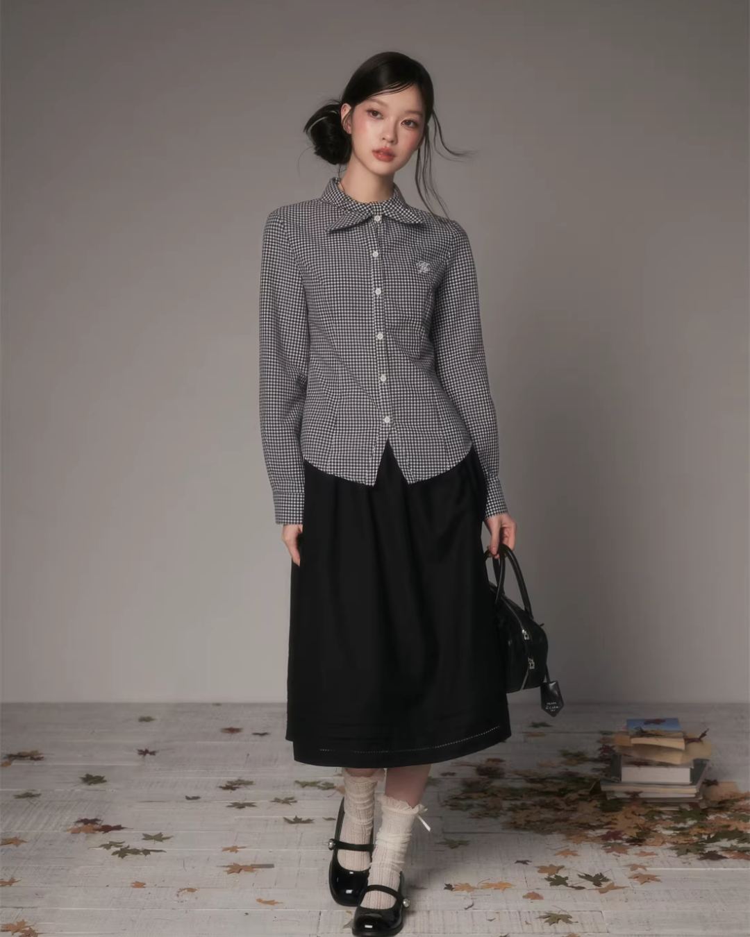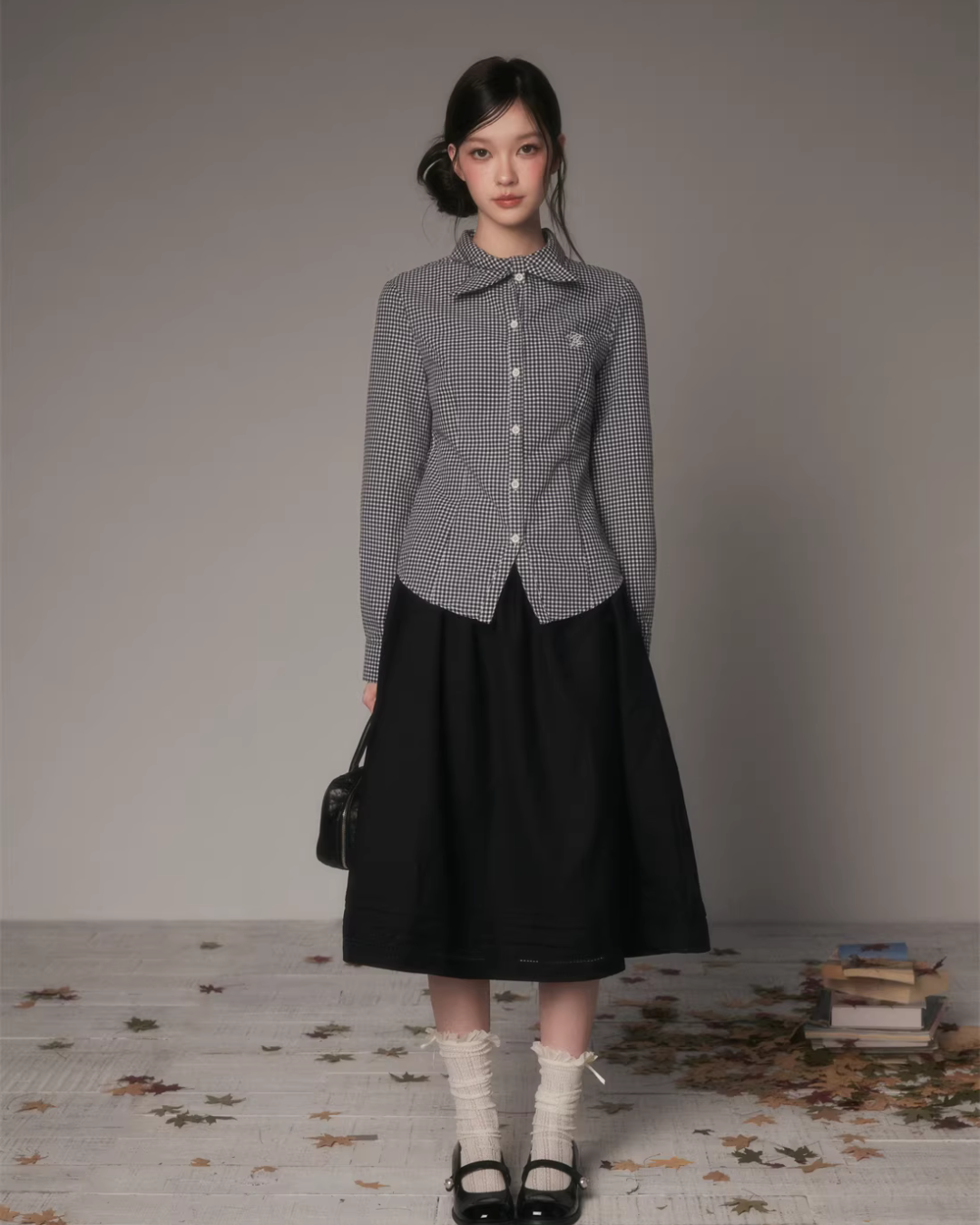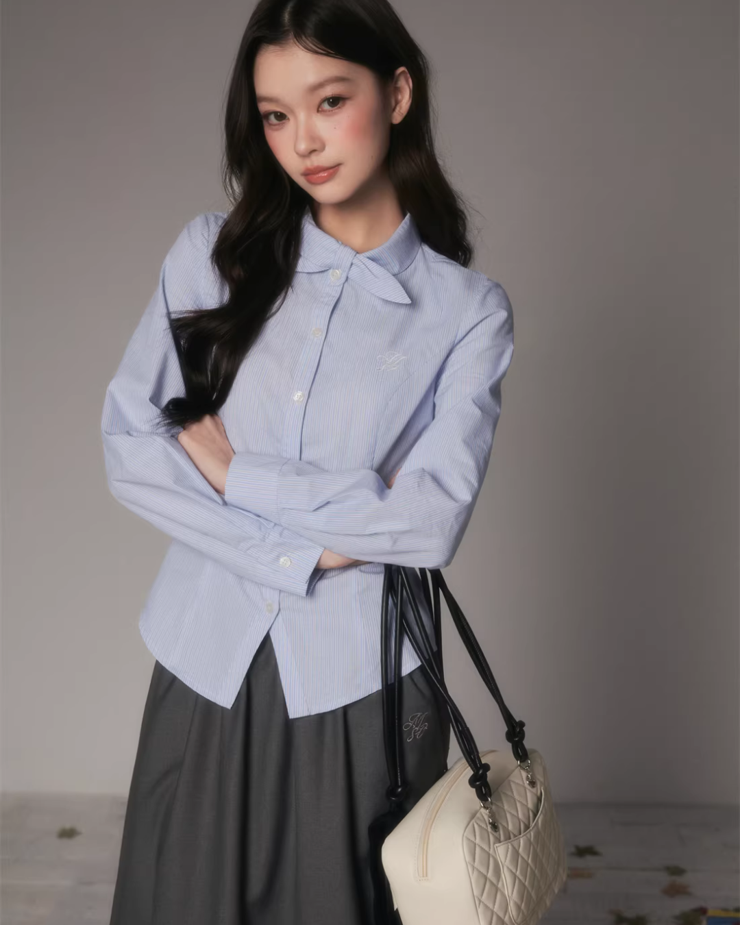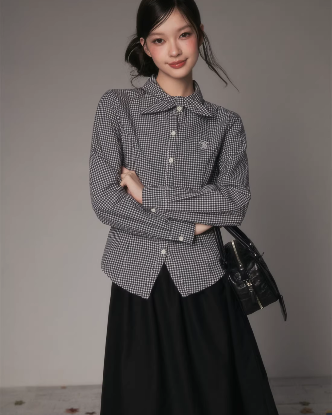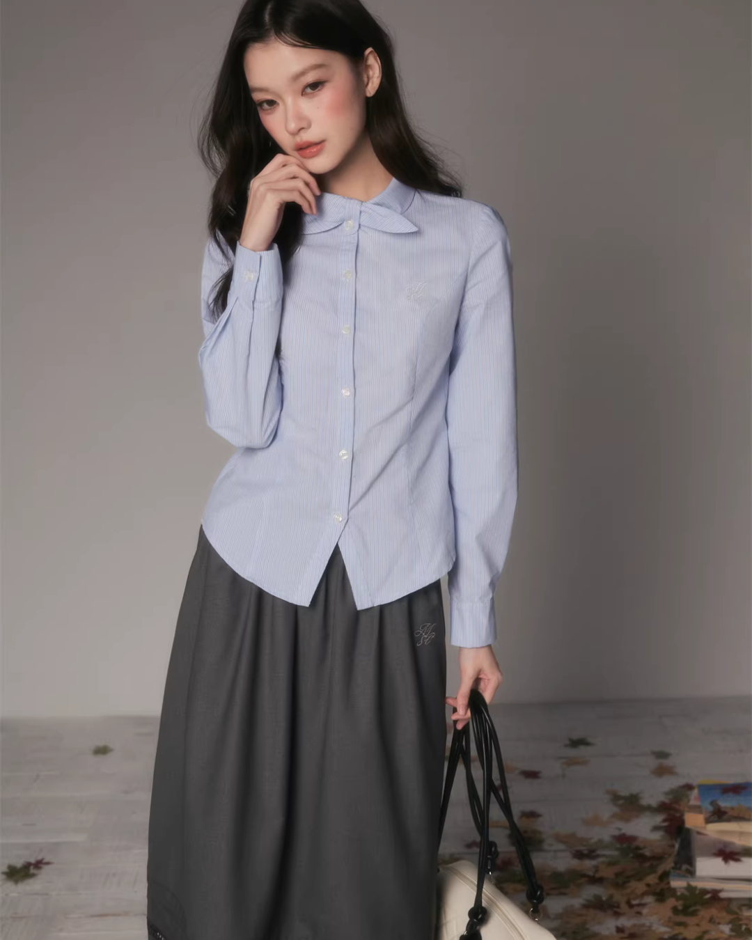The charming long-sleeved shirt with a bow tie at the collar.