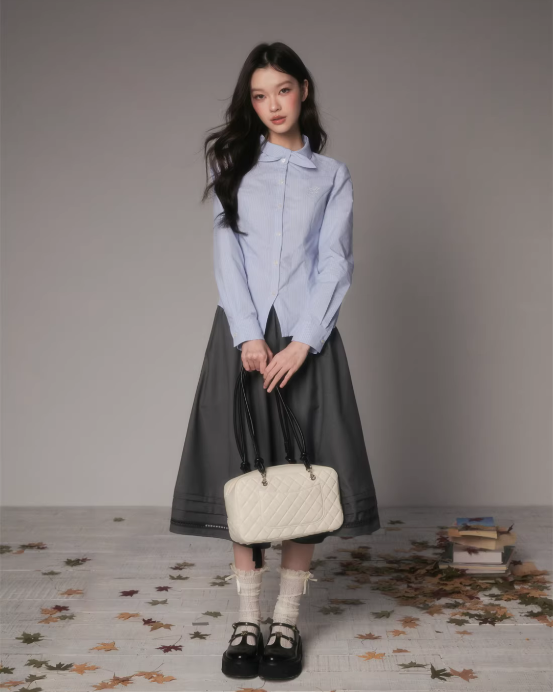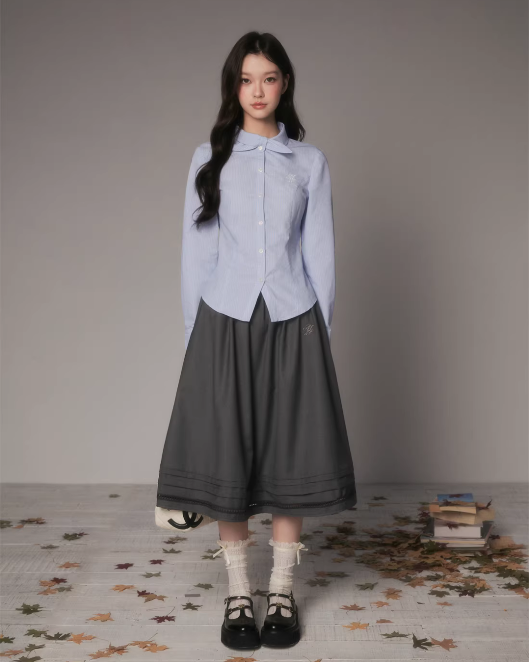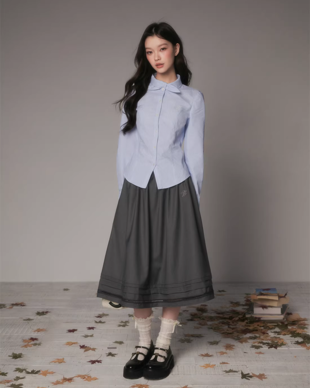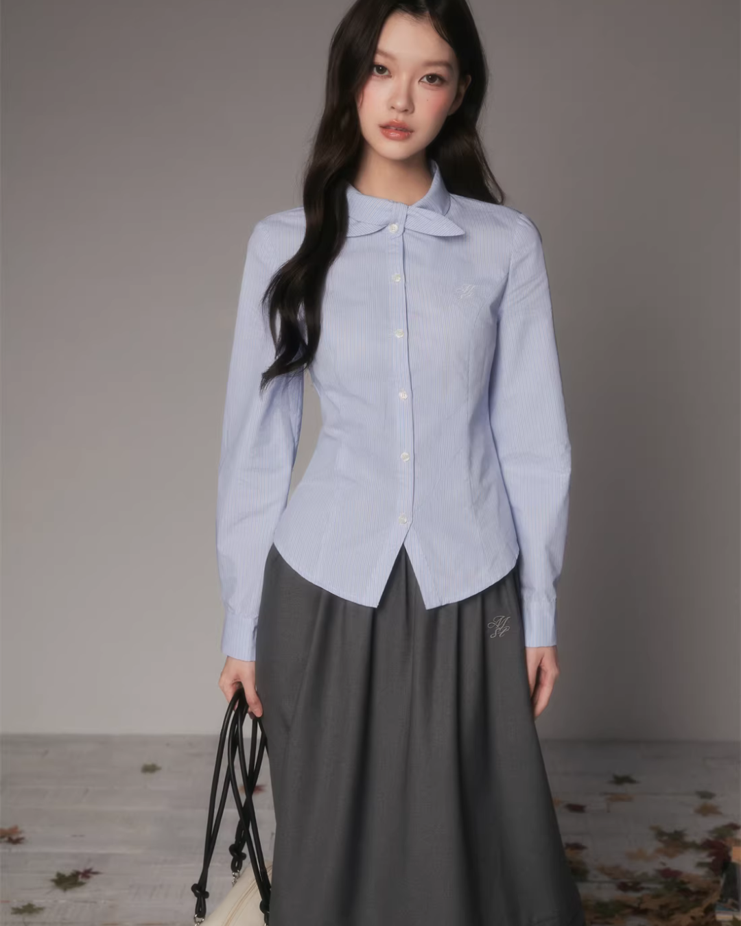 The charming long-sleeved shirt with a bow tie at the collar.