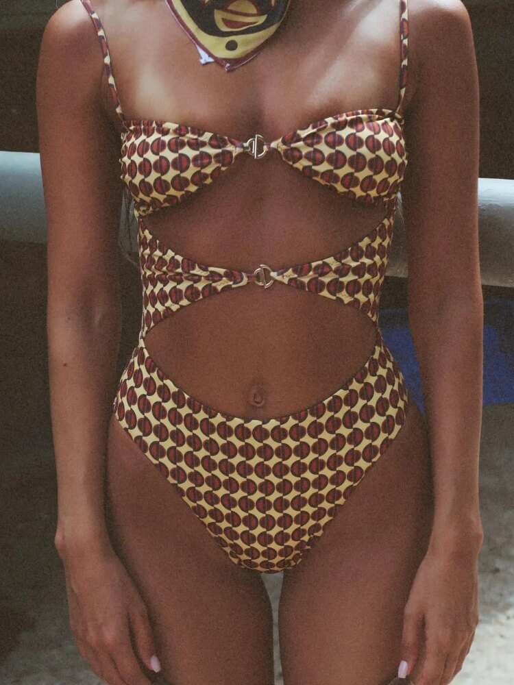 The Brown One Piece Swimsuit features a bold cut out design that creates a sculpted silhouette while maintaining the structure of a one piece. The bandeau style top connects at the center with a small hardware detail that highlights the waistline. Strategic cut outs define the midsection and add a modern statement look. Crafted from stretch swim fabric, this swimsuit offers flexibility and comfort while keeping a sleek high cut shape suitable for beachwear and poolside styling.