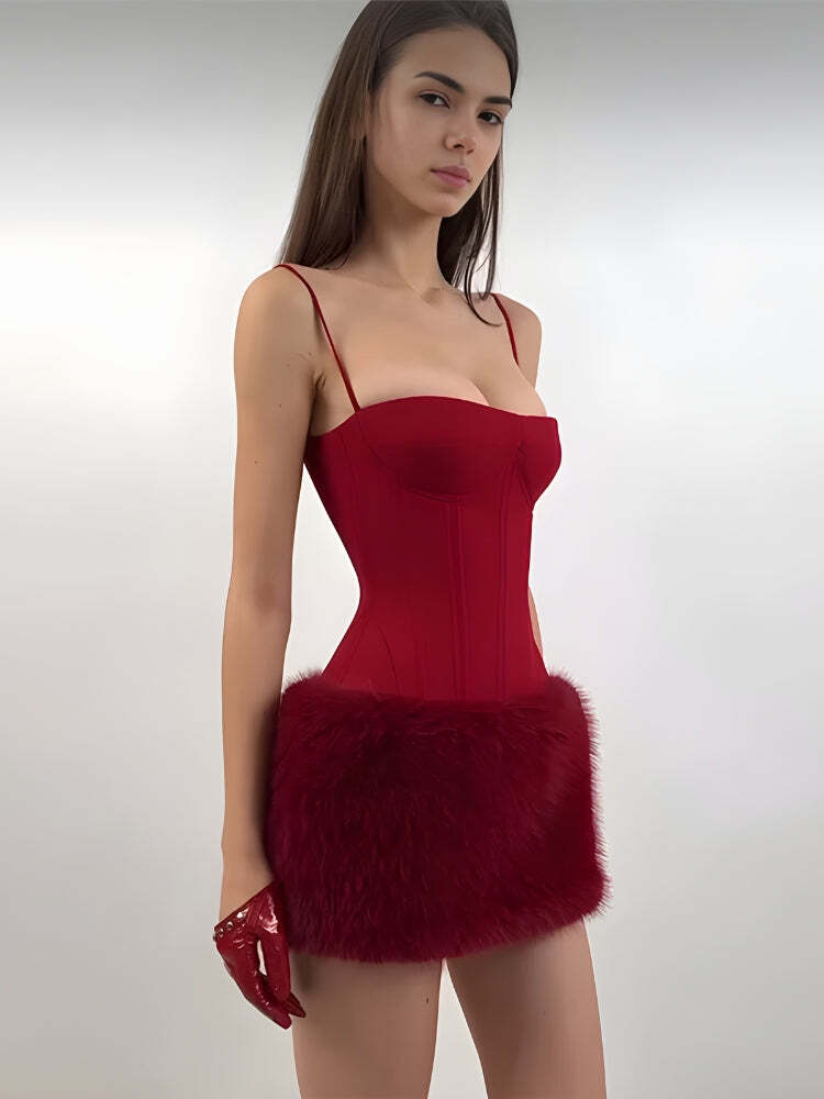 Burgundy Corset Dress delivers a bold, sculpted silhouette with striking detail. The structured corset bodice shapes the waist, while the mini length keeps the look sharp and modern. Finished with soft feather trim at the hem, it adds texture and movement that instantly stands out. Designed with slim straps and a clean neckline, this piece pairs perfectly with heels for nights out, parties, or statement event styling.