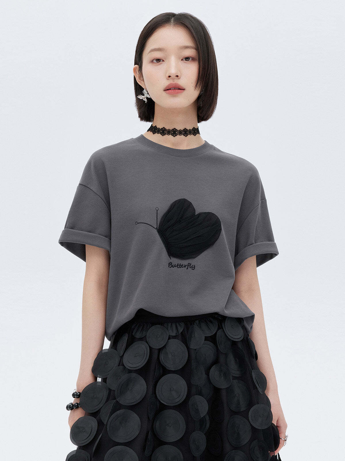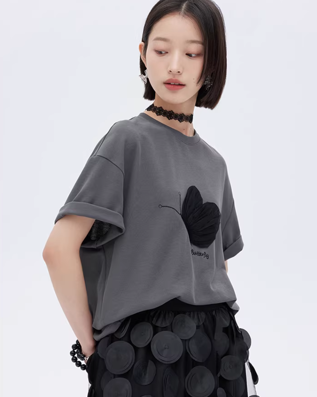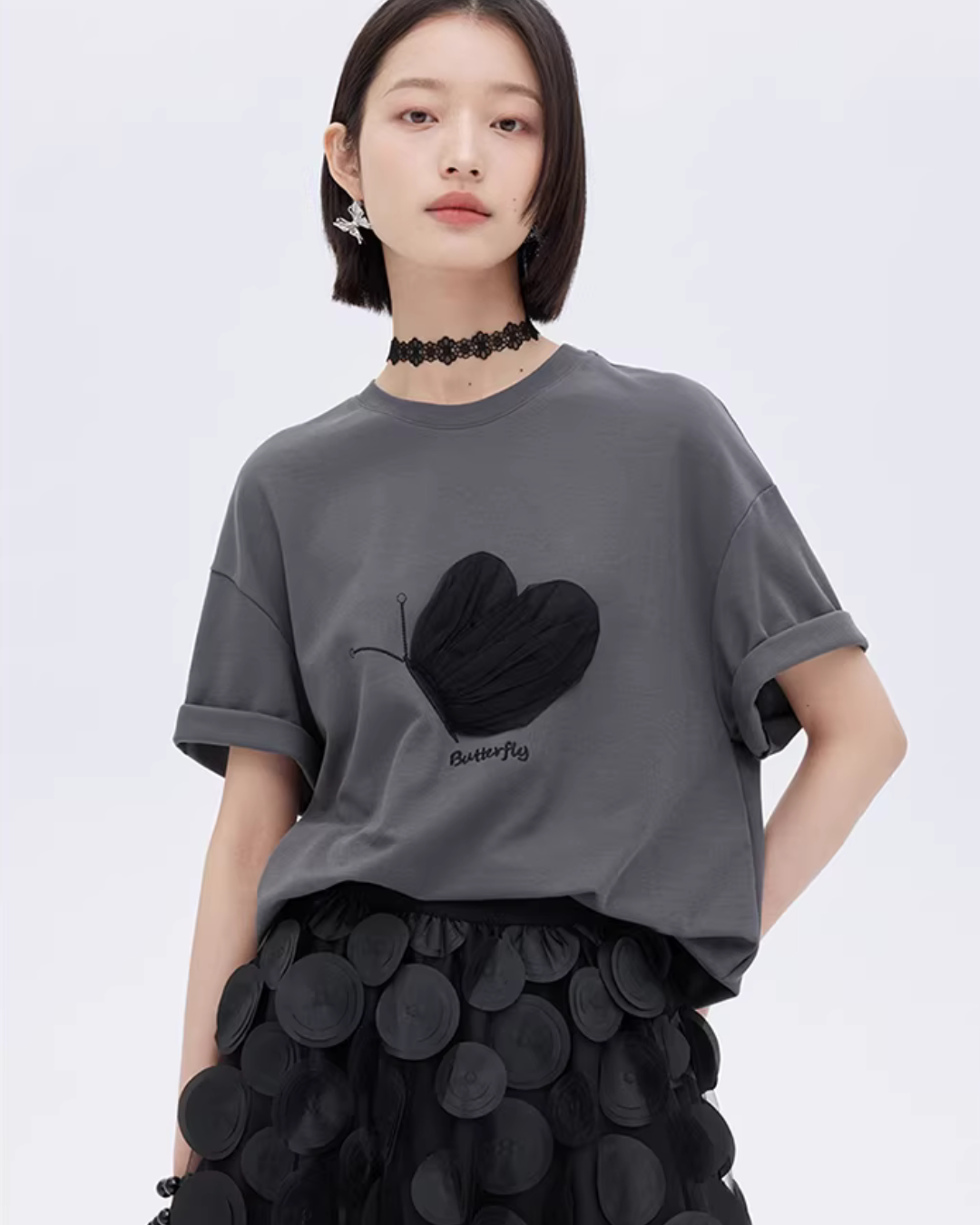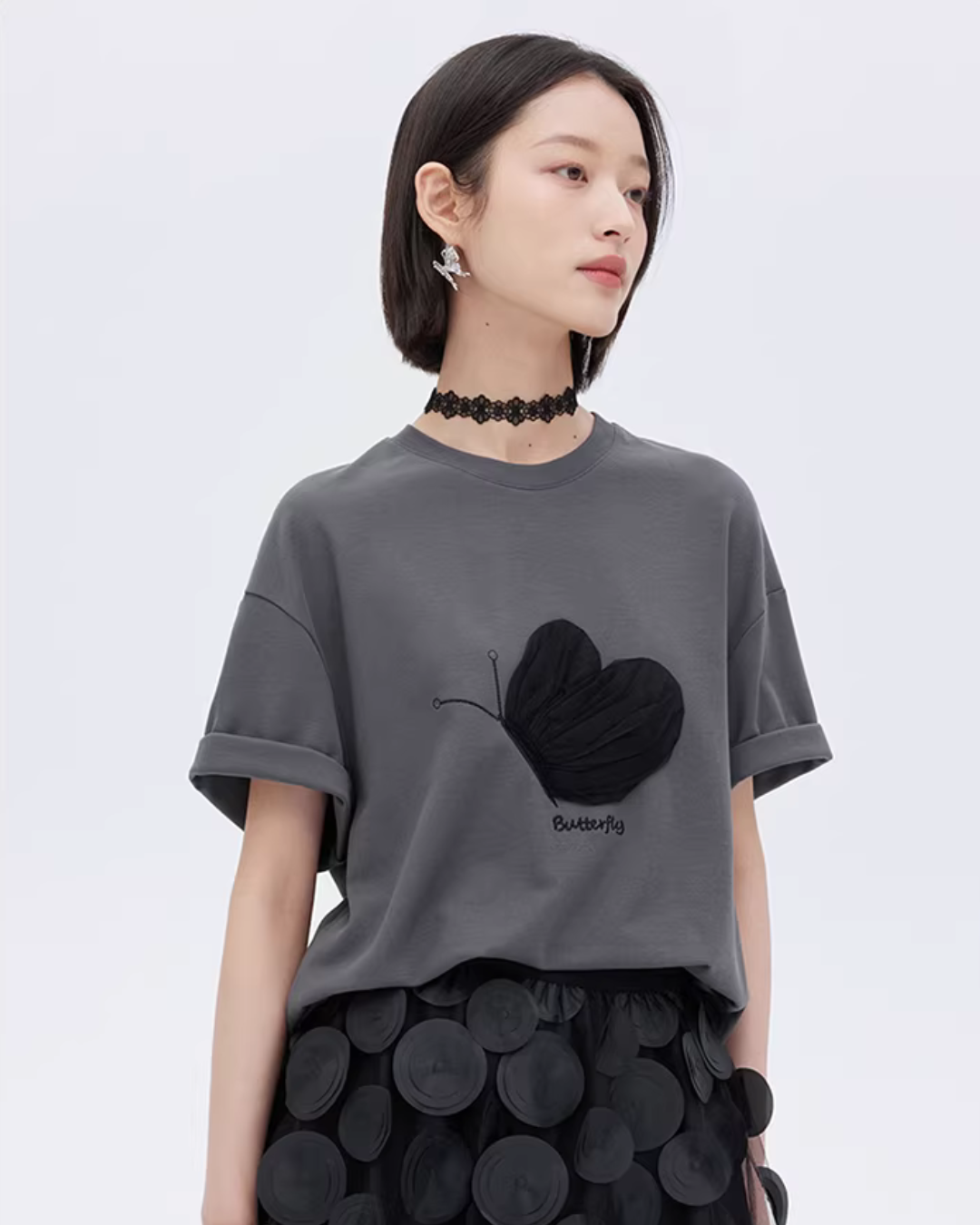 A half-sleeve T-shirt with a butterfly design that adds a mode nuance.
