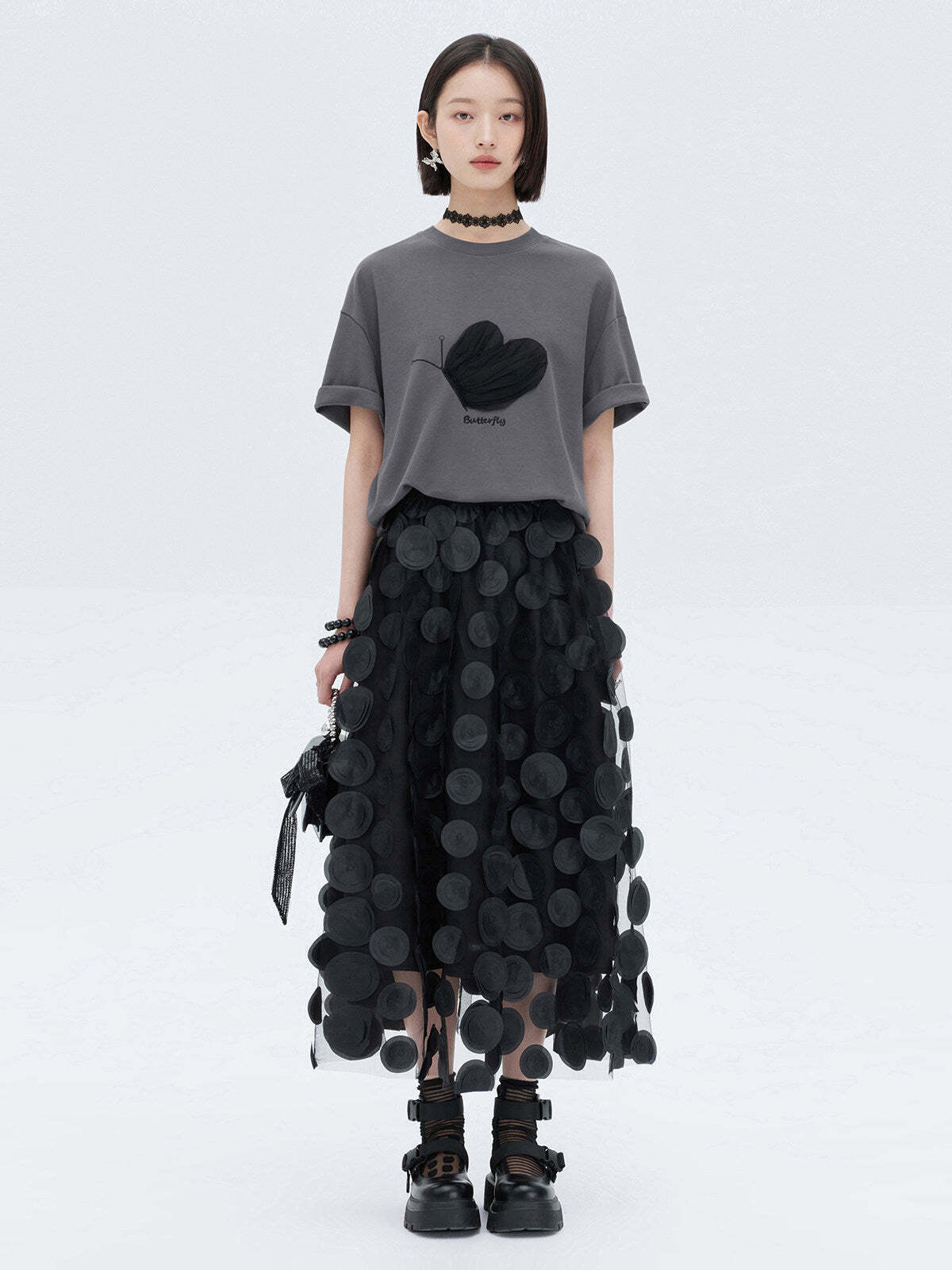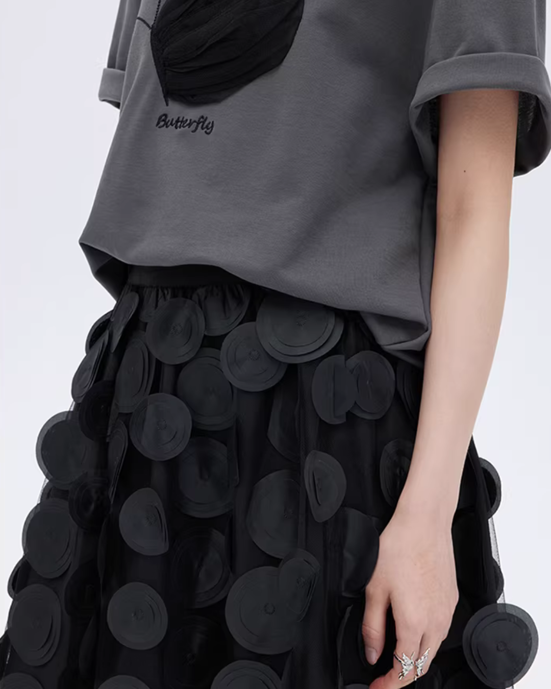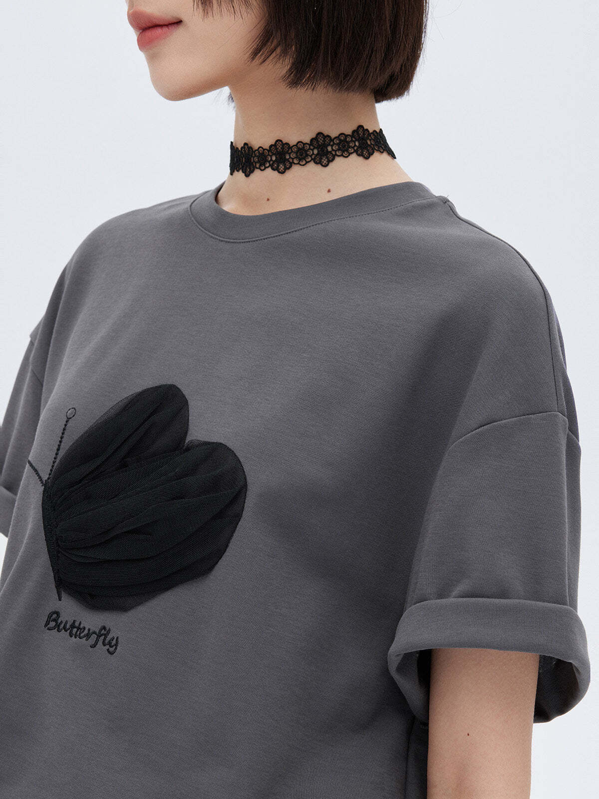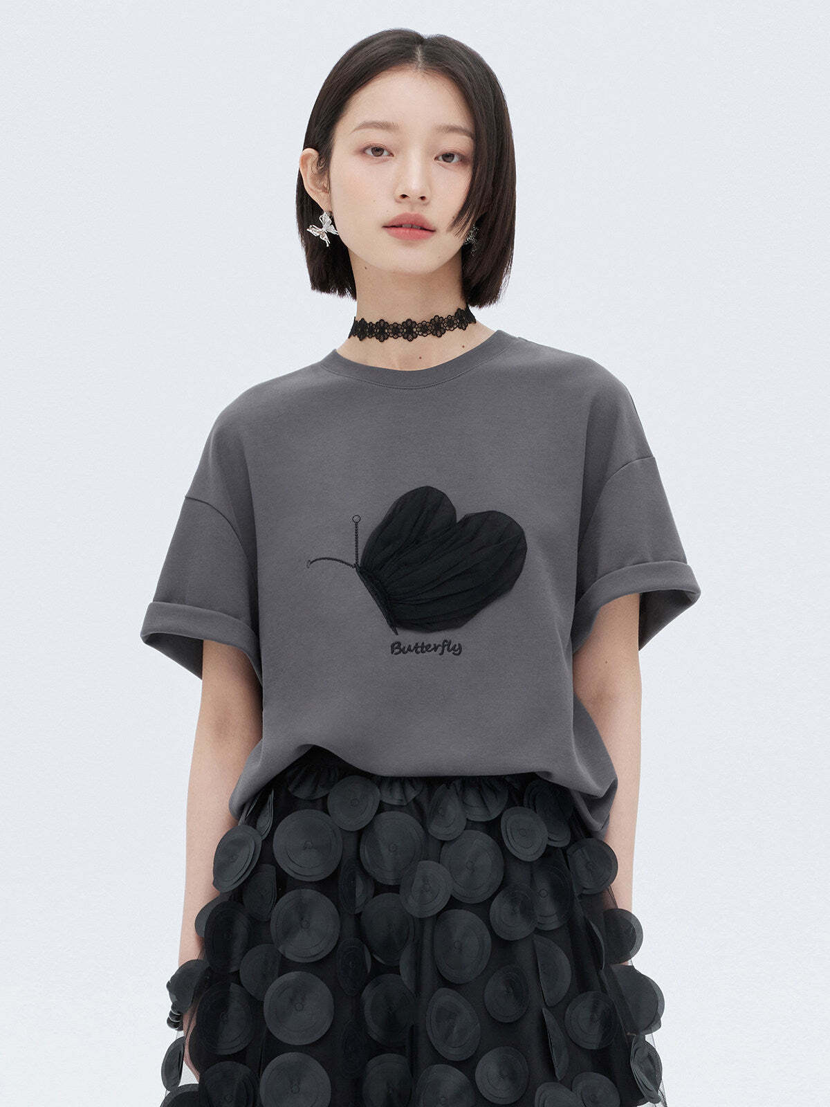 A half-sleeve T-shirt with a butterfly design that adds a mode nuance.
