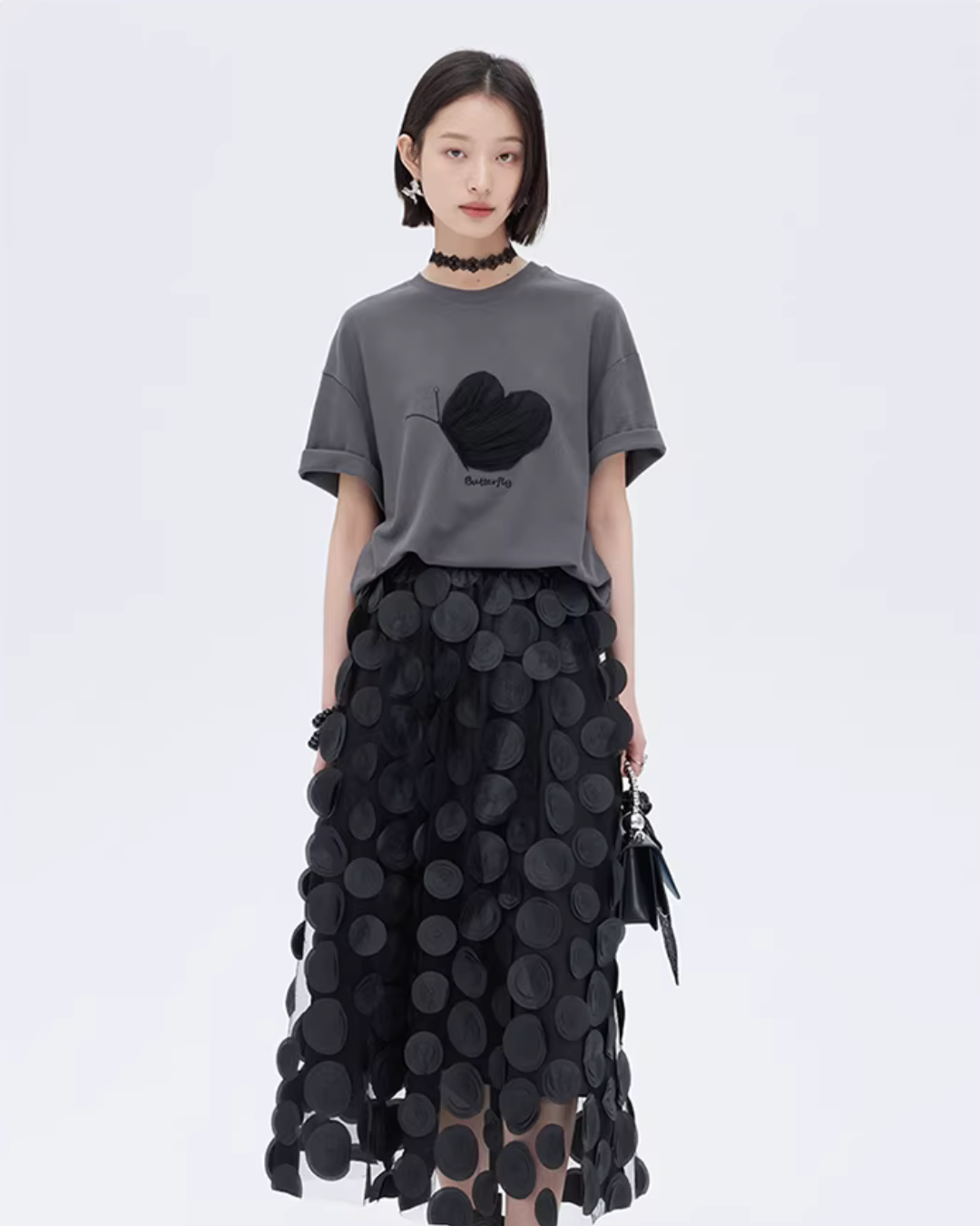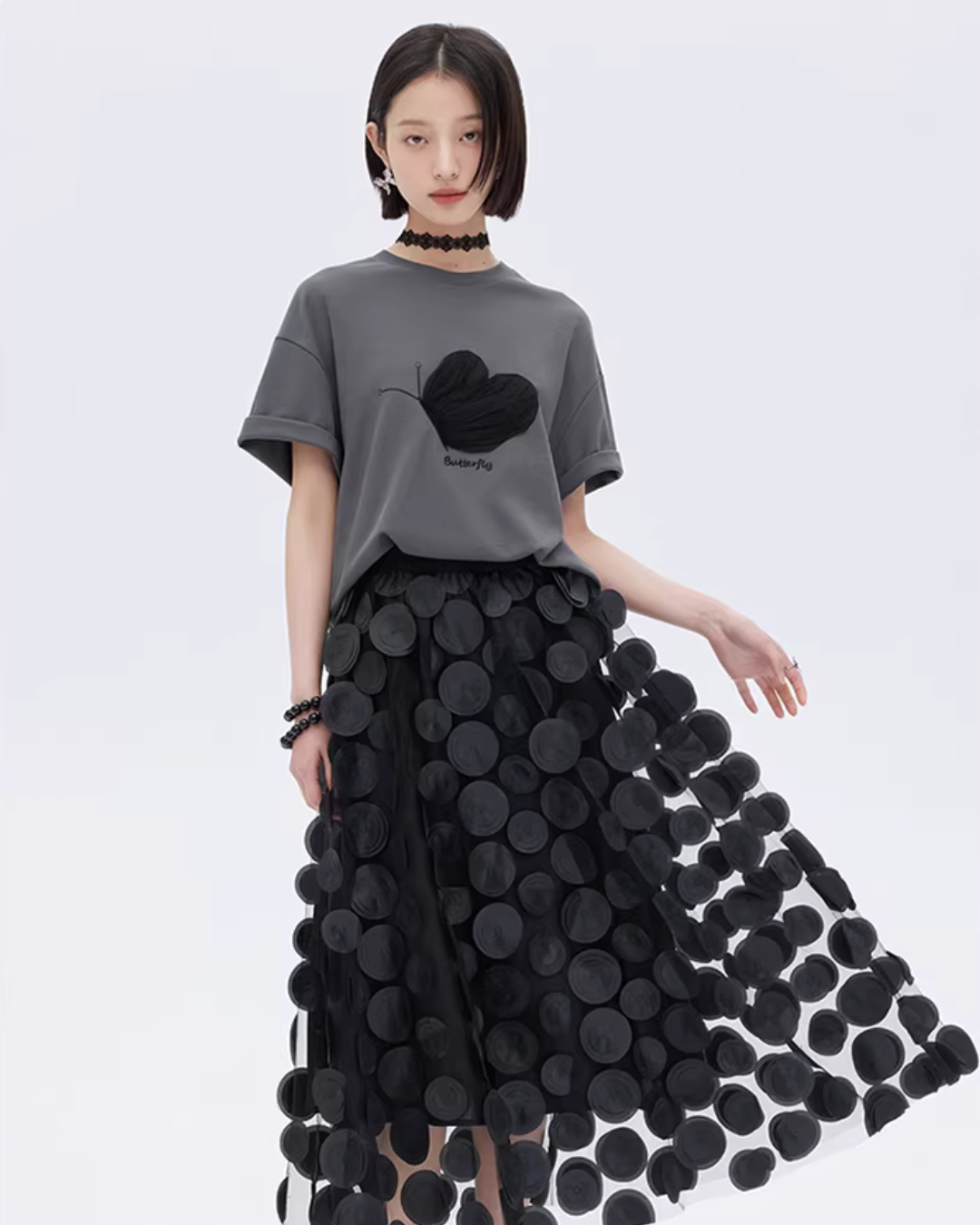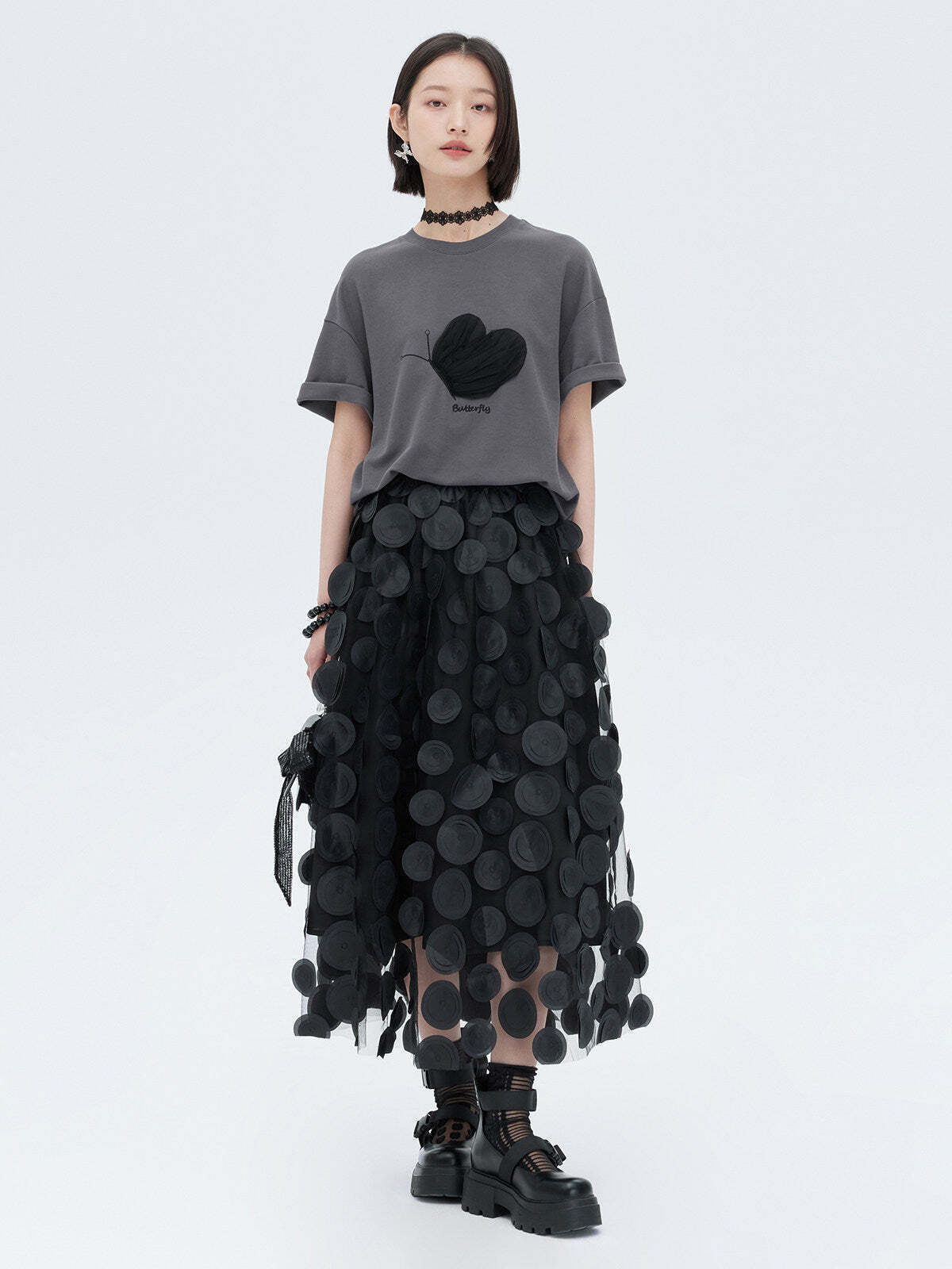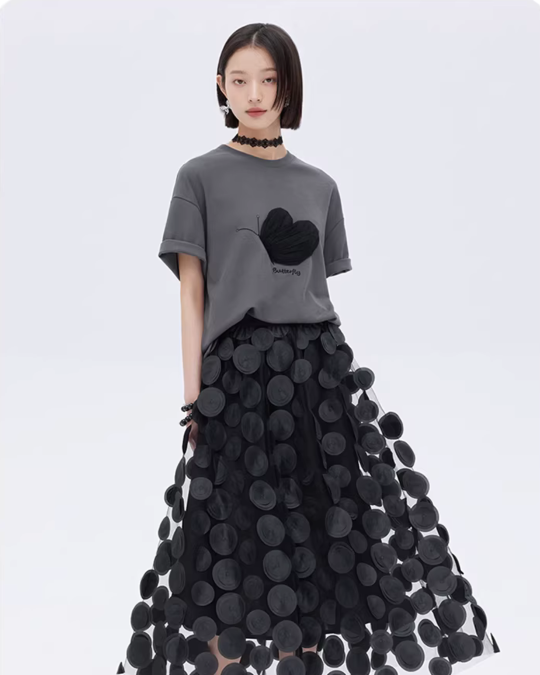 A half-sleeve T-shirt with a butterfly design that adds a mode nuance.