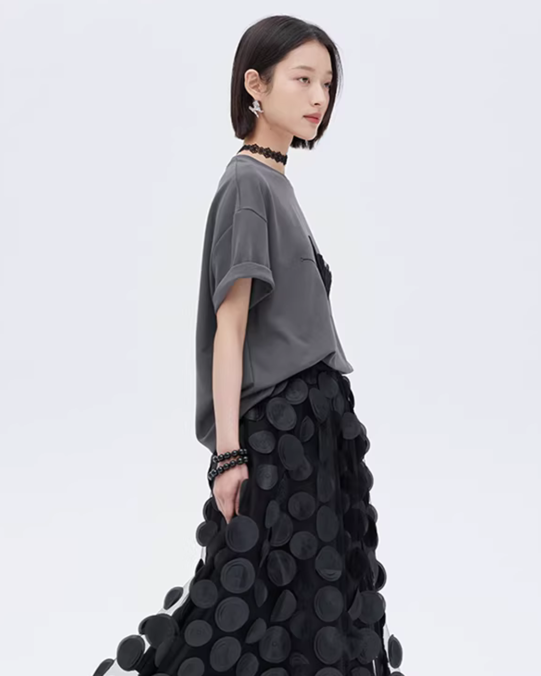 With a chic color scheme, it creates an adult casual style that suppresses sweetness.