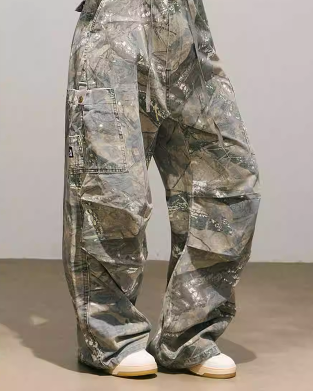 A pair of camouflage cargo pants that exudes a subtly vintage-like texture.