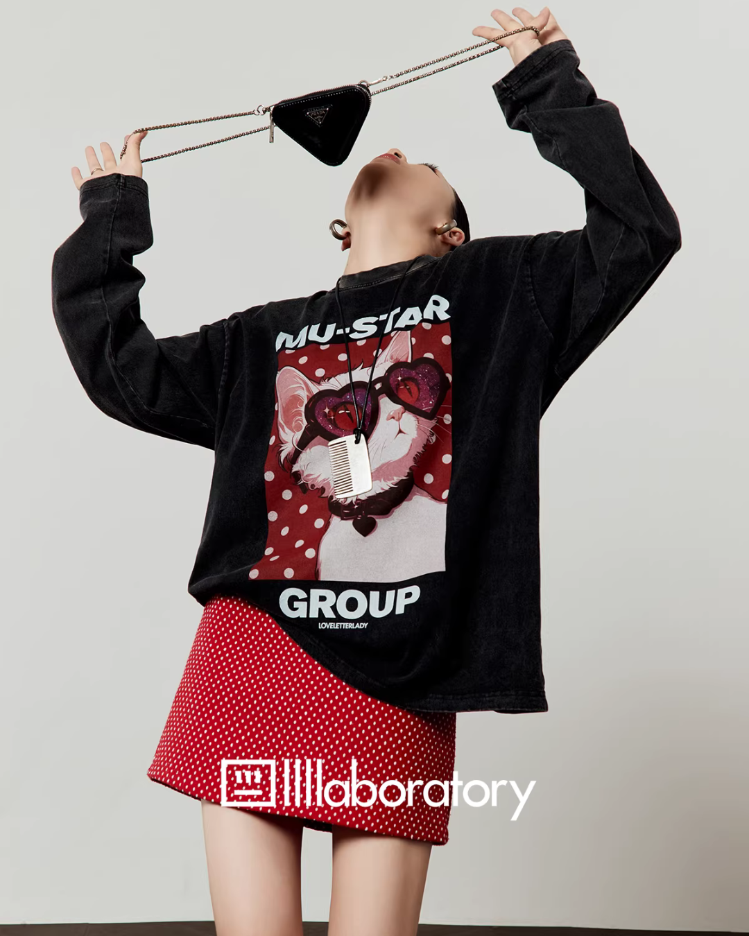 A striking cat print catches the eye, a long-sleeve top and skirt set.