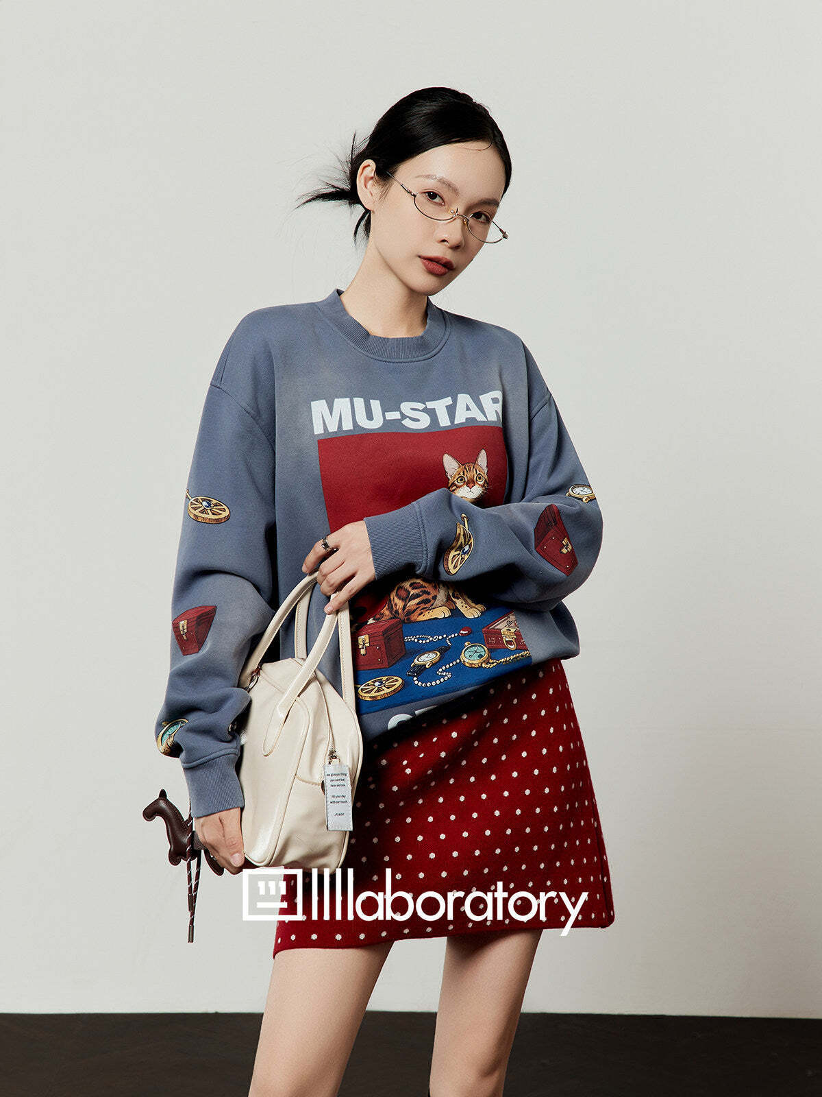 With a moderately loose combination of sweatshirt and skirt, it creates a relaxed look.