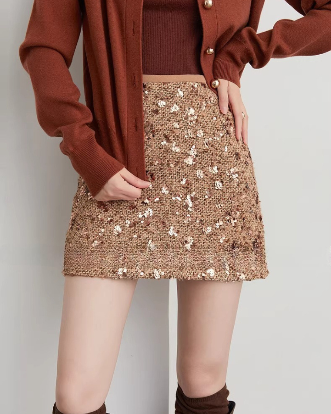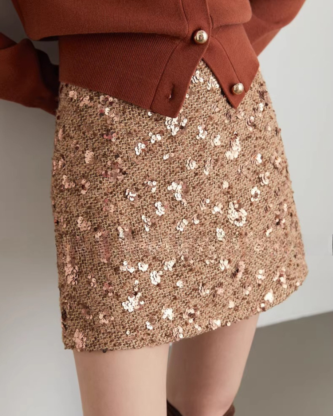 A mini skirt with a rich atmosphere adorned with sequins.