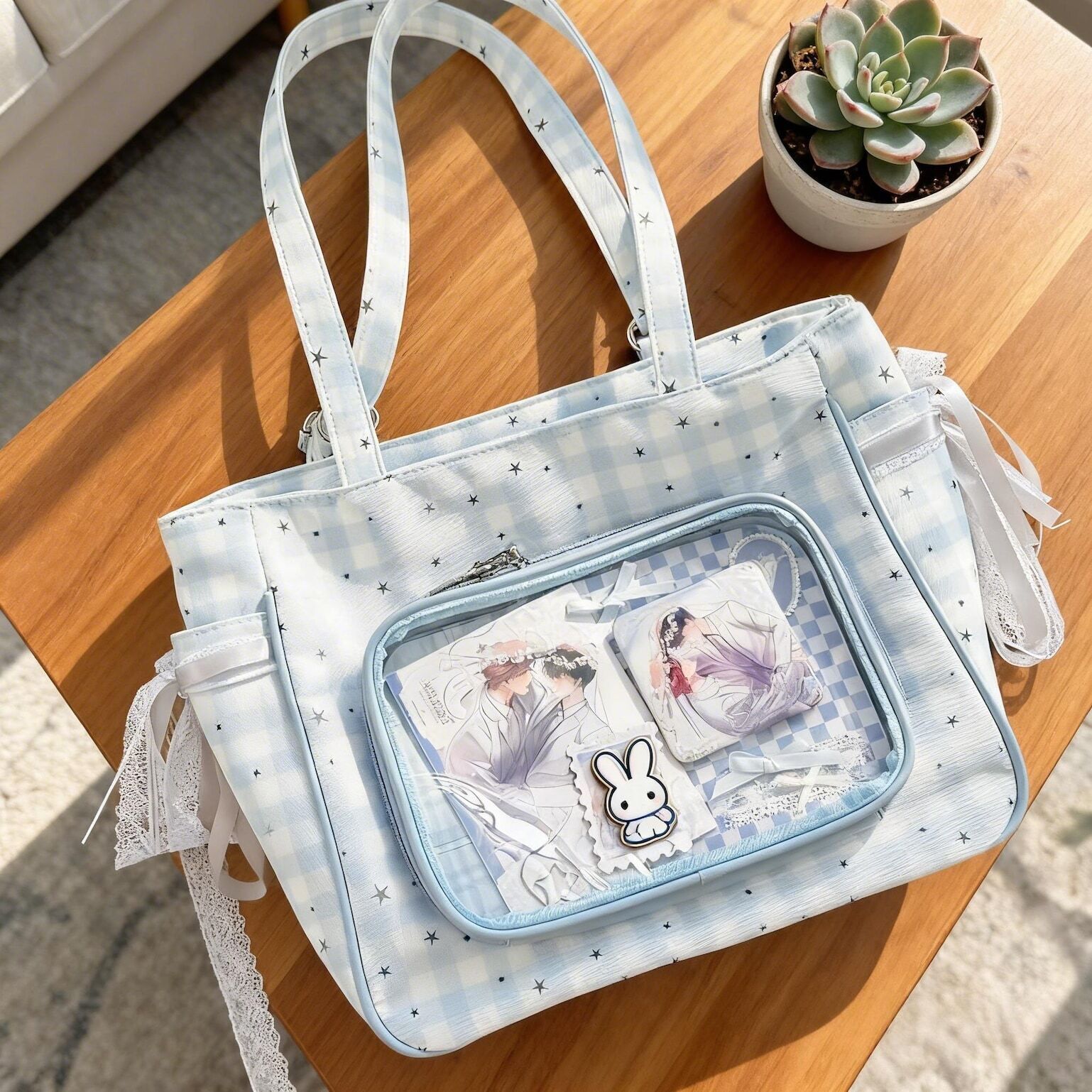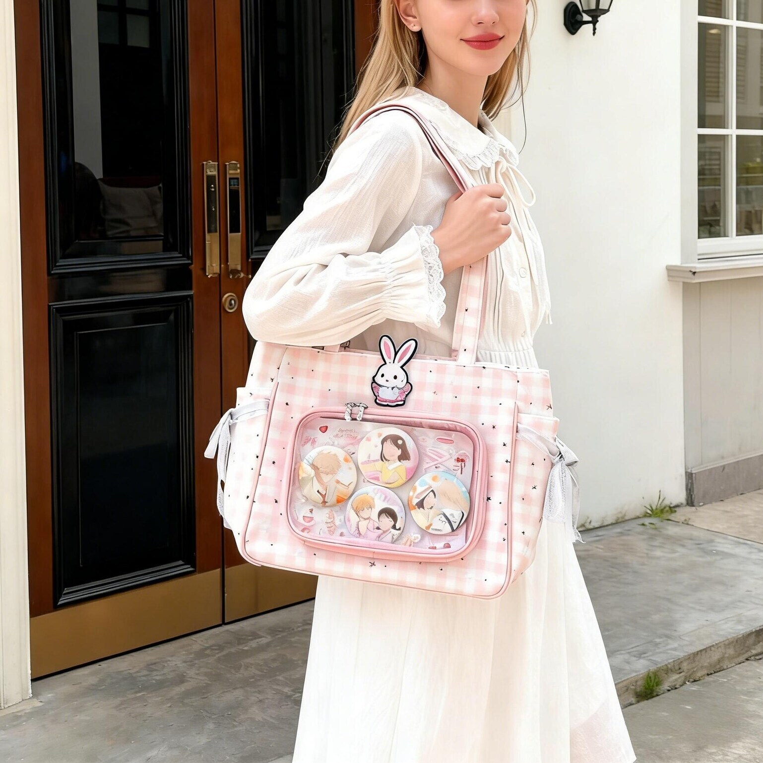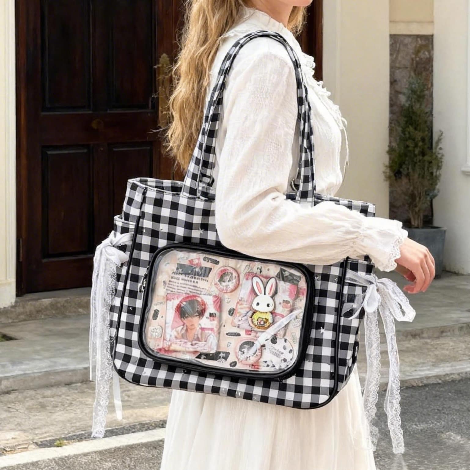 Checkerboard Lace Ita Shoulder Bag for Pin Display combines everyday carry with a clear display area for pins, badges, charms, or character merch.