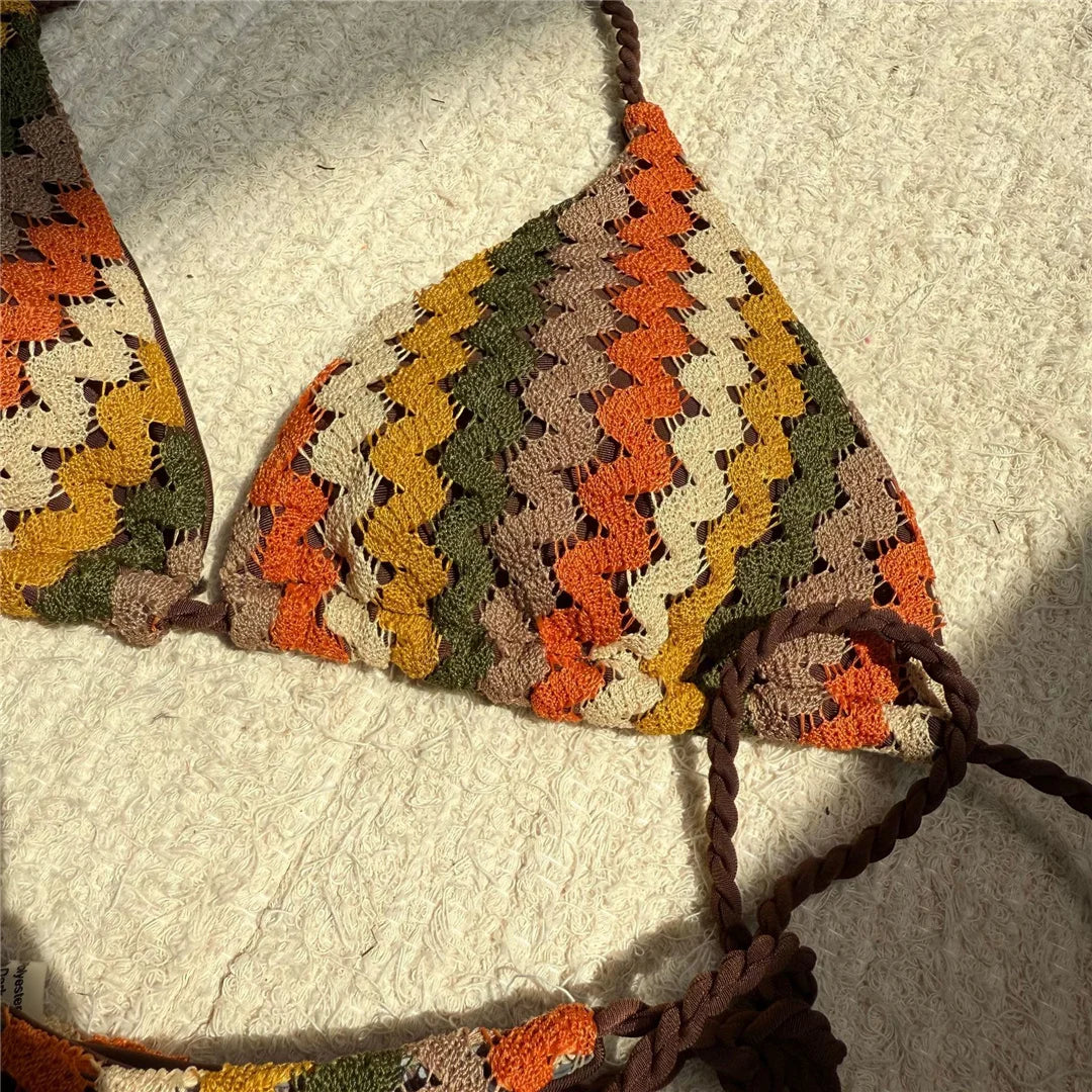 The Chevron Triangle Bikini Set is designed as a two piece swim set featuring a classic triangle bikini top with a bold chevron knit pattern. The halter neck and back ties allow an adjustable fit while maintaining a minimal silhouette. The matching bikini bottom includes tie side straps that highlight the waistline and create a flattering high cut shape. Crafted from stretch swim fabric, this bikini set offers comfort and flexibility for beachwear, vacation styling, and poolside looks.