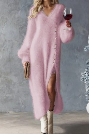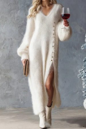 Chic Split Knitted Dress With Buttons Design Winter V-Neck Fleece Maxi Dresses Evening Party Club Fashion Women’s Clothing