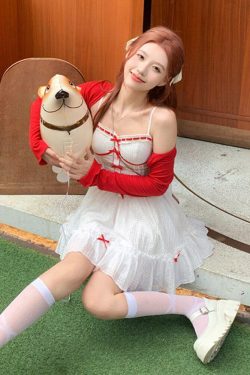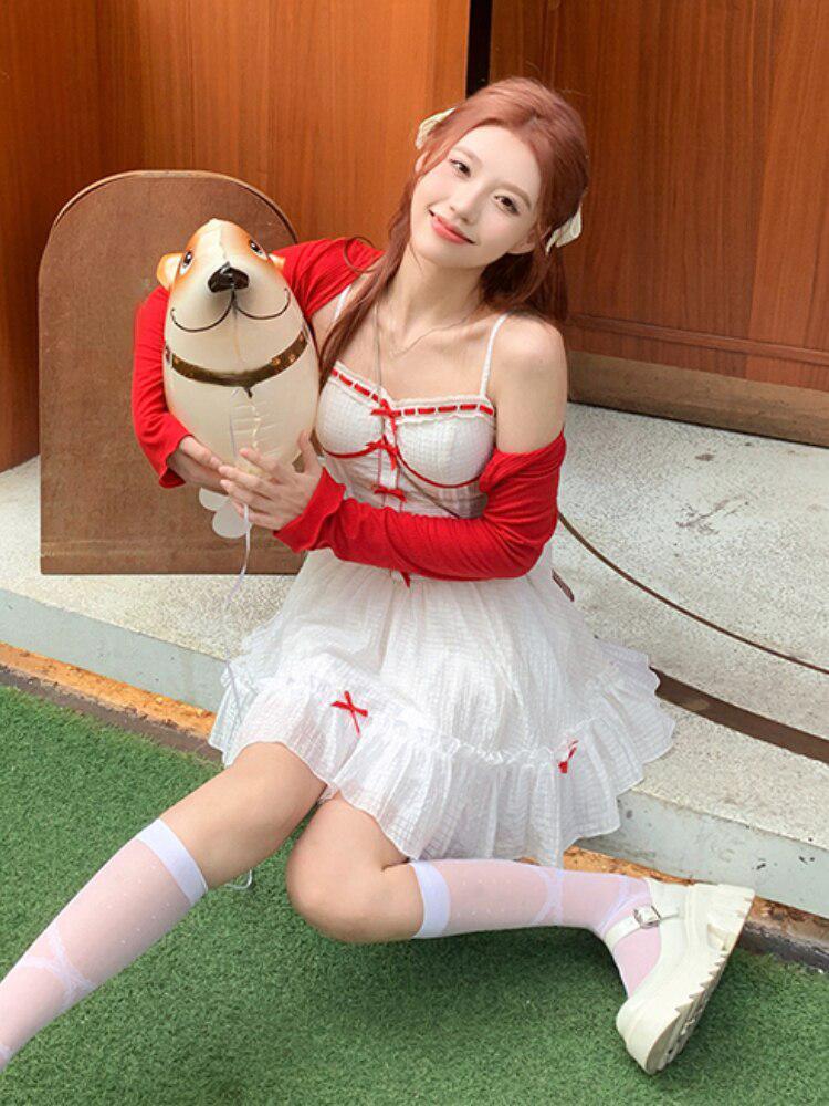 Unleash your inner coquette with this charming mini dress and cardigan set. The dress, adorned with red ribbon details, features a square neckline and frilled hem, epitomizing the coquette aesthetic. The included red crop cardigan is knitted to provide warmth and style. For a better fit, consider ordering one size larger.