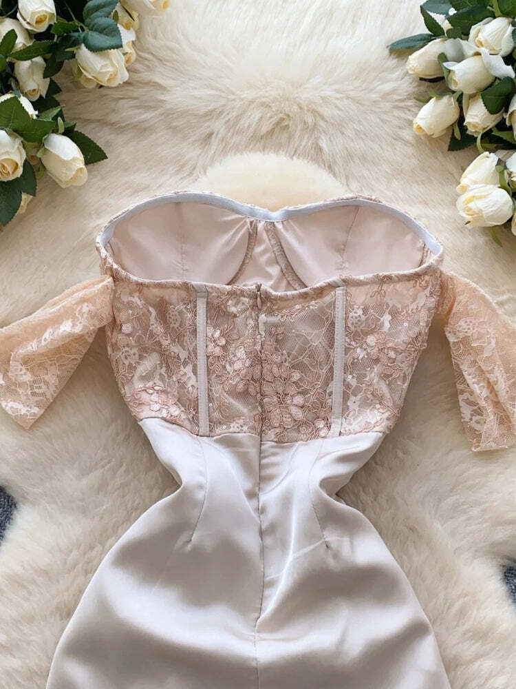 A stunning maxi dress with a lace corset bodice and off-shoulder sleeves for an elegant, feminine look. The draped waist detail flows into a sleek floor-length silhouette, making it perfect for formal events, galas, or evening occasions.