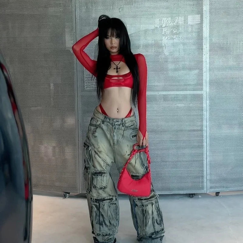 Cut-Out Sheer Mesh Crop Top is designed with a cropped silhouette and semi-transparent mesh fabric for a lightweight structure. The high neckline frames the upper body, while the front cut-out detail creates defined openings across the chest area. Long fitted sleeves provide full arm coverage. The stretch mesh construction allows flexibility and maintains a close fit without restricting movement.