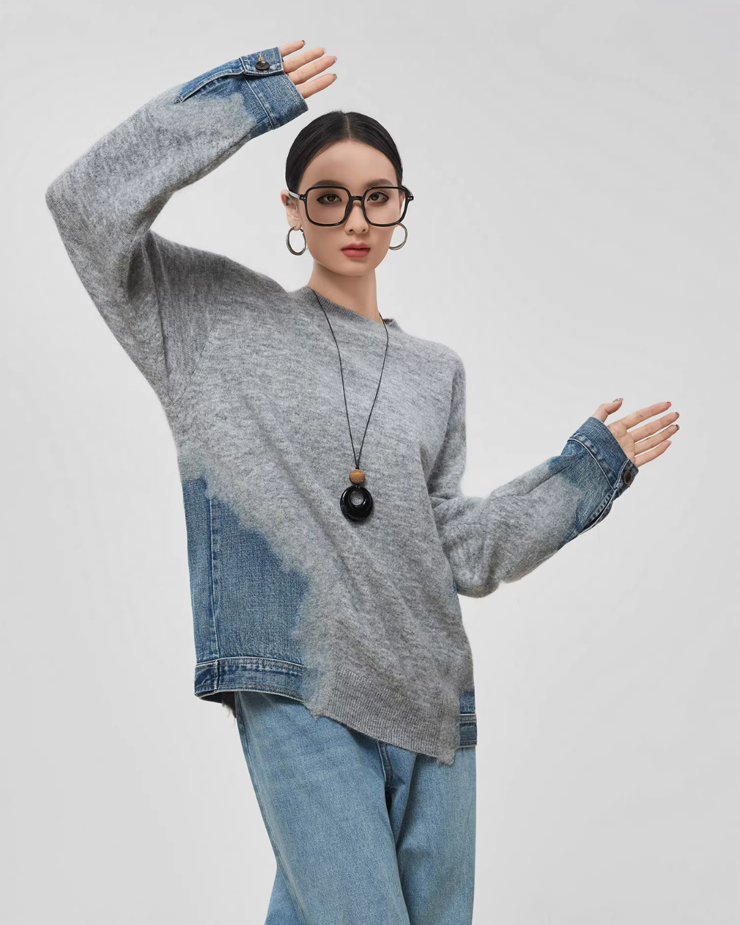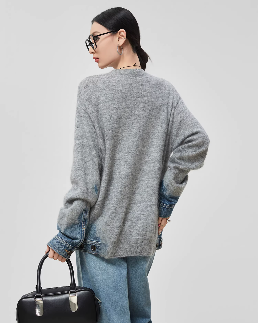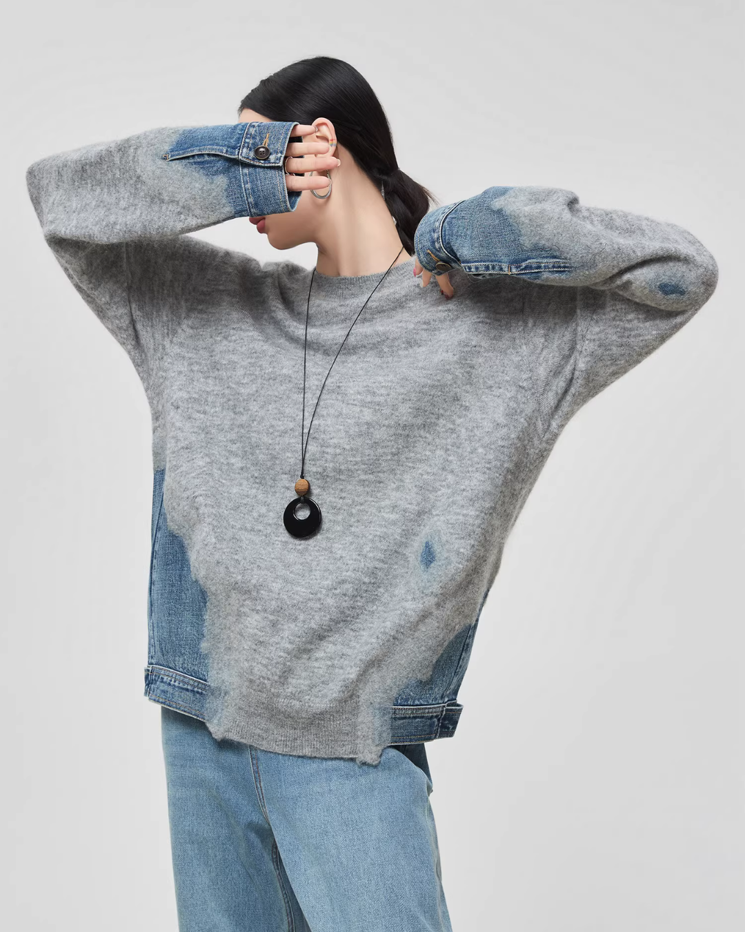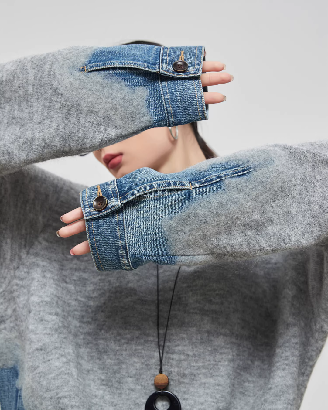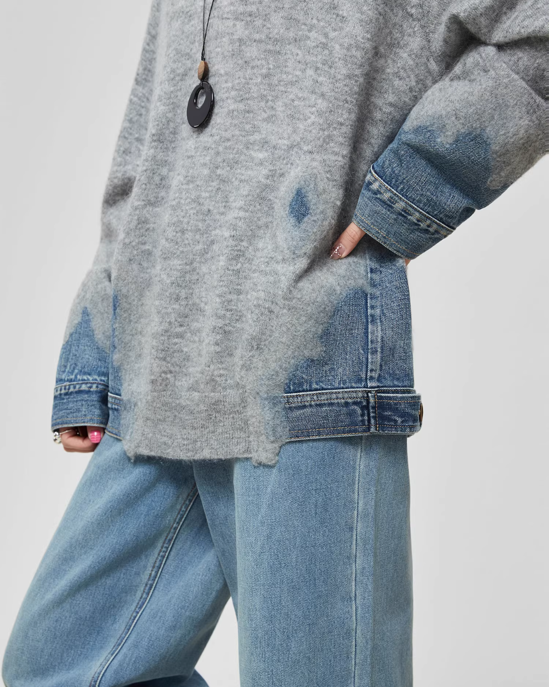 Design knit that combines soft knit material with denim fabric.