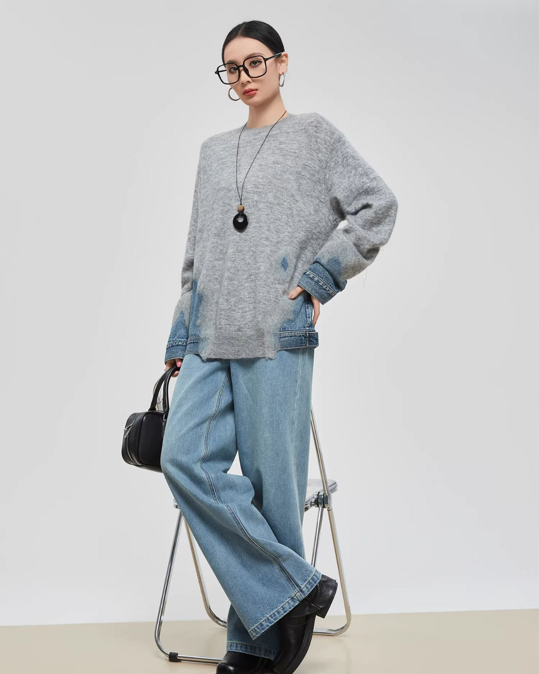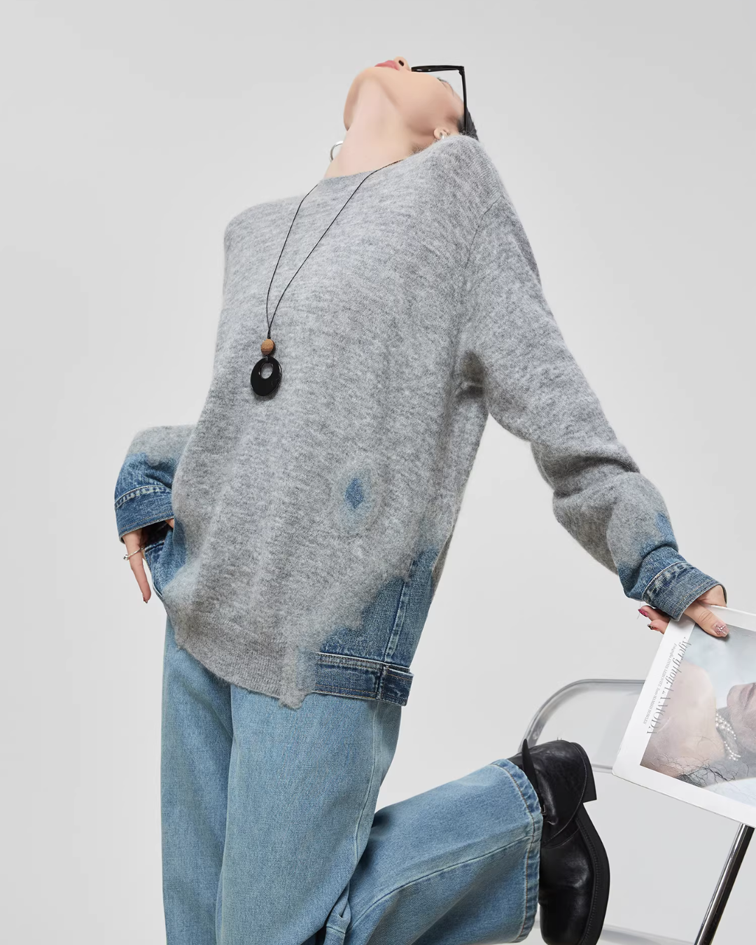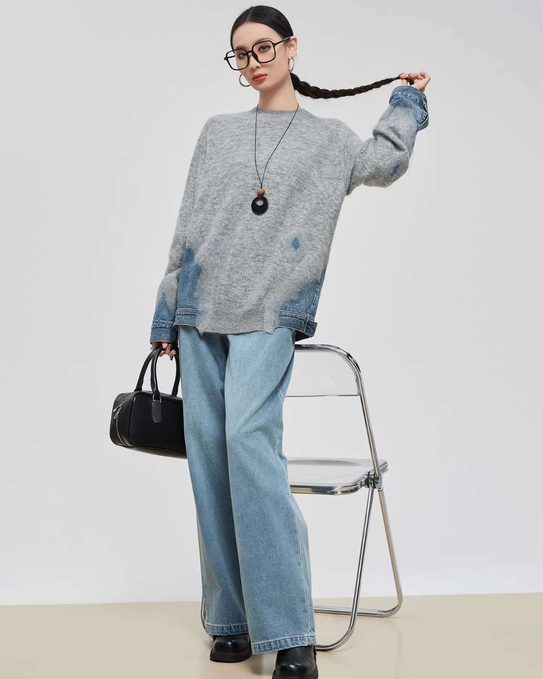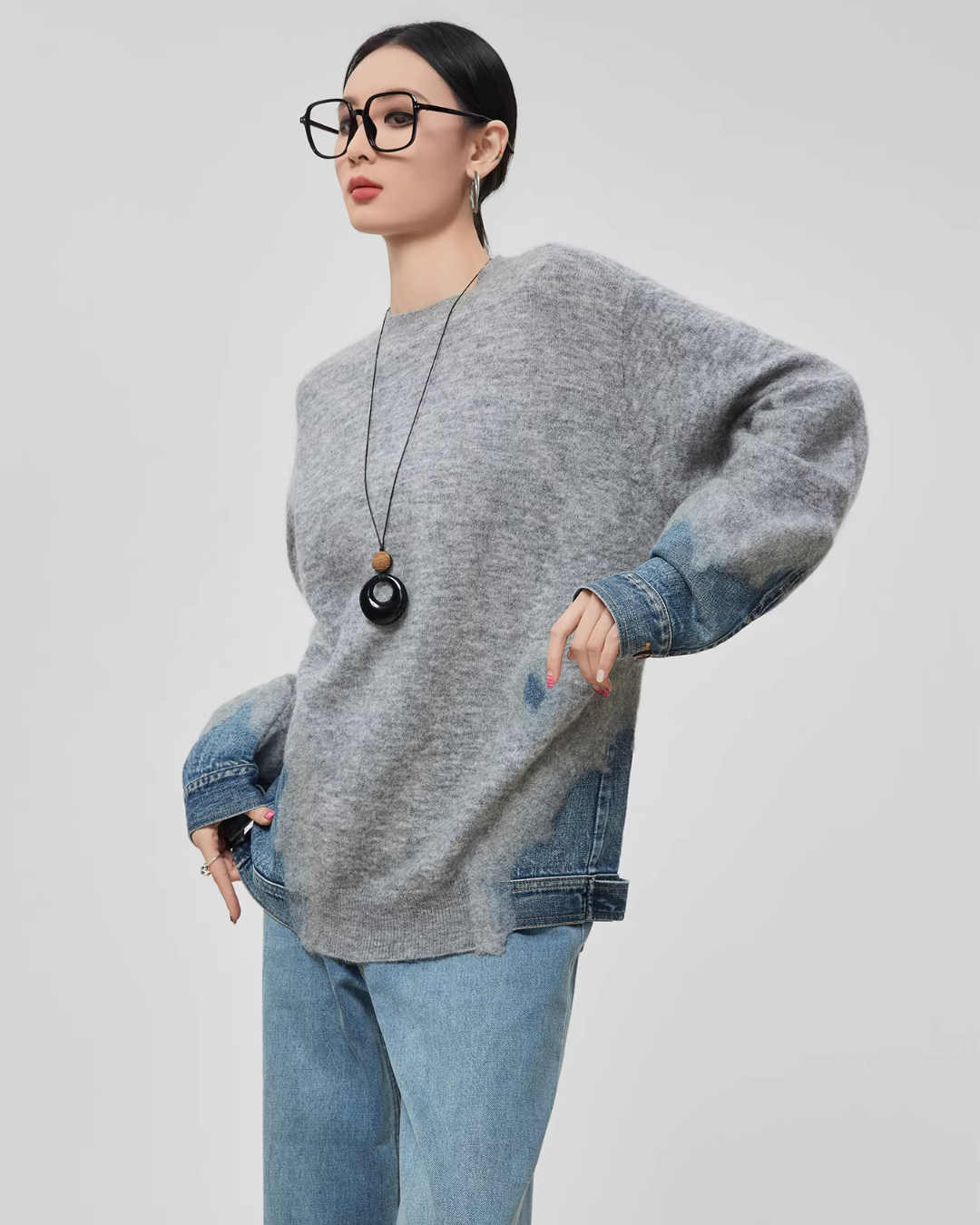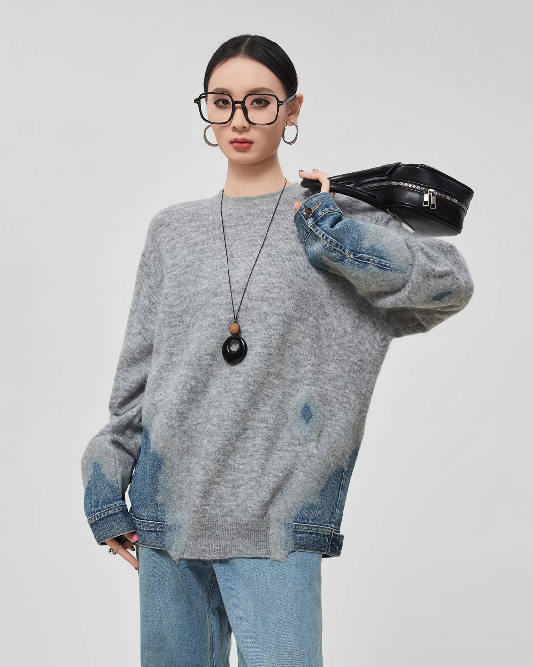 Design knit that combines soft knit material with denim fabric.