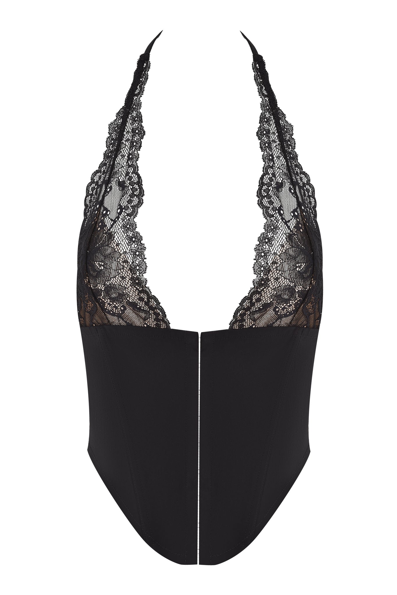 ELLENA WOVEN LACE HALTER CORSET – BLACK