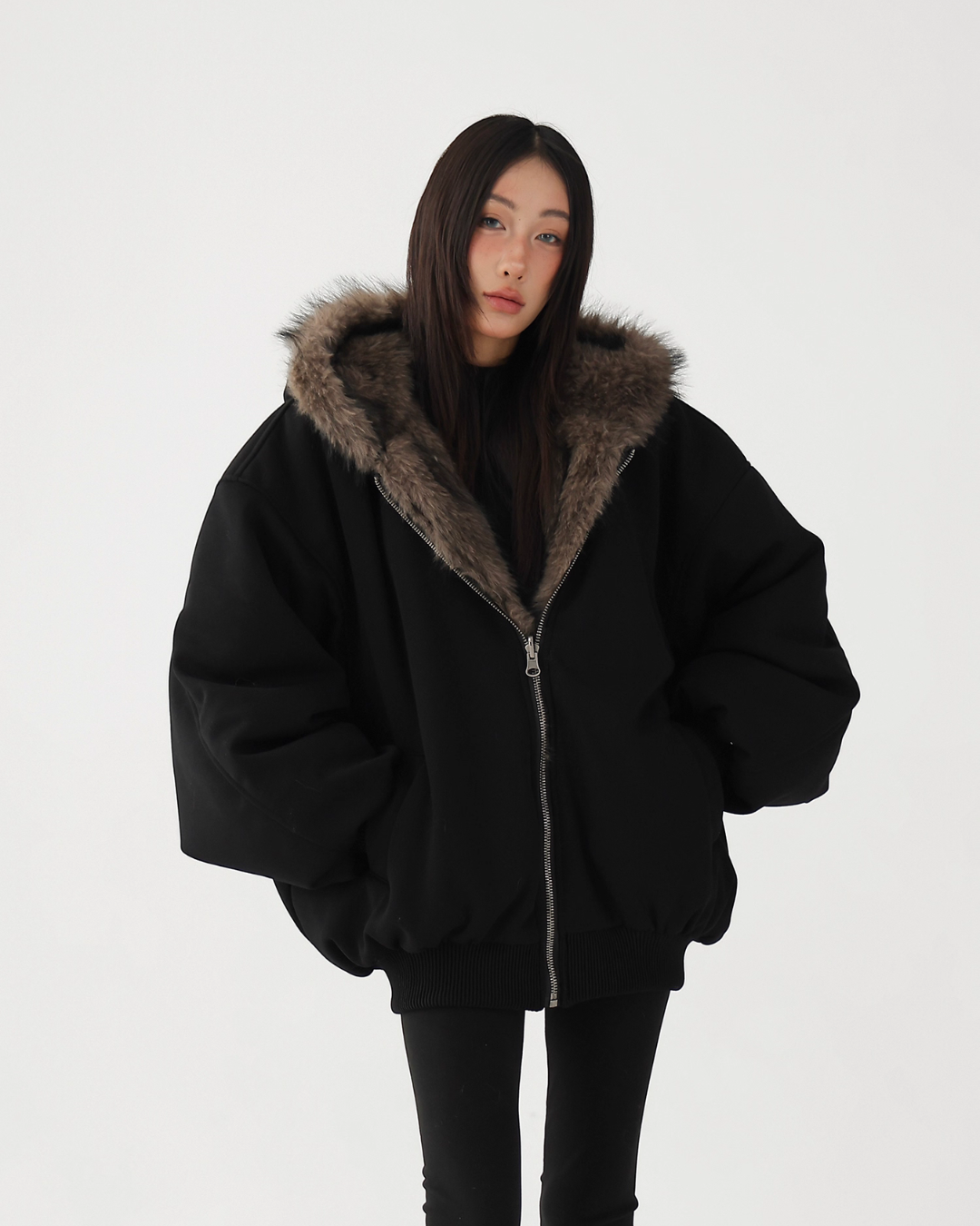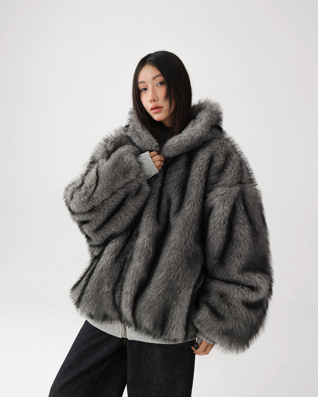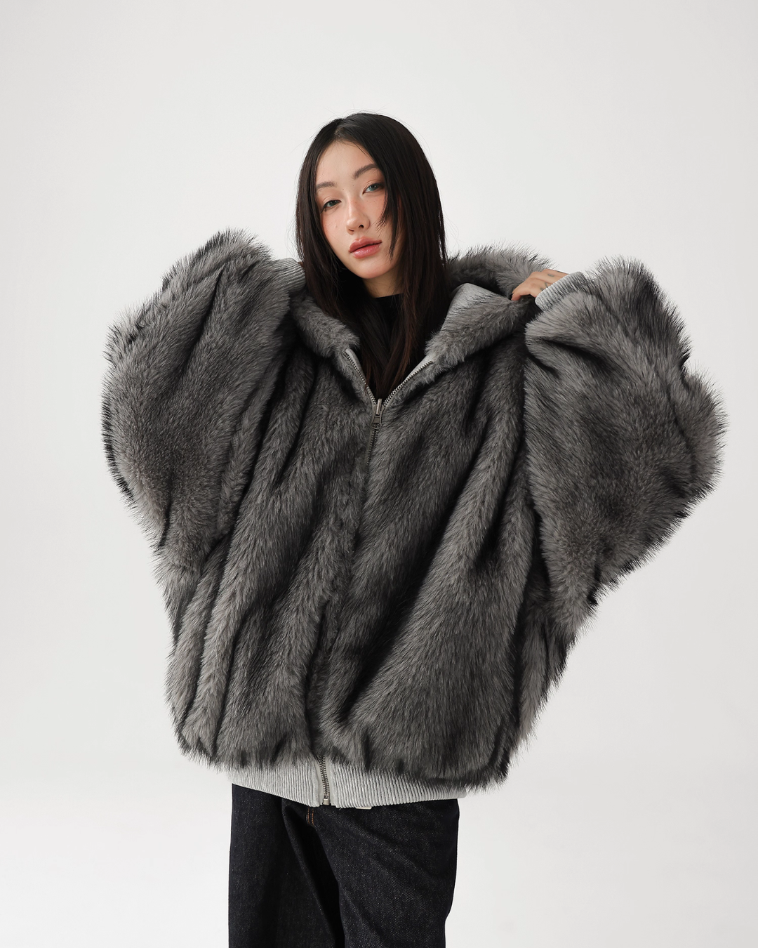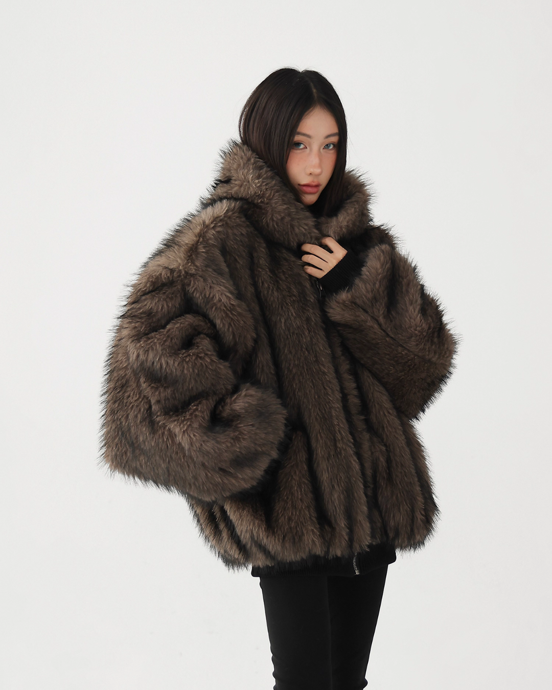 A voluminous fur jacket that emphasizes a heavy appearance.