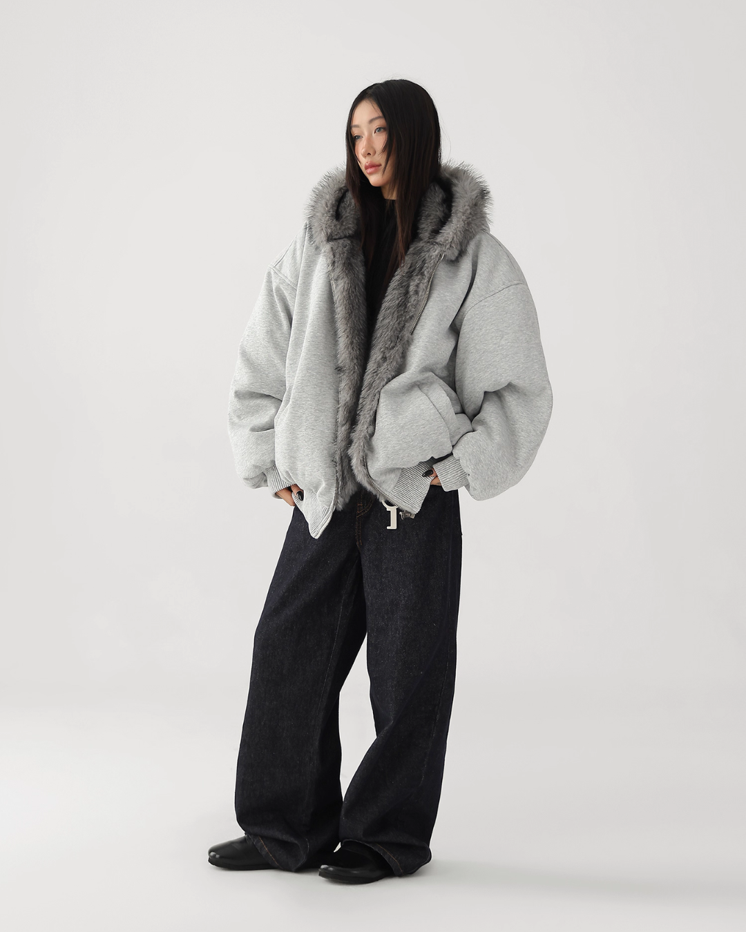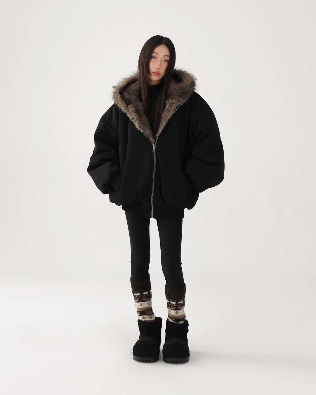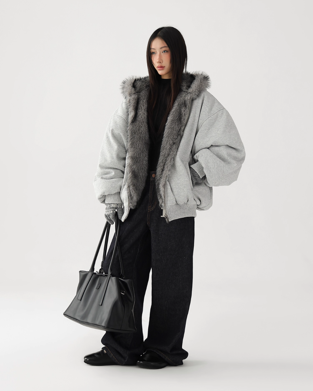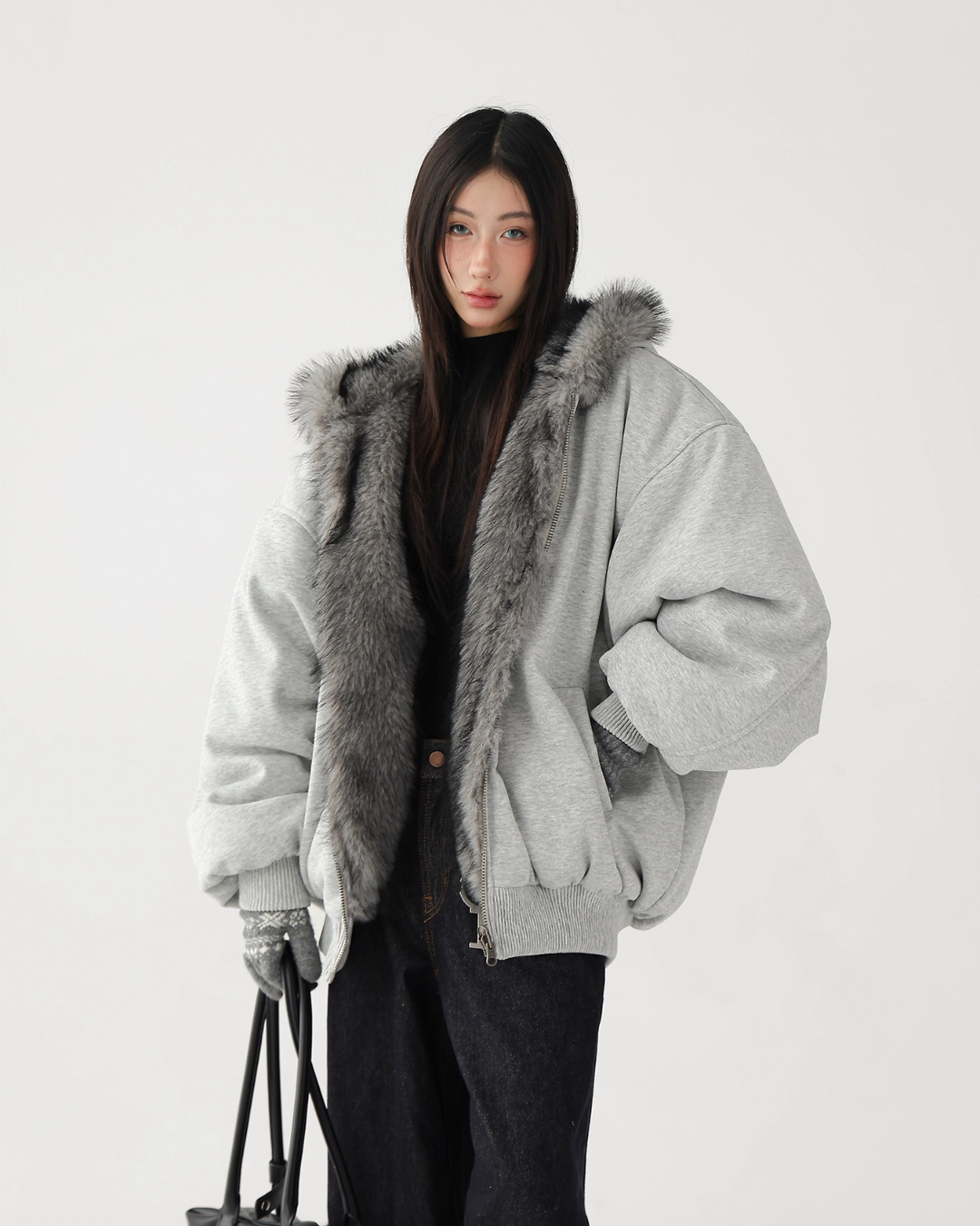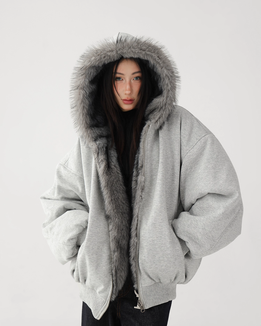 A voluminous fur jacket that emphasizes a heavy appearance.