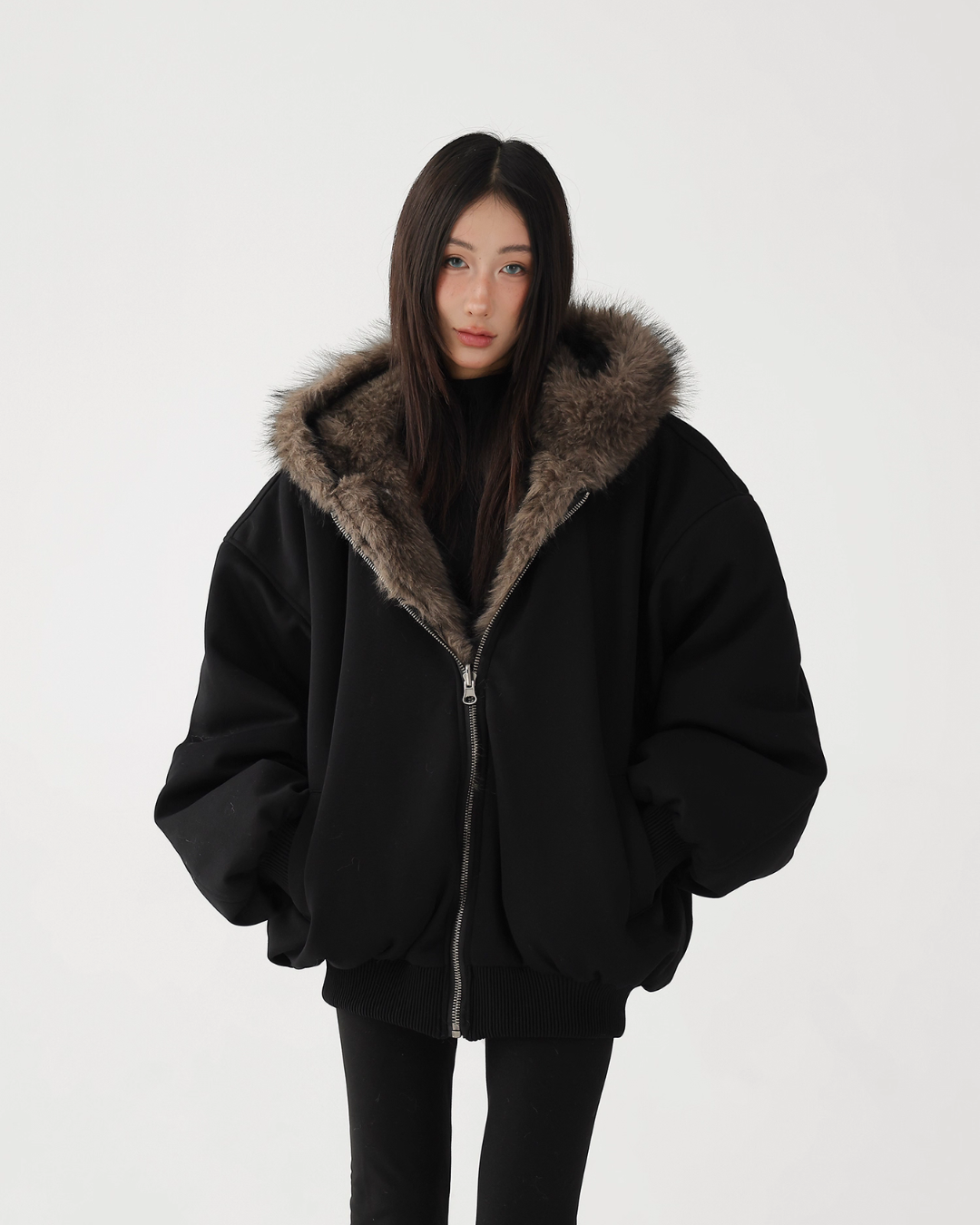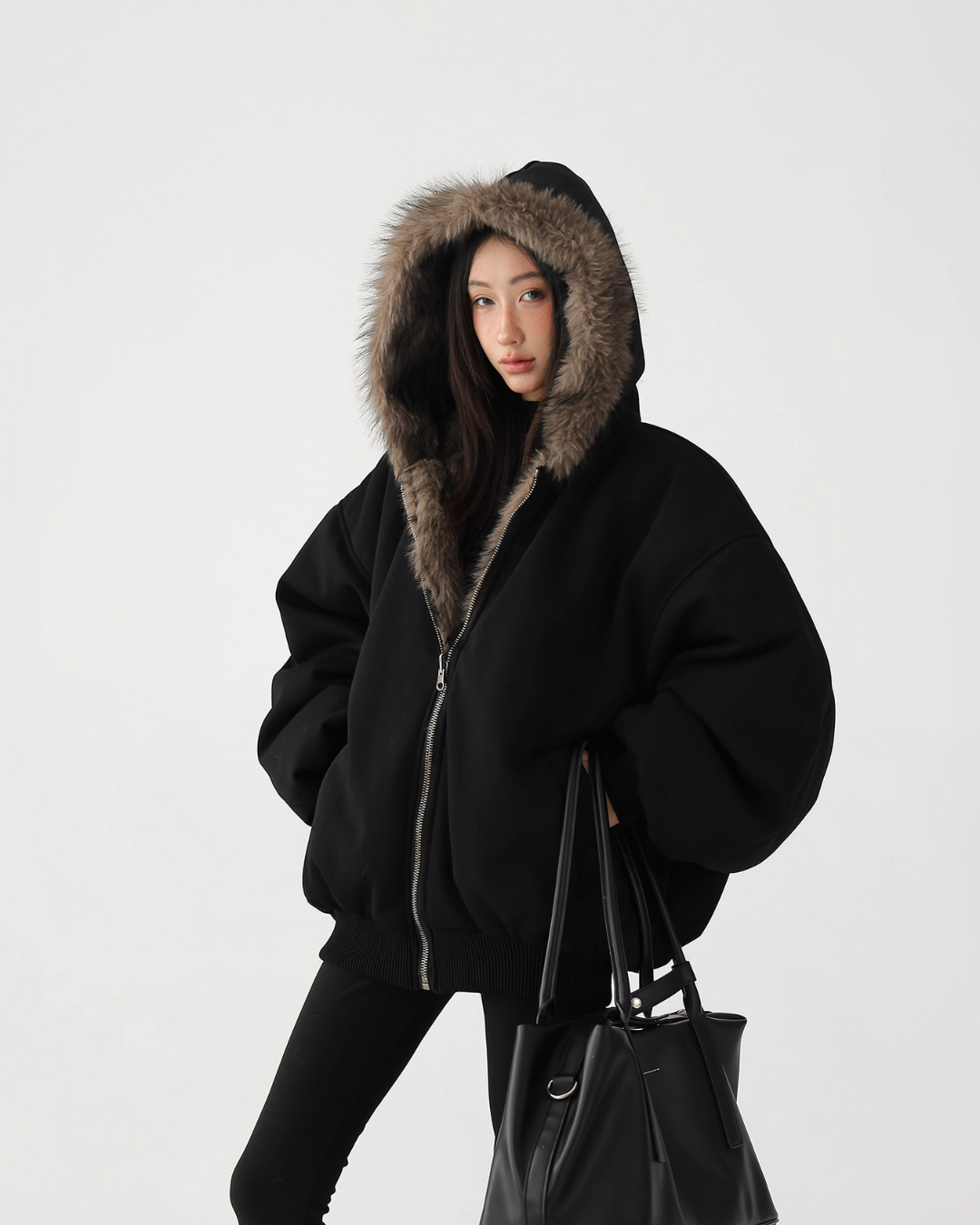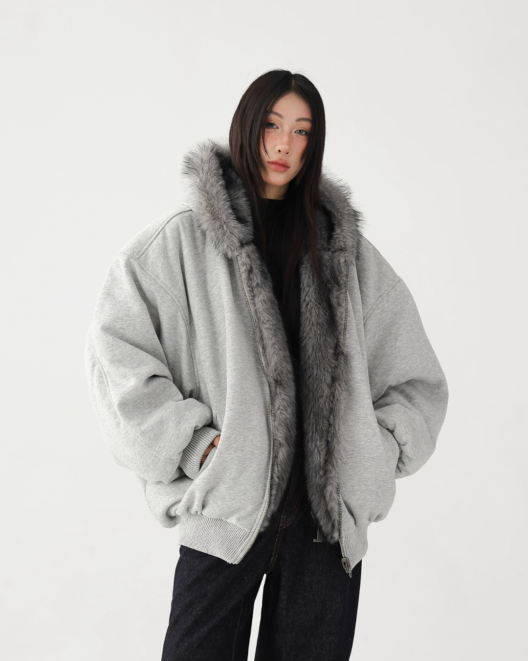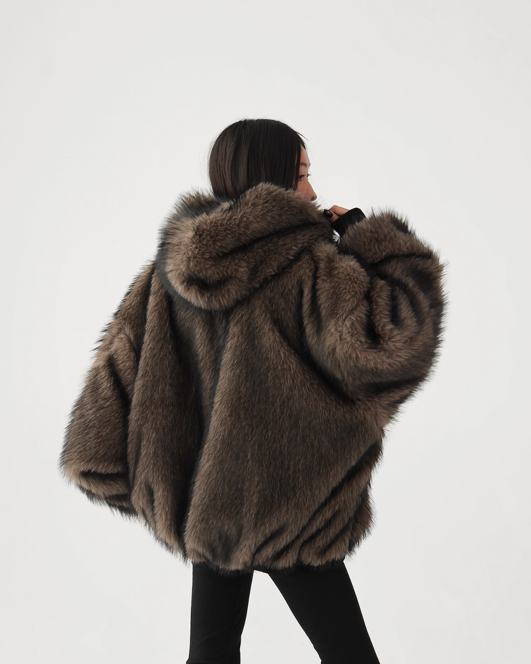 A voluminous fur jacket that emphasizes a heavy appearance.