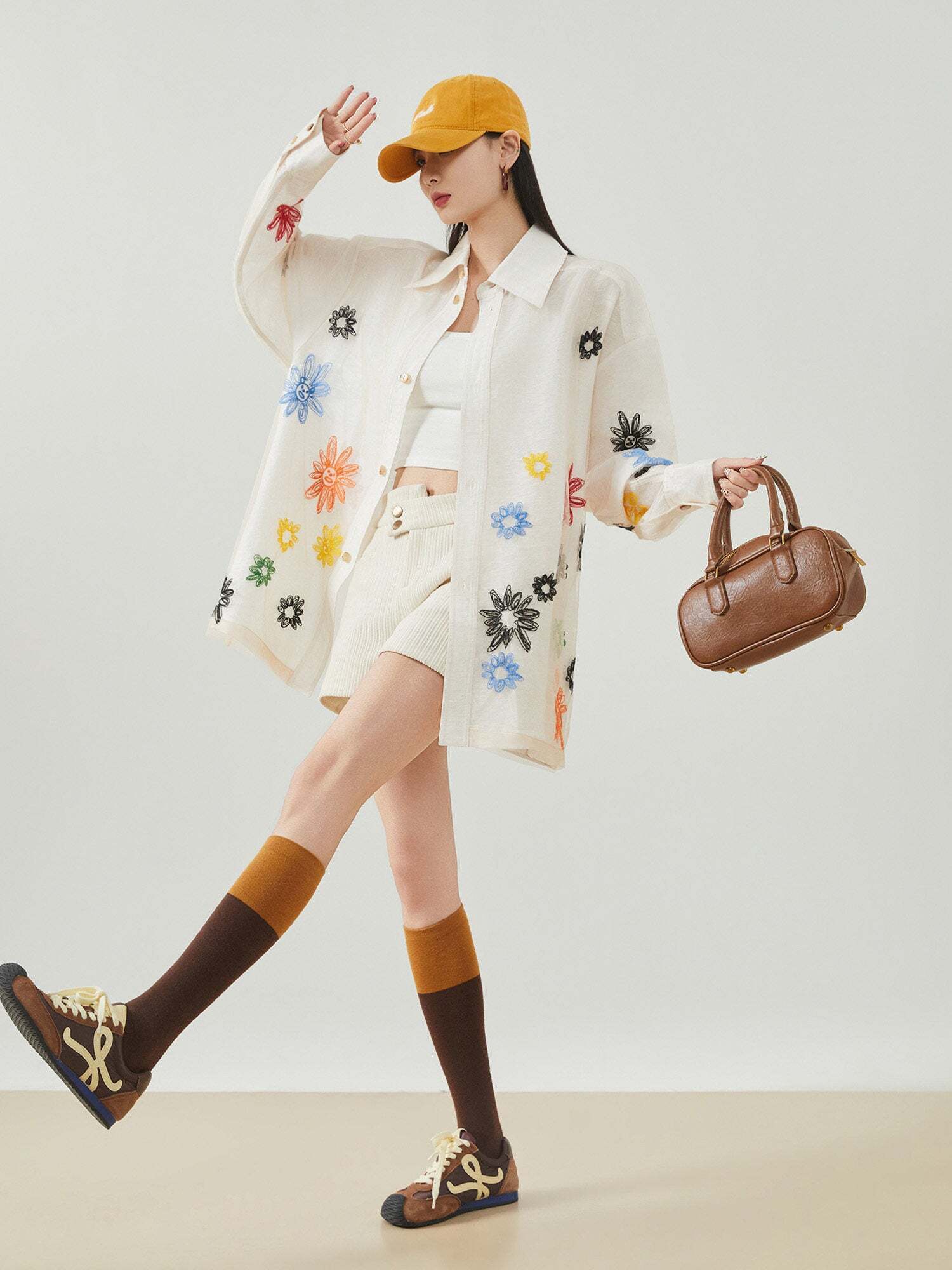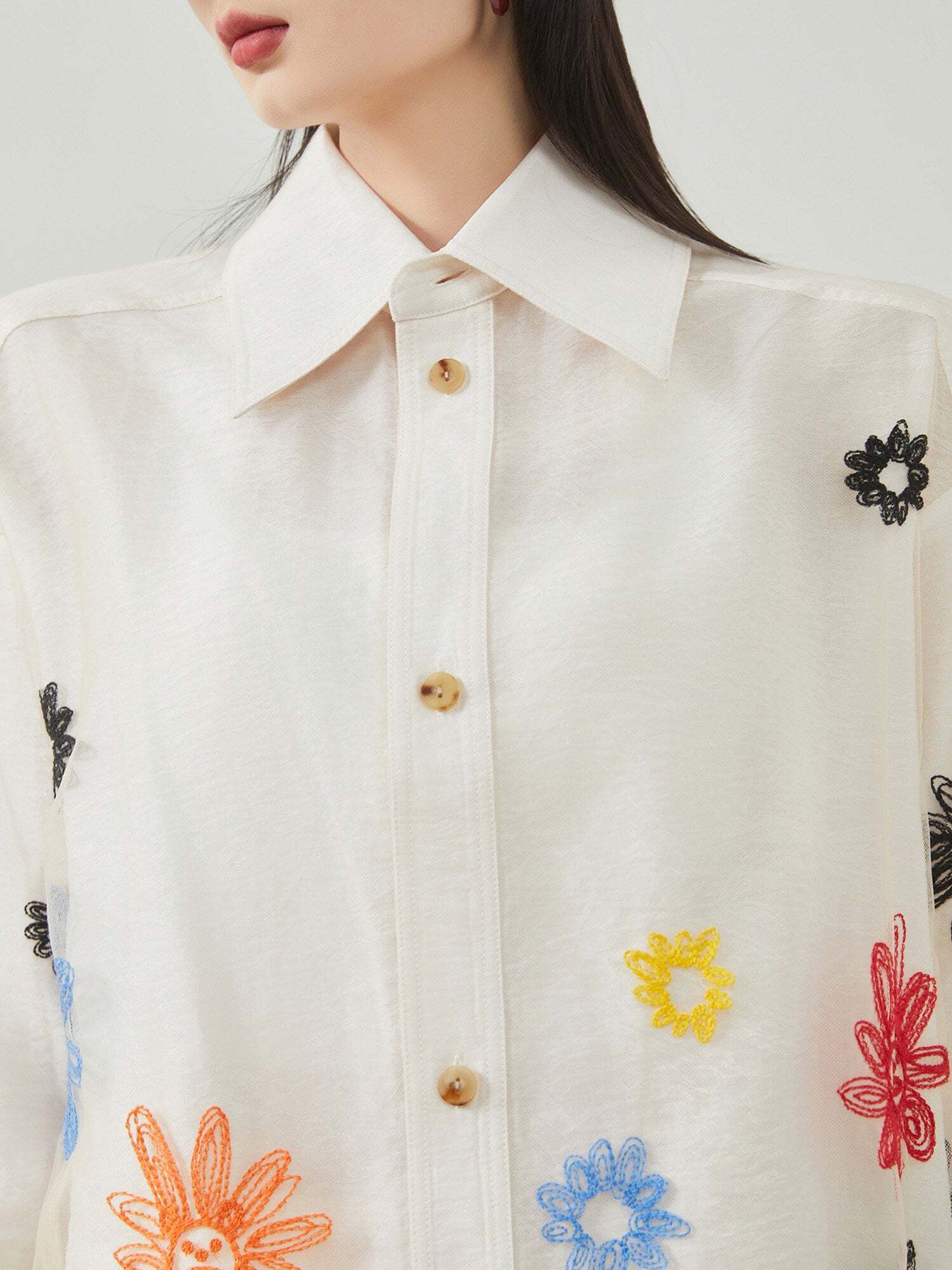 A long-sleeved shirt with colorful flower embroidery, cute for adults.
