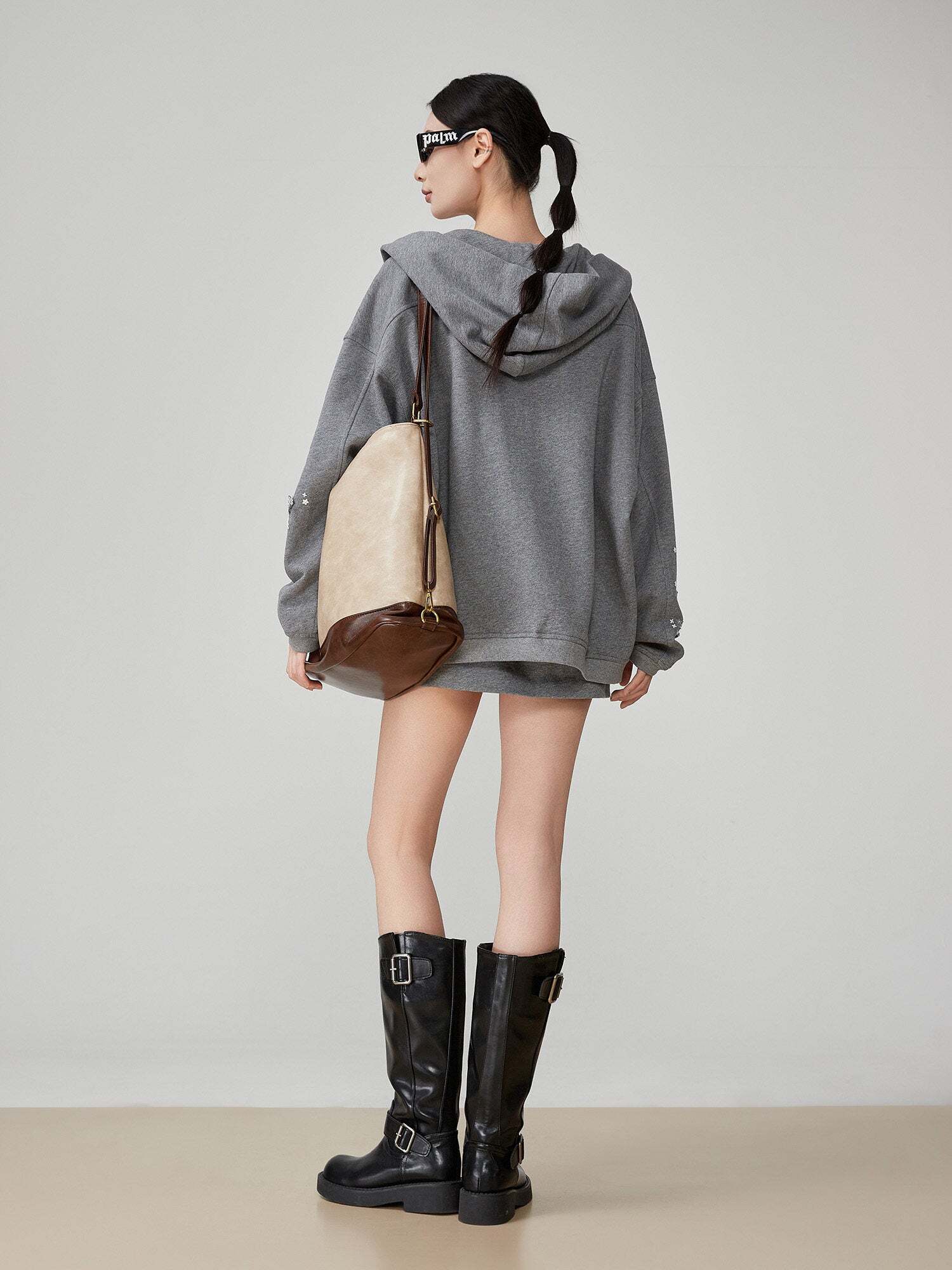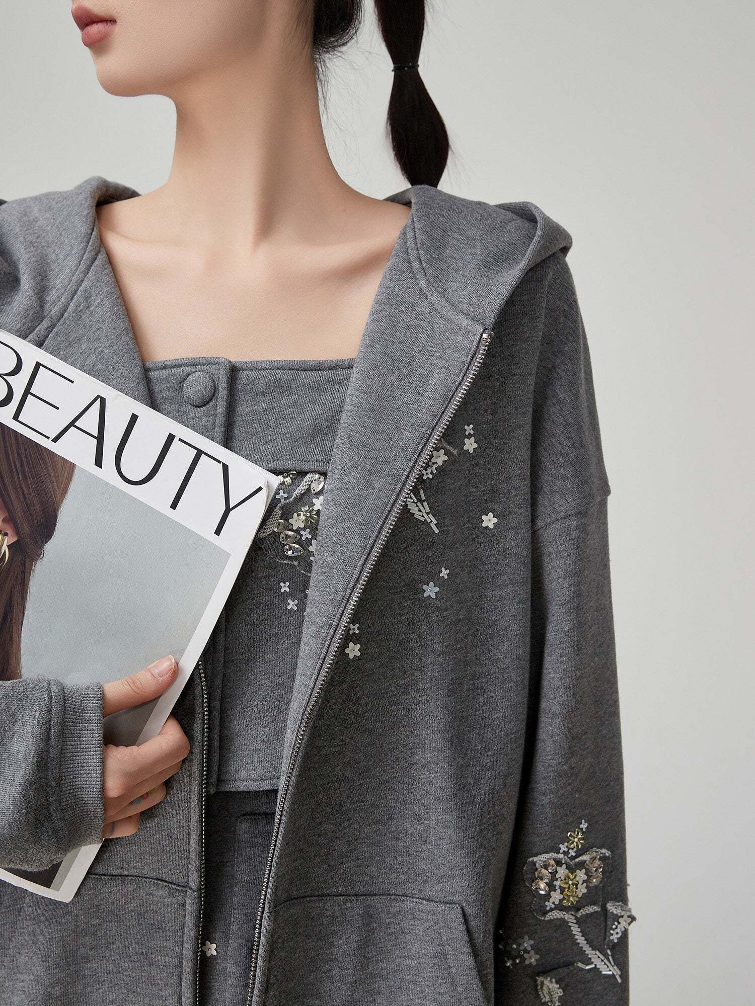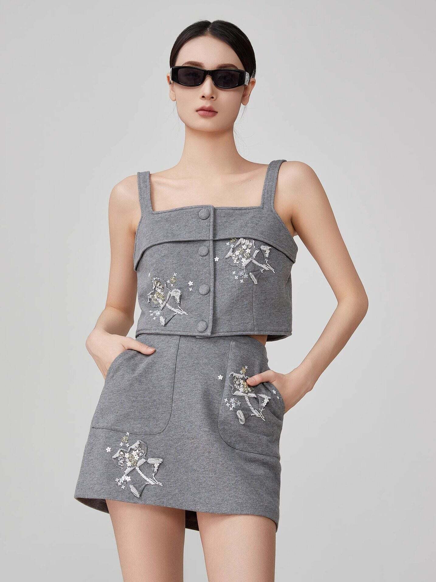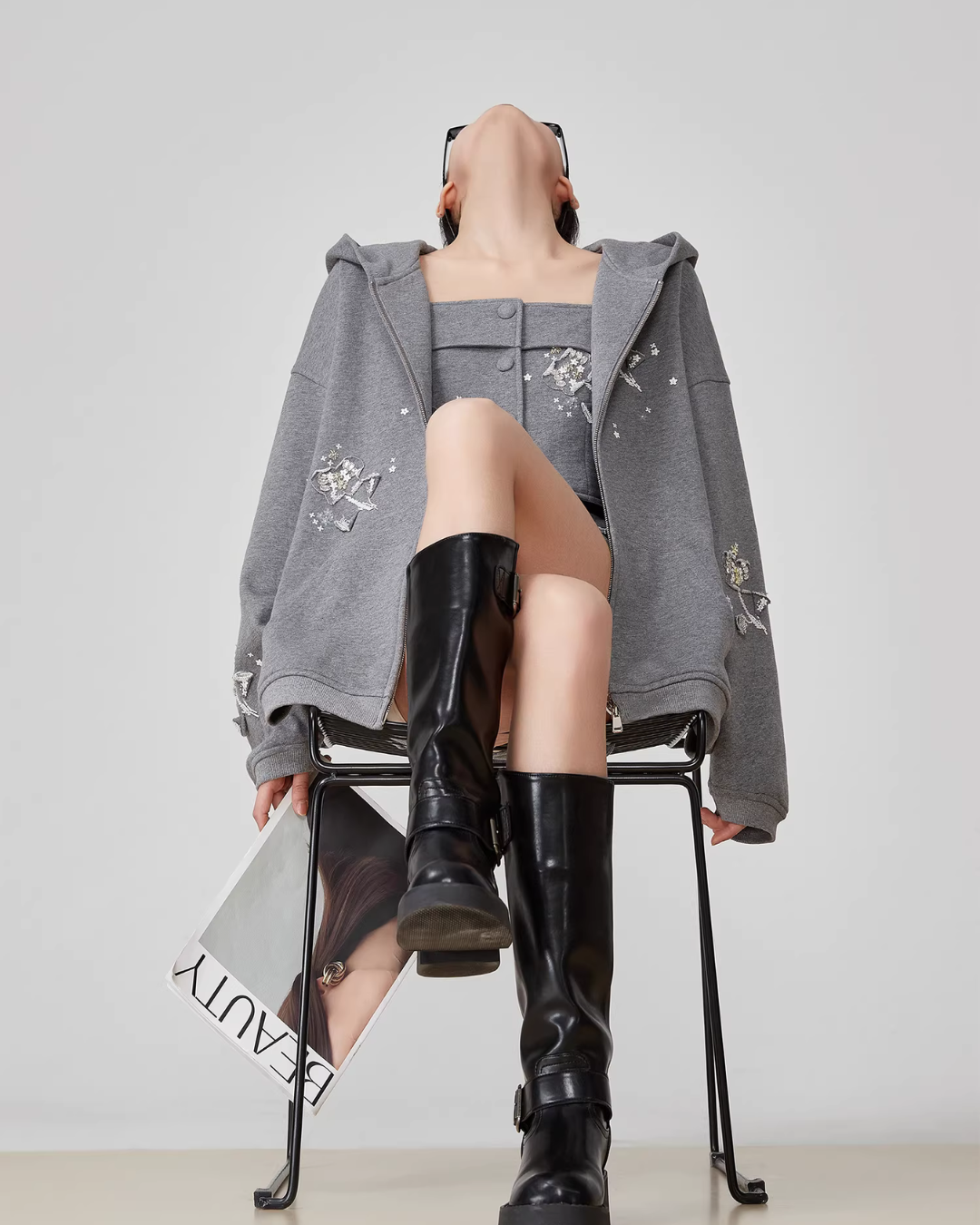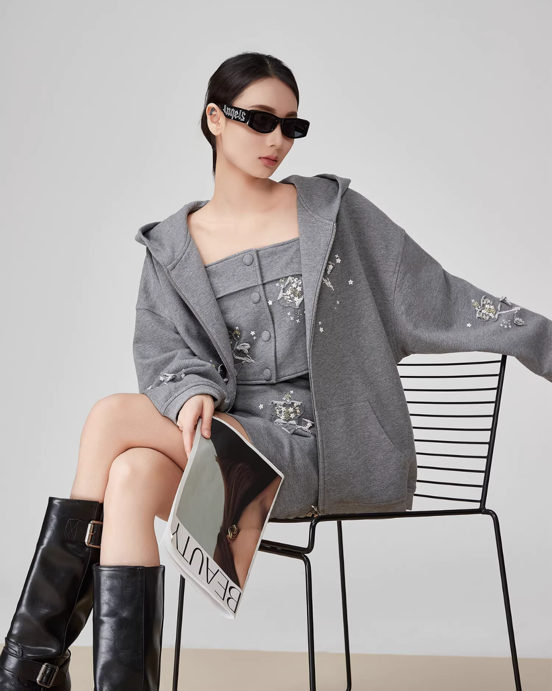 A three-piece set that includes a hoodie, camisole, and skirt, perfect for stylish outfits.