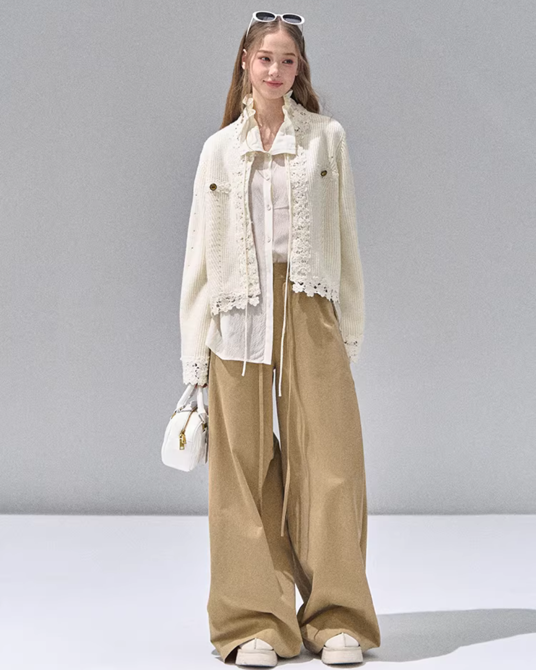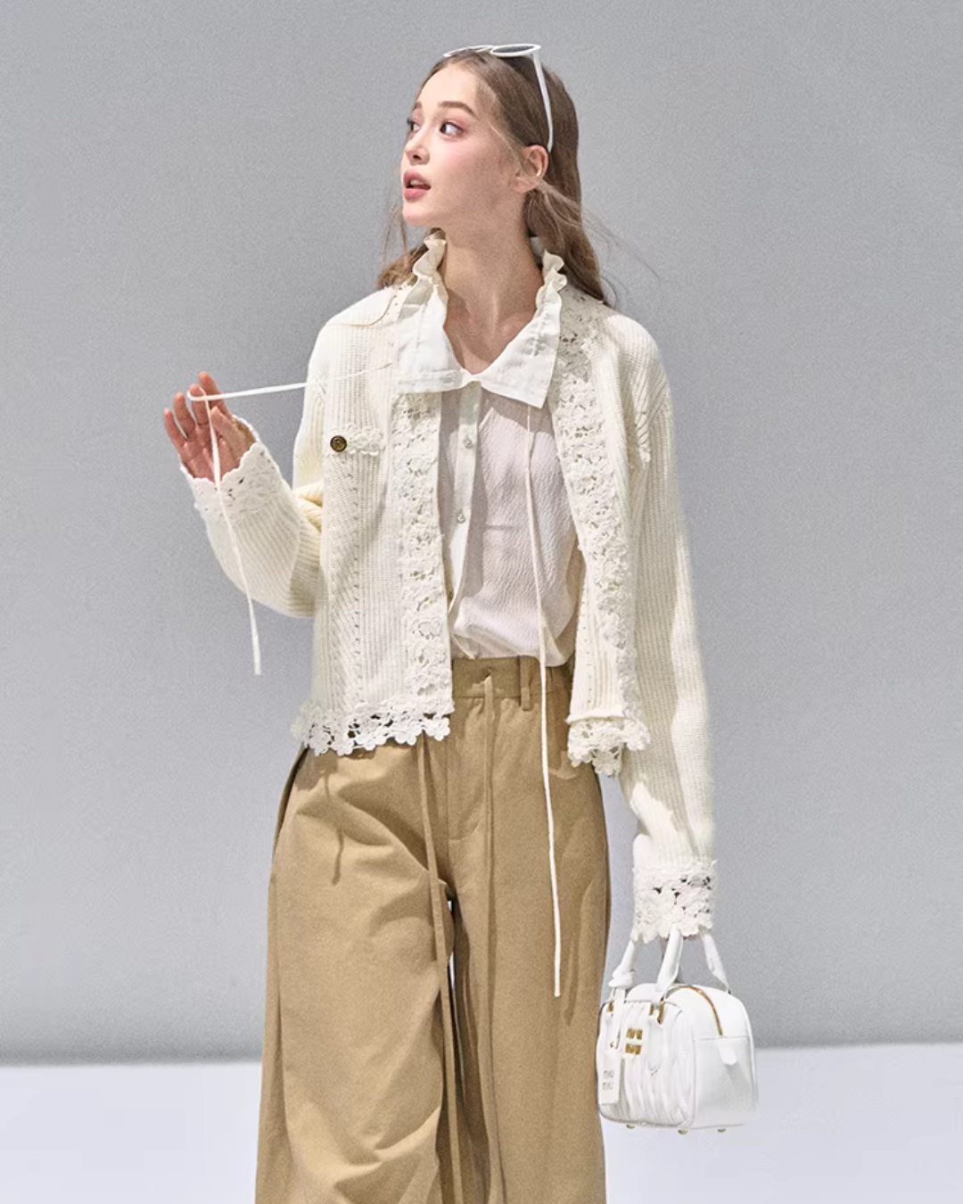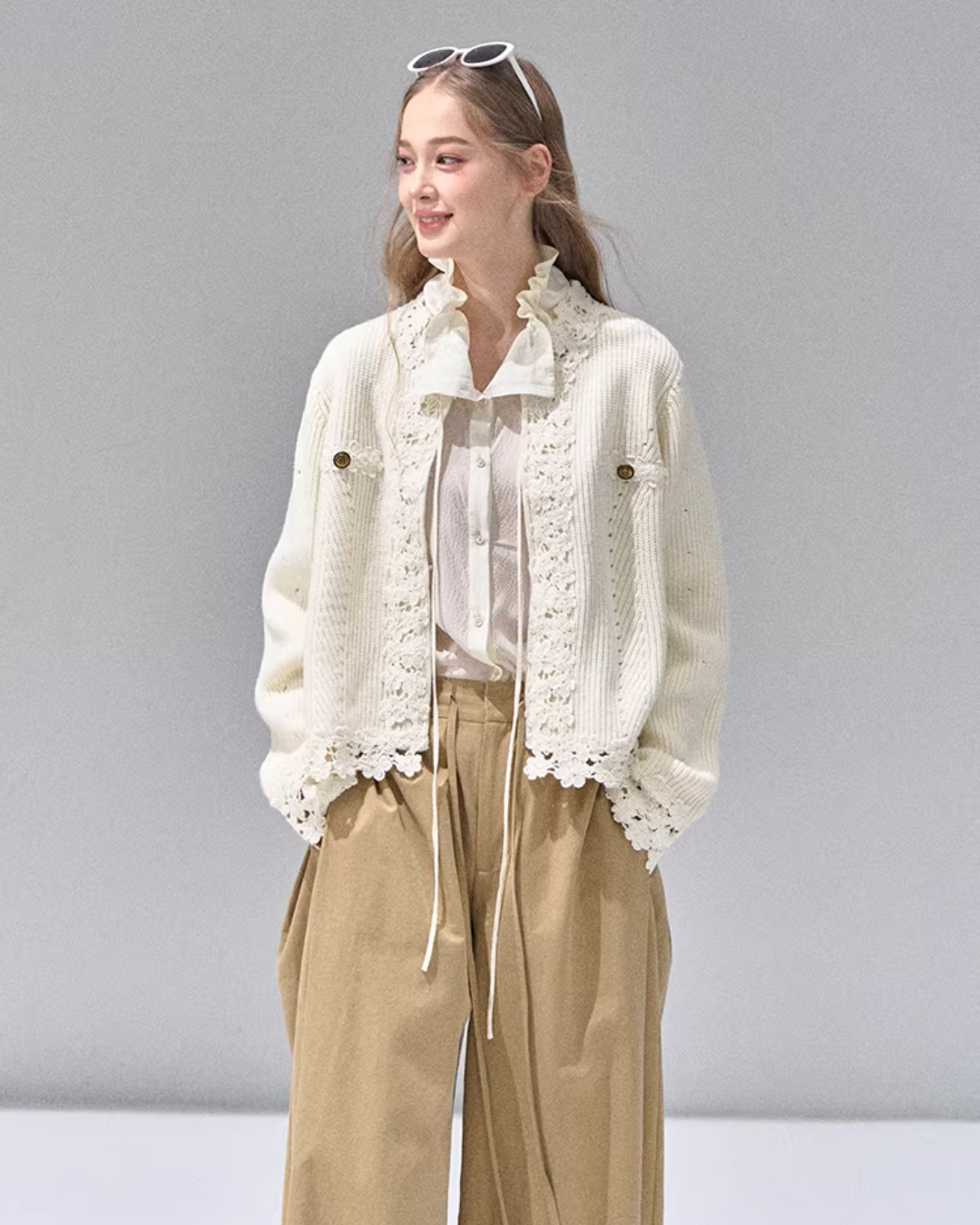 A knit cardigan that exudes a feminine presence with floral lace.