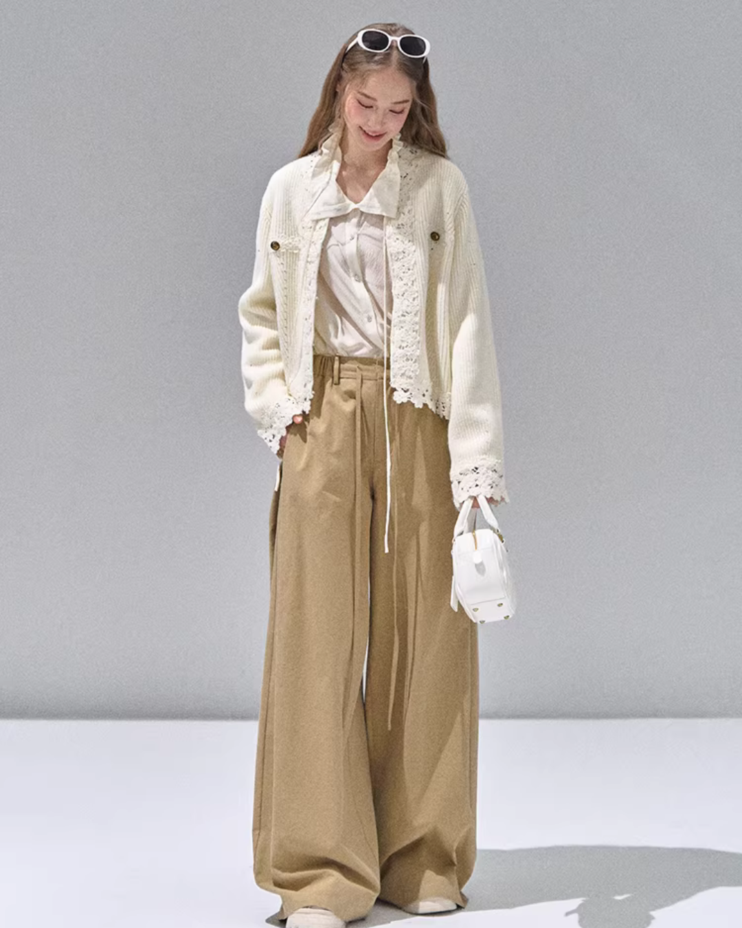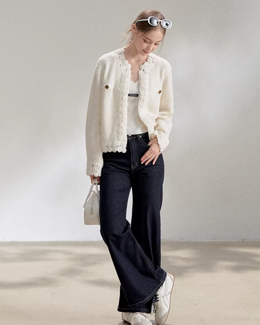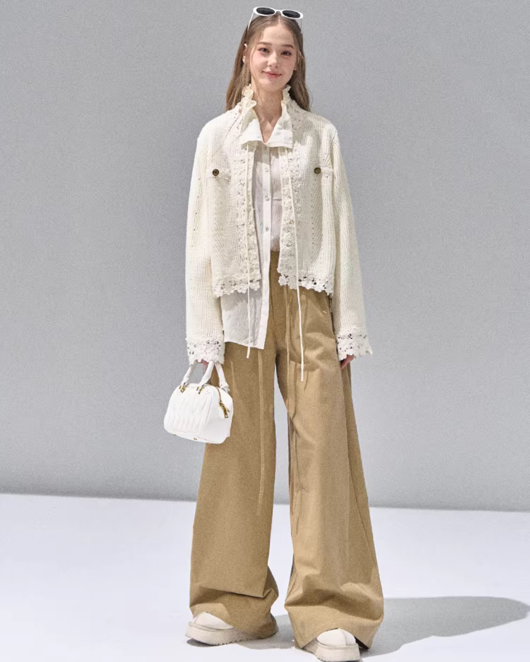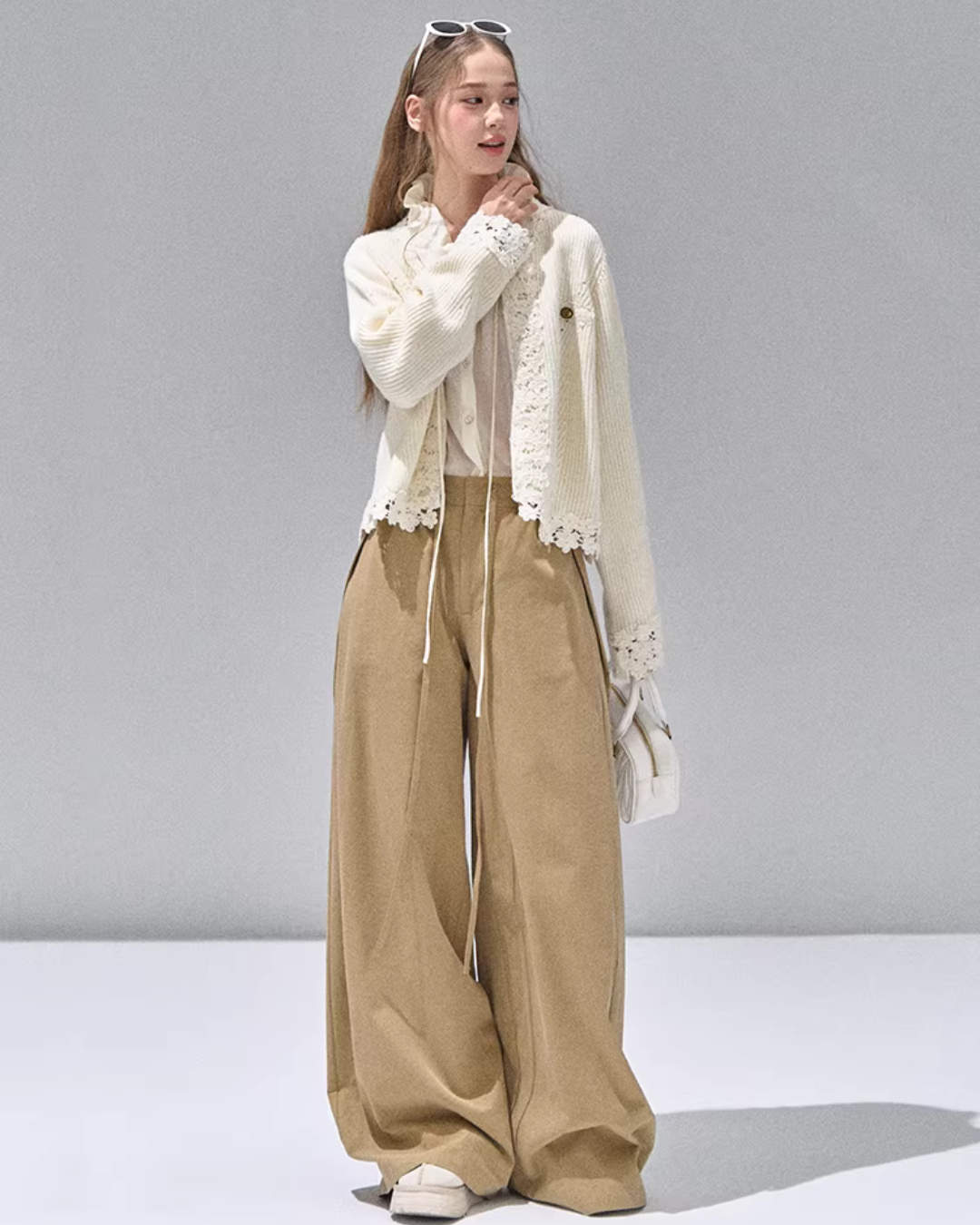 A knit cardigan that exudes a feminine presence with floral lace.